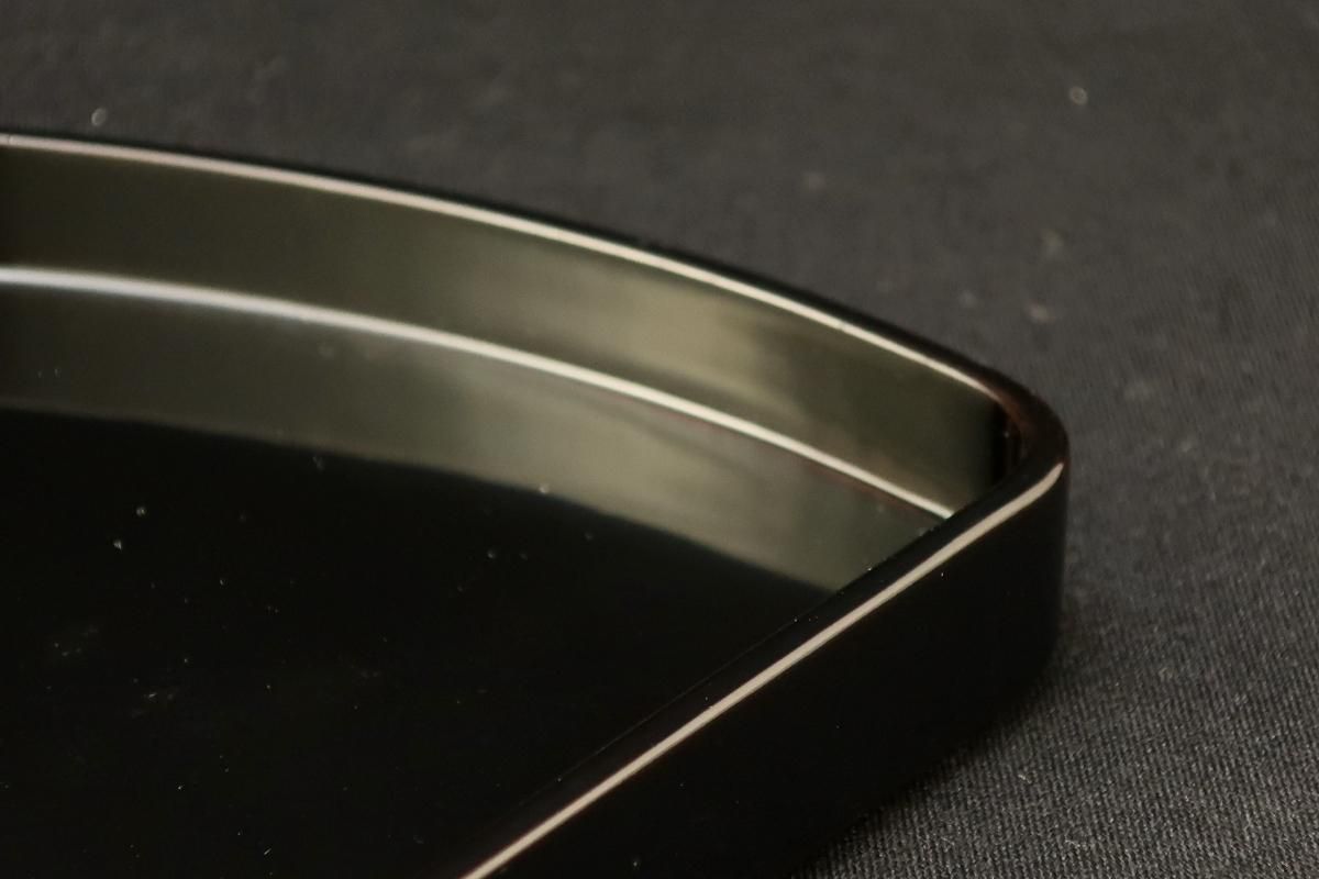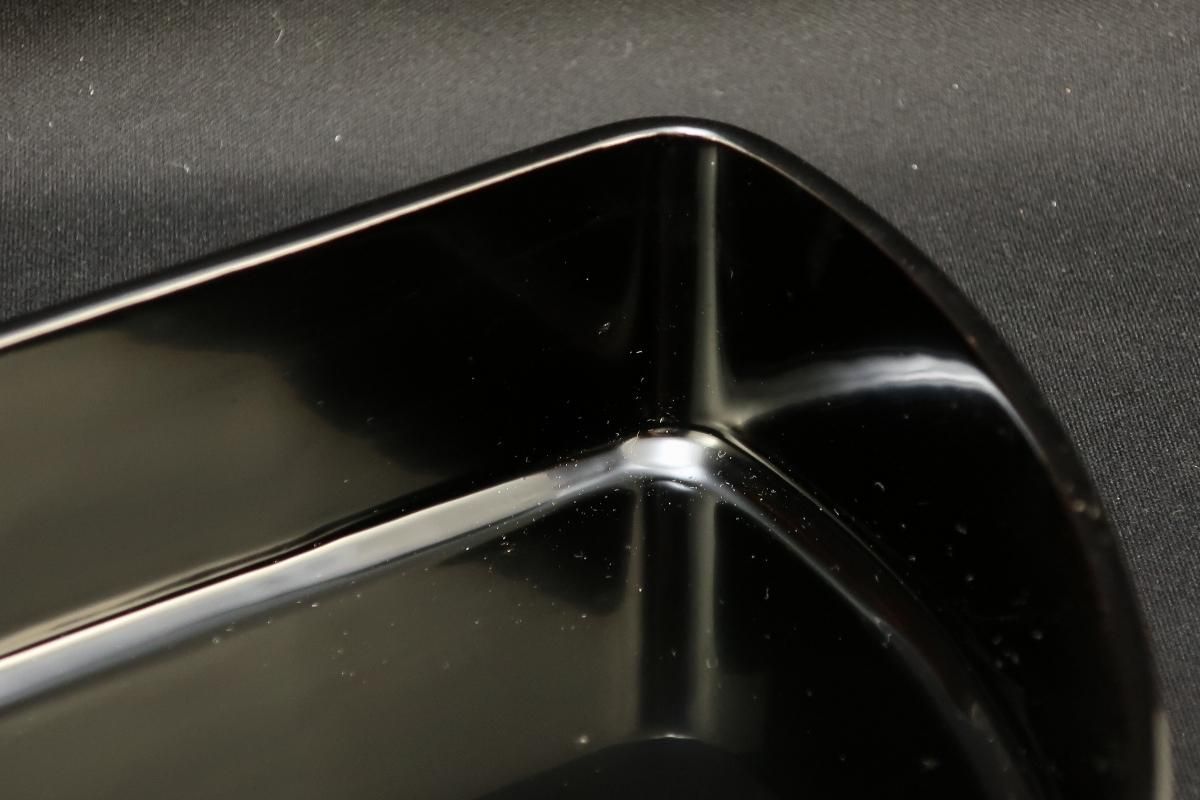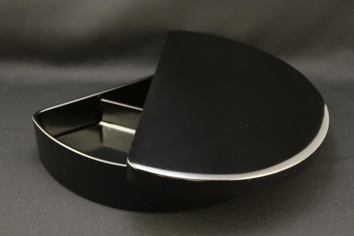 ☆一つ一つ頑丈な和紙に入って出てきました。布着せをして堅く漆をかけた後に、しっとりと艶やかな表面に仕上げられた逸品。落ち着いた漆黒の艶はなかなかお目にかかることはありません。しかもこんな半月形のお弁当で登場!おもてなしに是非ともお使いいただきたいお弁当箱です。