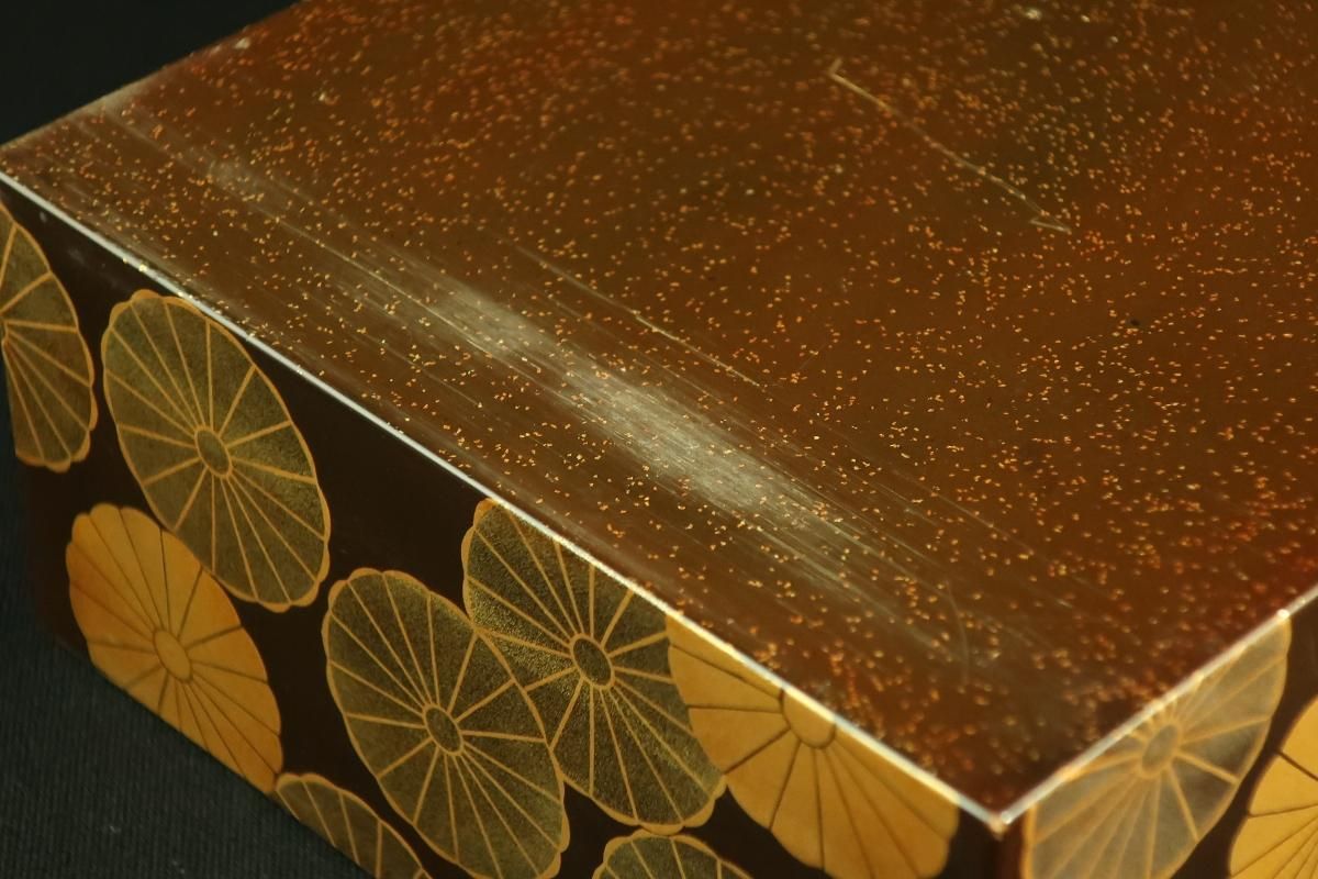 ☆出会ってしまいました・・・。古い時代の菓子箪笥。長い時間をかけて作られた味わい深い色艶の菊の蒔絵とツルツルの梨地。梨地は新しいものほど、ざらざらとしていますが、この菓子箪笥の抽斗の内側の梨地は艶々。菊の蒔絵の金も落ち着いた雰囲気の色になっています。抽斗の箱側面全体に蒔絵が施されているのにはびっくり。このまま一箱ずつお菓子器として使えちゃうんですね〜。お茶席でこんな素敵な菓子器が出てきたら感涙もの♡ お茶席だけでなく、テーブルでのティータイムでも(^^)v