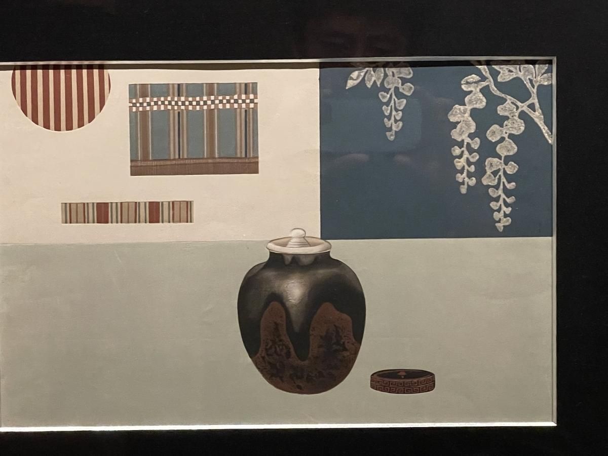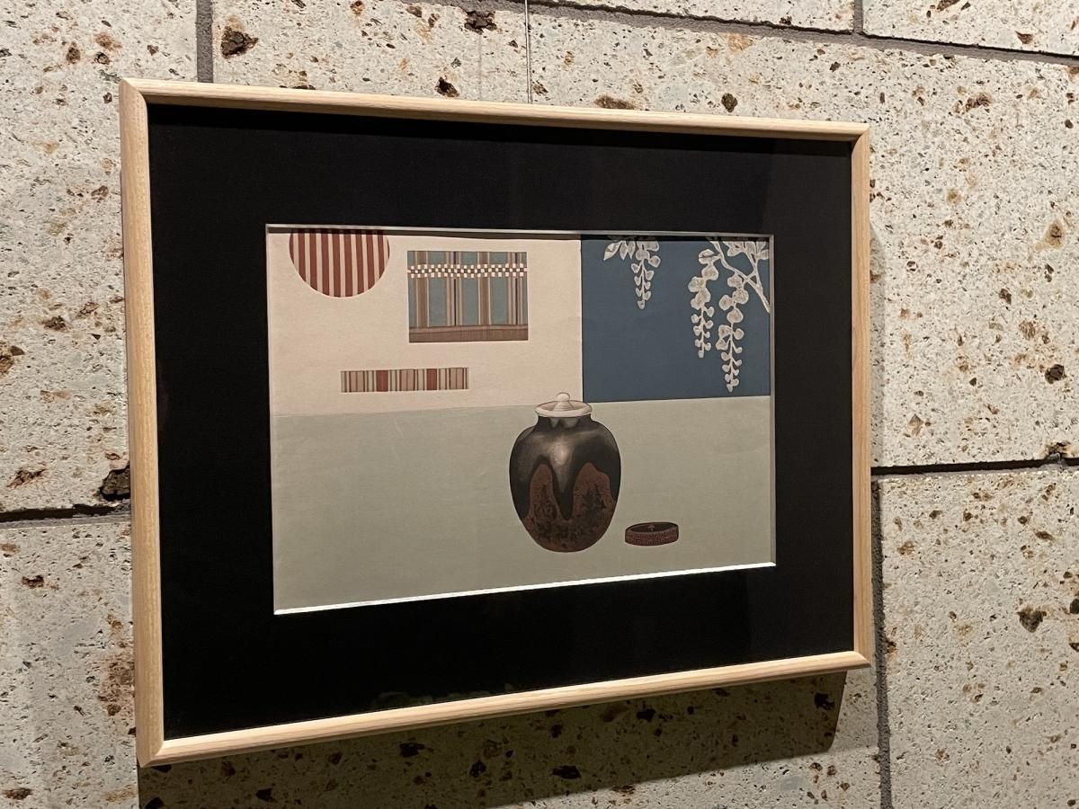 ☆状態の綺麗な木版画を額装。茶入を中心とした構図や色彩はまるでモダンアートのよう。日本人のセンスの良さが詰まった美しい木版画です。