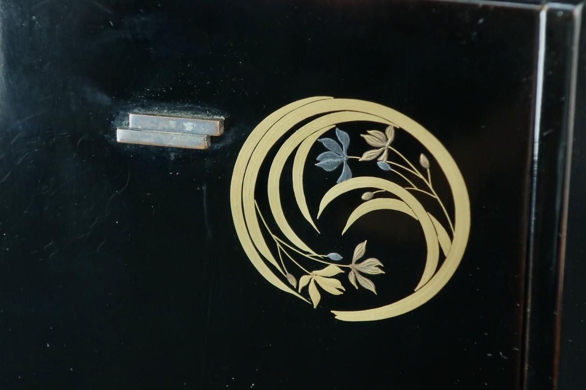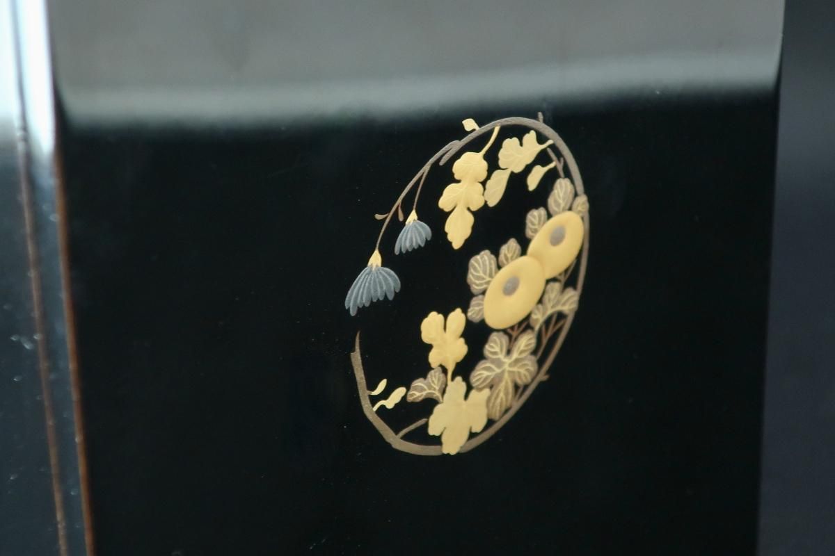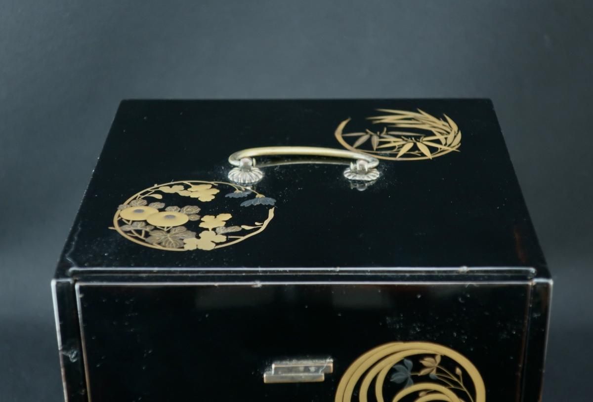 ☆漆黒に浮かび上がる四君子の丸紋の蒔絵がとても洗練された雰囲気の菓子箪笥。抽斗に色とりどりのお干菓子を並べて使ったら、きっとお洒落なティータイムとなることでしょう。菓子器としてだけはなく、アクセサリー入れなどに使っても素敵ですね。