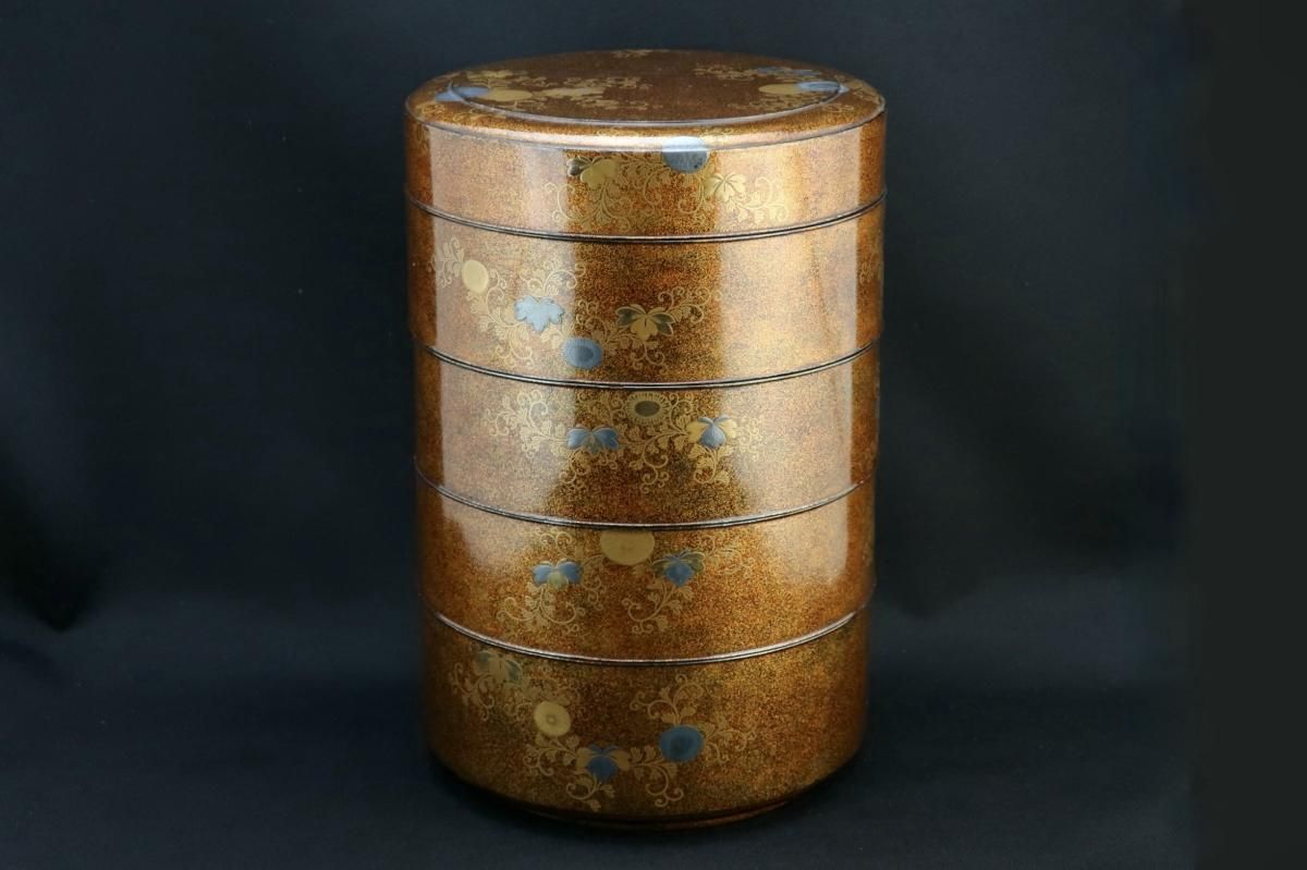 梨地内朱草花蒔絵丸重箱 / Round 'Jubako' Food Boxes with 'makie' picture of Flowers
