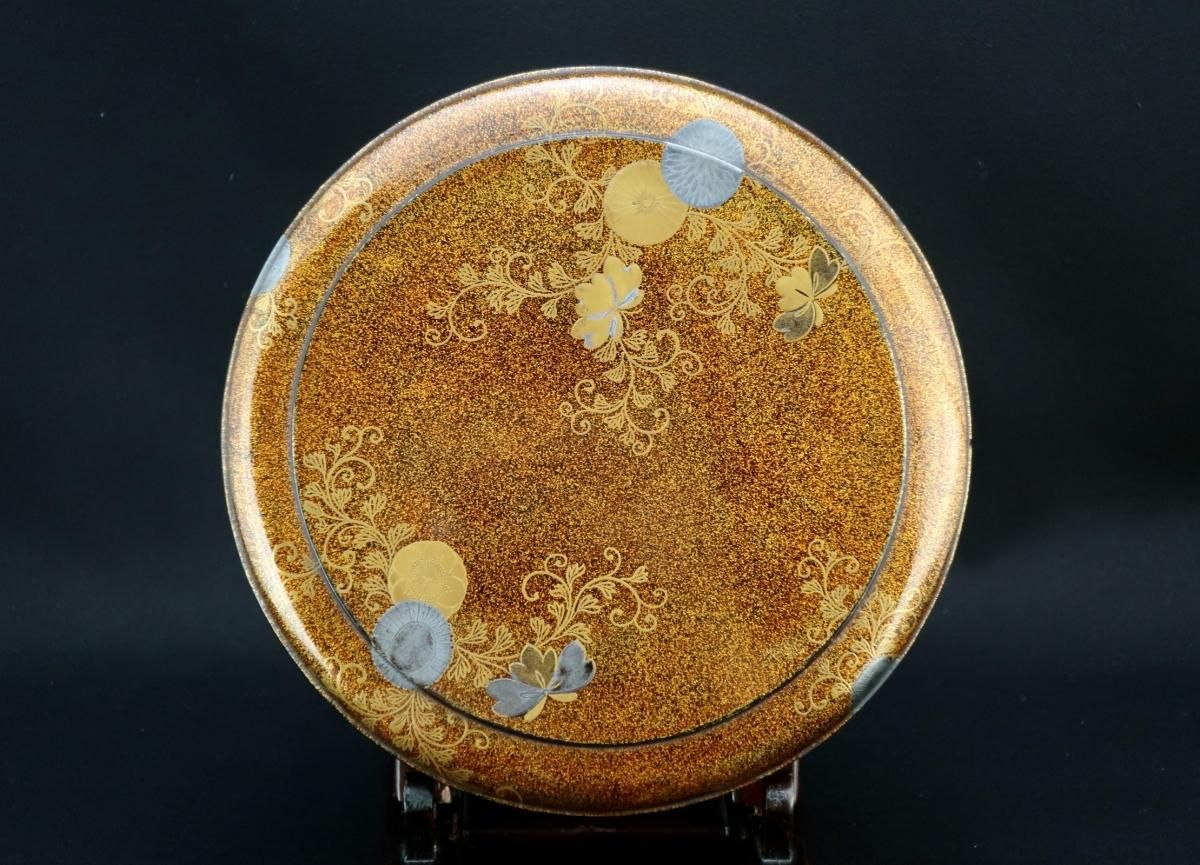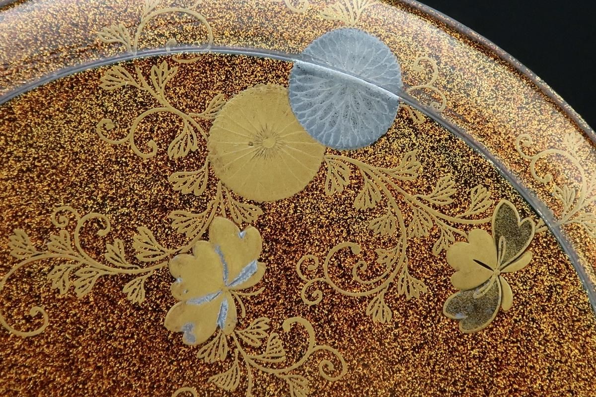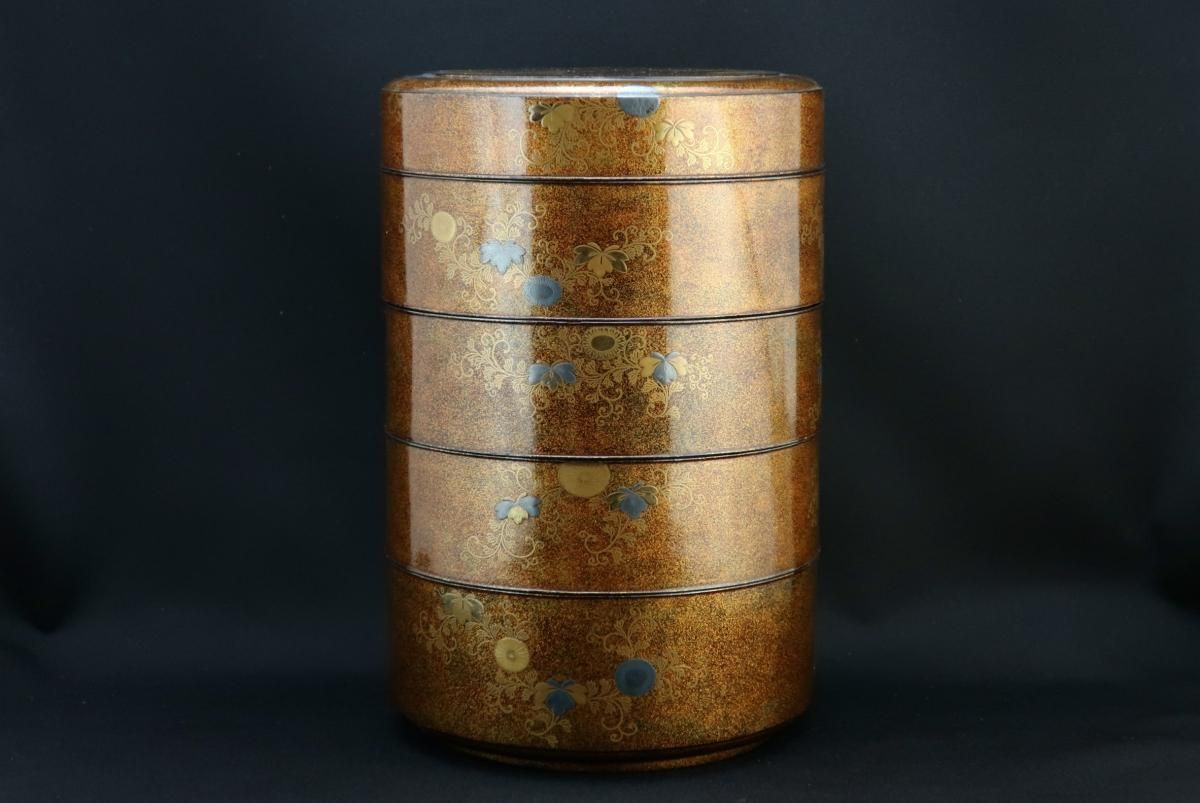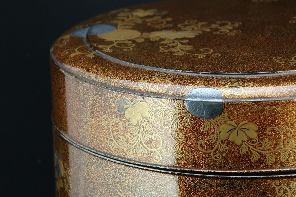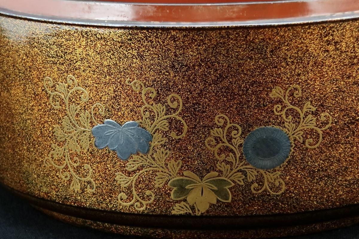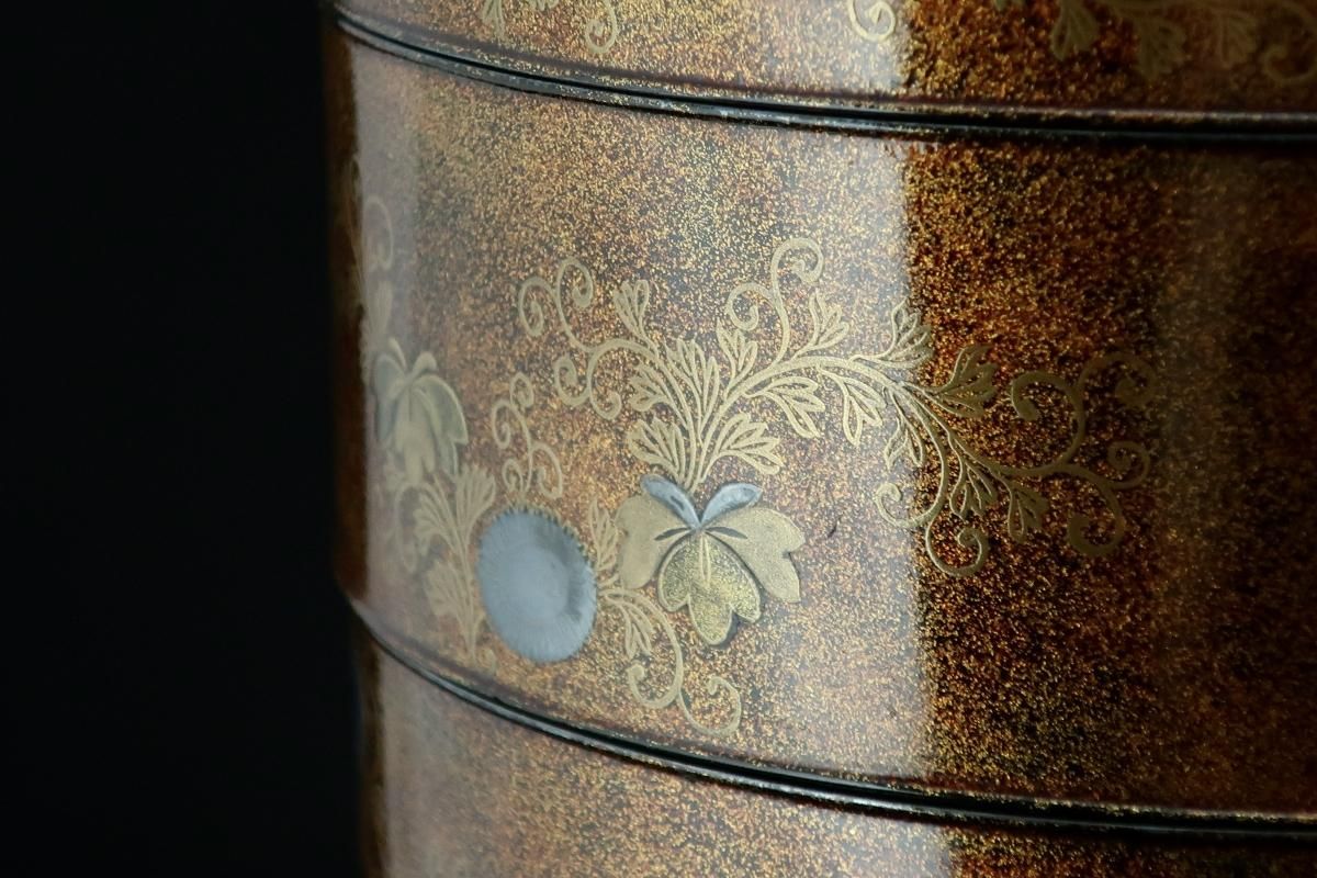 ☆江戸蒔絵のしっとりとした美しさはこの時代特有のもの。豪華な梨地に金銀の菊や桐、梅の花の蒔絵がバランス良く描かれています。裕福な家より、同じ蒔絵の鏡台や、衣桁などを作らせて婚礼用に持たせたセットの一部でしょう。当時の職人技には驚くばかり。梨地の表面は平滑で落ち着いた輝きを放っています。使用はもちろん、観賞用としても楽しめる丸重箱。新年の室礼に飾っても素敵ですね。
