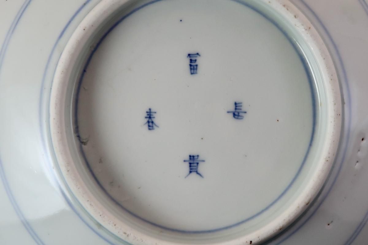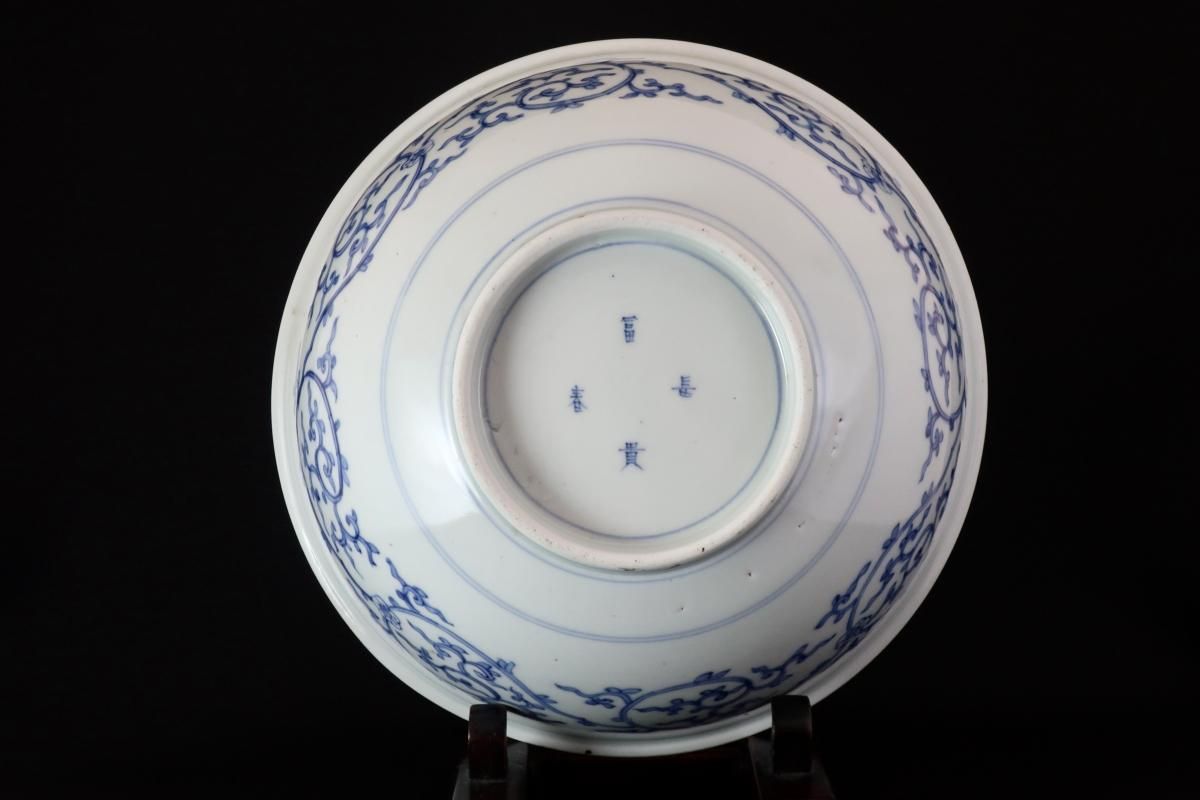☆菊と尾長鶏の絵付けが優雅な大鉢。見込みは登竜門。縁までも細かな絵付けが施され、細い高台から伸び上がったような姿に格調高さを感じます。外側はシンプルな蛸唐草文様。内と外とのギャップも面白いですね。