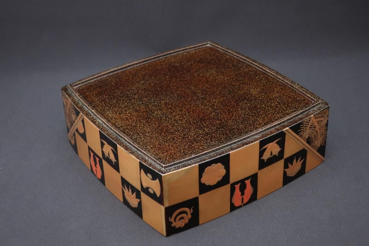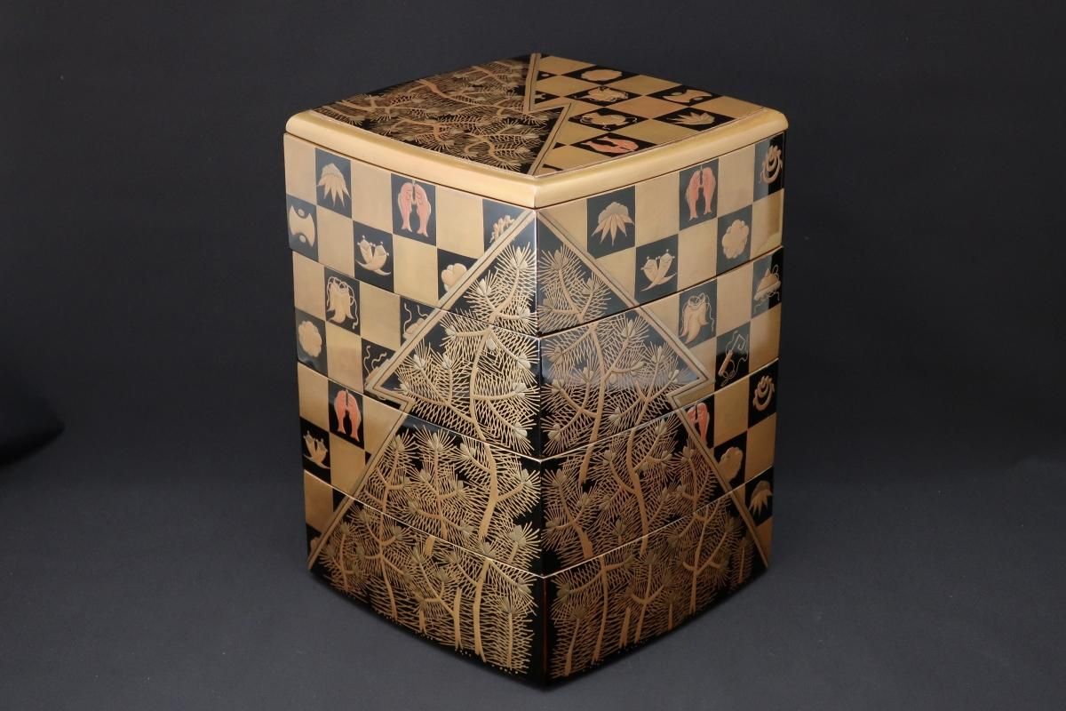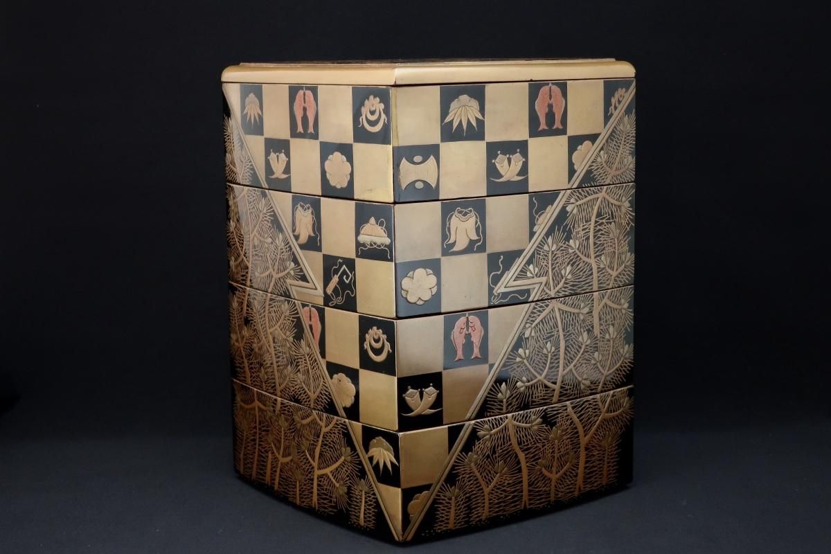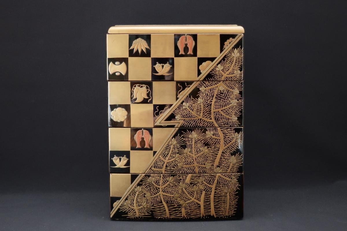 ☆古い時代の重箱は大きいものが多く、現代でも気軽に楽しめるものが少ないのが悩みどころ。ようやく入荷の小さめ重箱。小さいけれど、蒔絵の賑やかさやデザインはピカイチの美しい重箱です。吉祥文のモチーフ満載で松も綺麗に描かれています。せっかく準備するおせち、是非宝箱のような重箱に詰めてあげてください。もちろんおせち以外にも!!