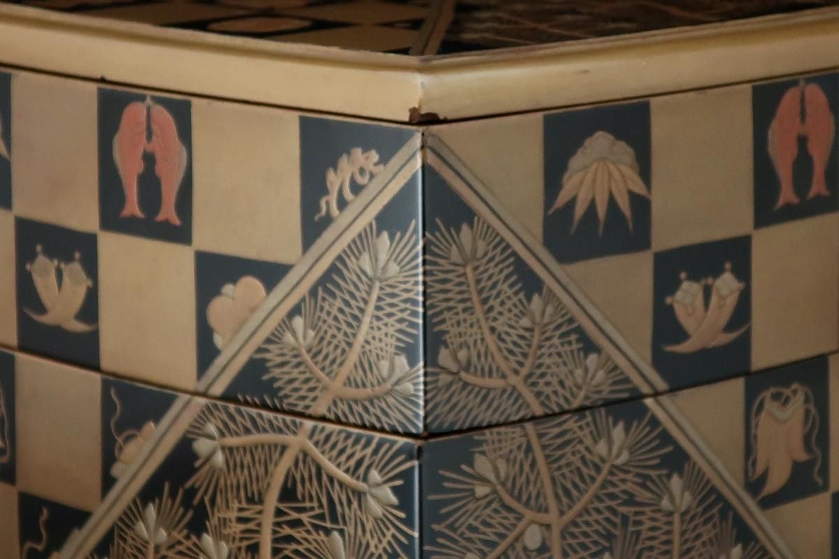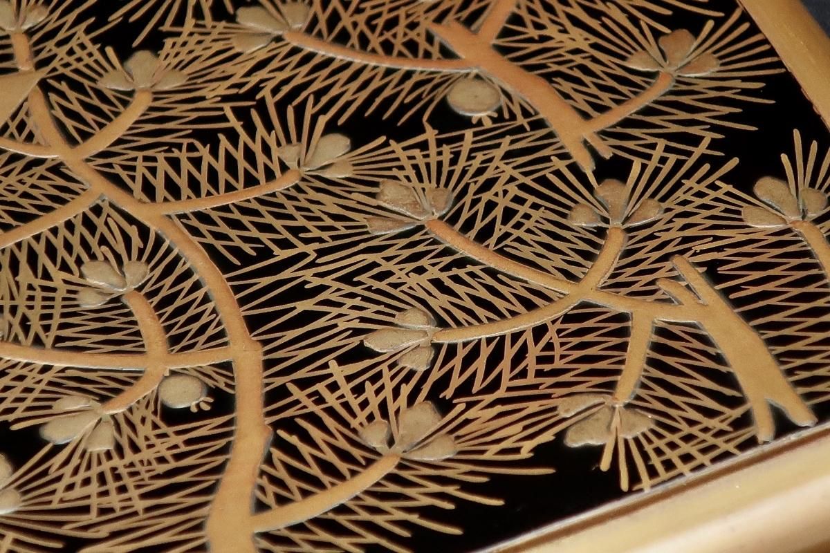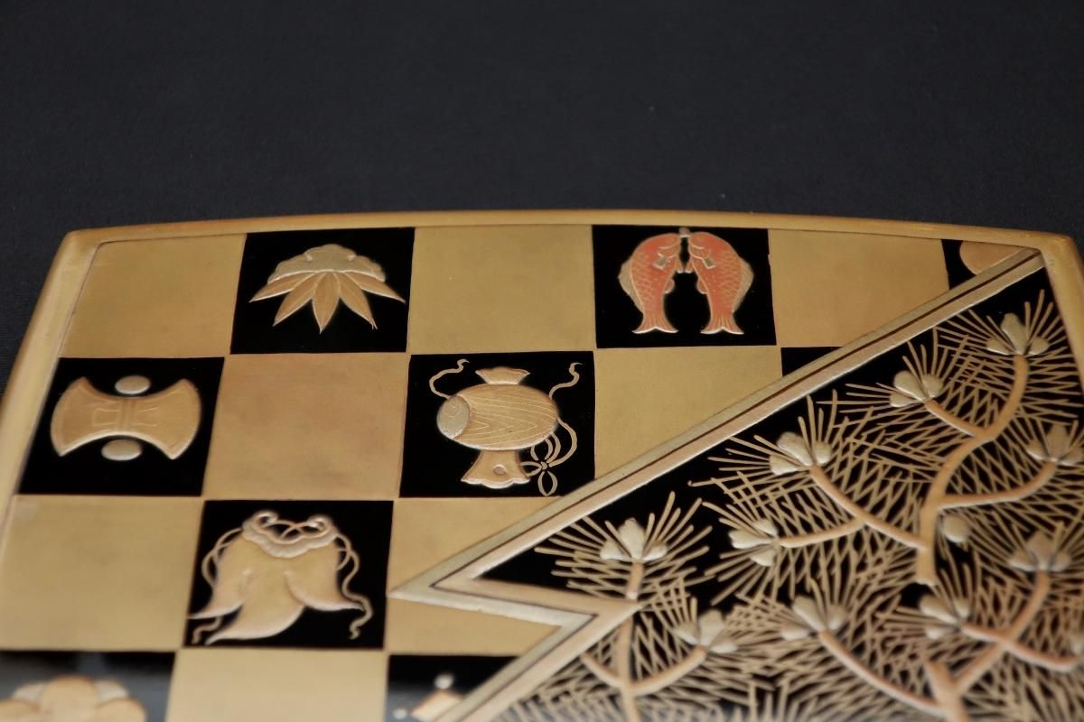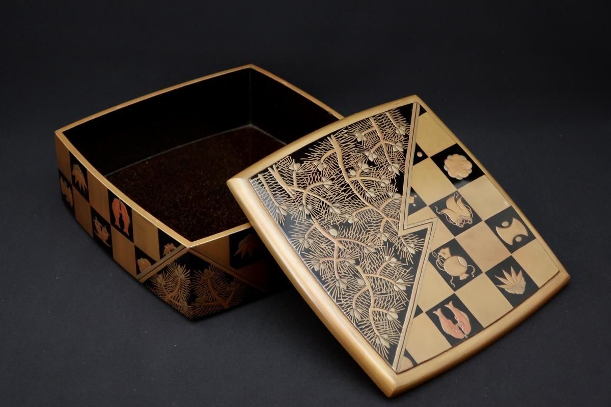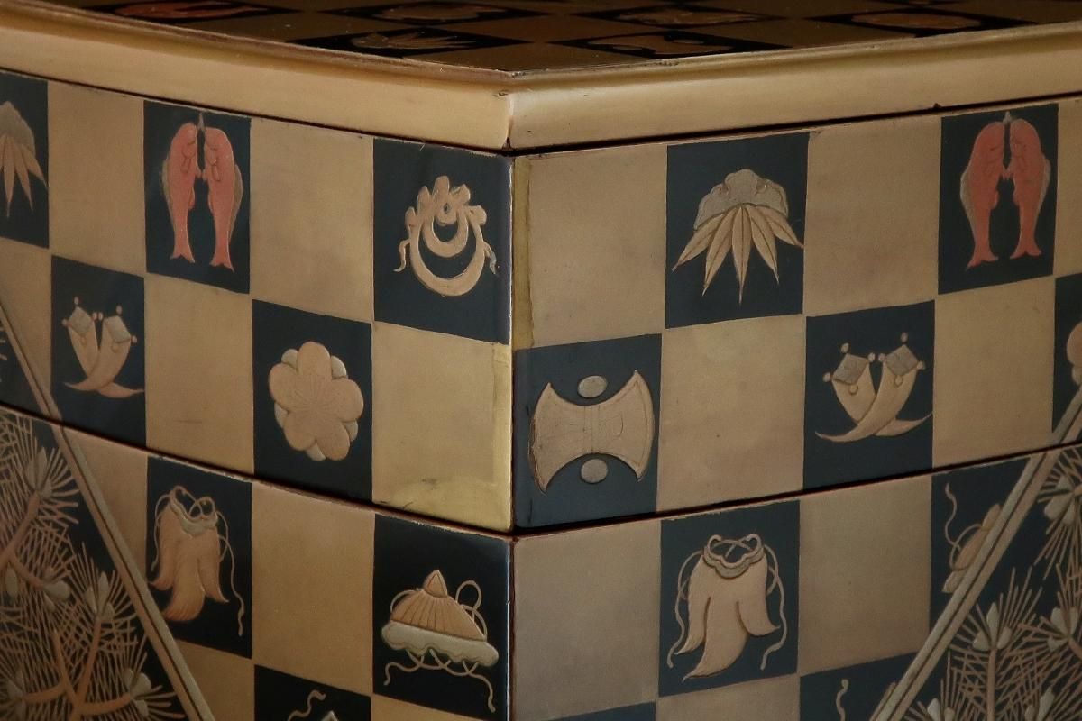 ☆古い時代の重箱は大きいものが多く、現代でも気軽に楽しめるものが少ないのが悩みどころ。ようやく入荷の小さめ重箱。小さいけれど、蒔絵の賑やかさやデザインはピカイチの美しい重箱です。吉祥文のモチーフ満載で松も綺麗に描かれています。せっかく準備するおせち、是非宝箱のような重箱に詰めてあげてください。もちろんおせち以外にも!!