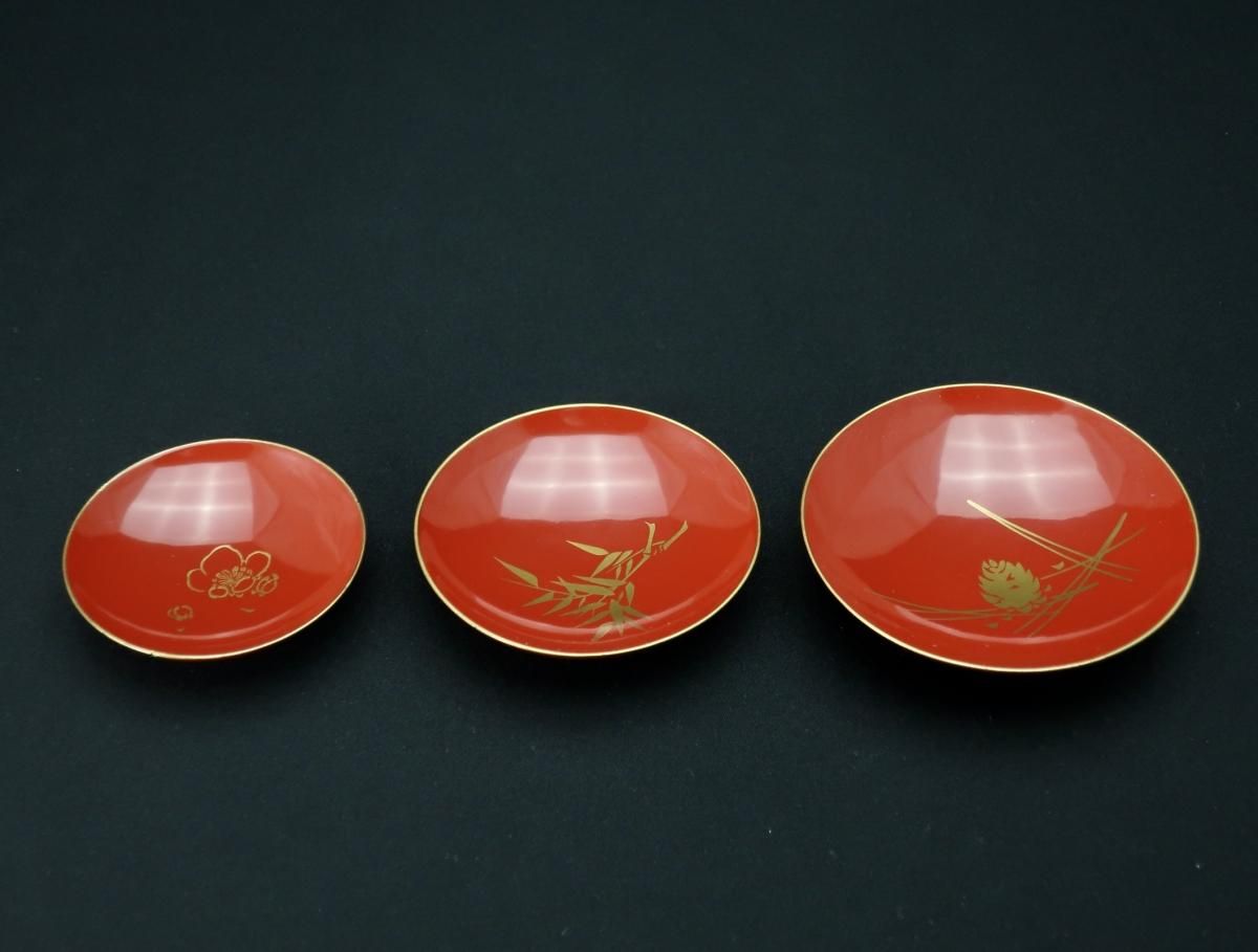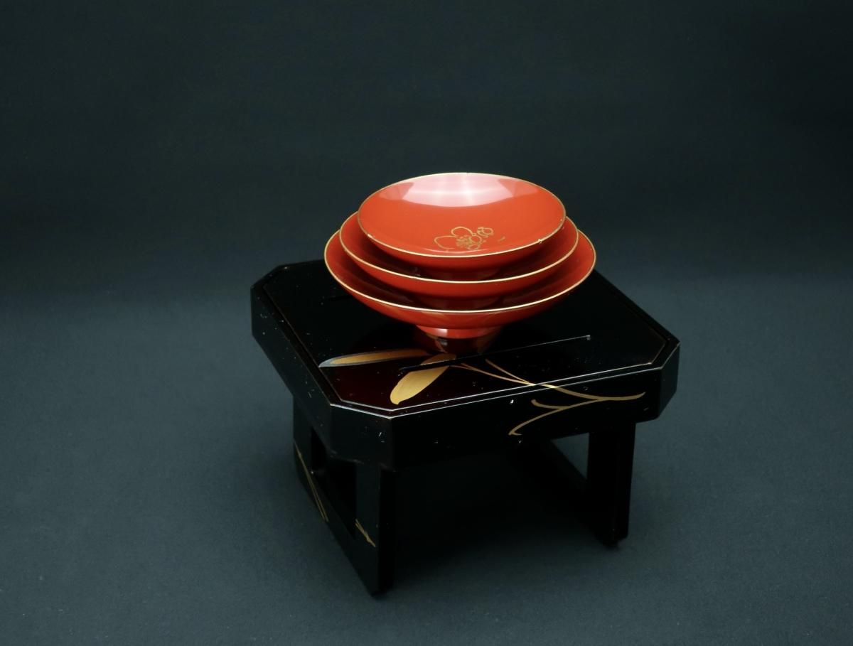 ☆黒塗の盃台の裏底や、一番小さい朱塗の盃に修復跡があります。また、他にも擦れ跡や僅かな使用傷等ございます。古い時代の中古の品であることをご理解お願い致します。