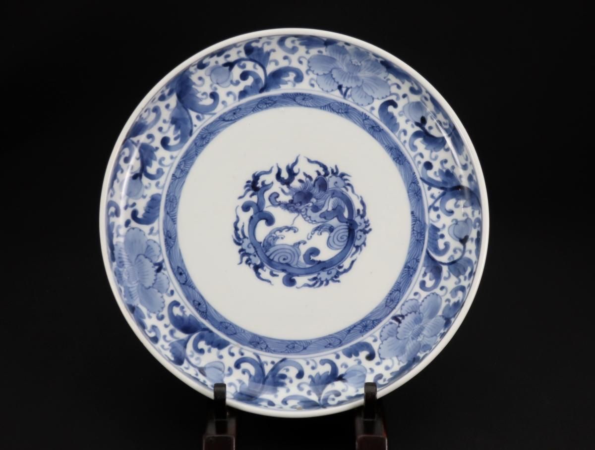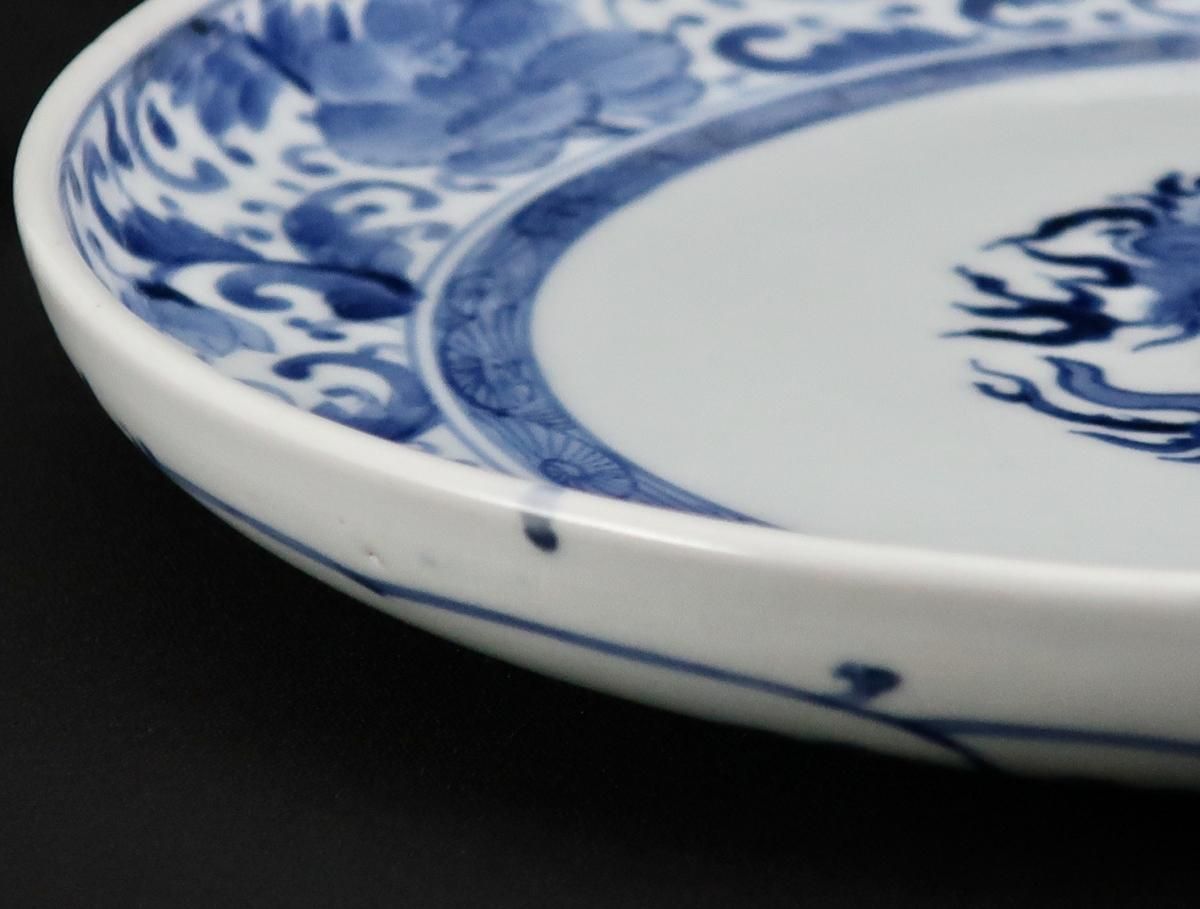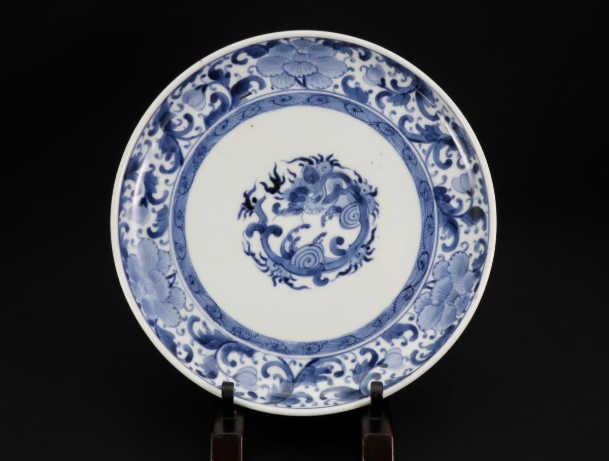 ☆見込みの龍の表情といい、蕾も一緒に描かれた牡丹の花と唐草の文様が美しいちょっと大きめの七寸皿。呉須も良い色が出ています。細かな花唐草文様も綺麗ですが、こんなダイナミックな絵柄もインパクトがあって、テーブルの印象をキリッと引き締めてくれます。料理を盛るともっと素敵な表情に変身してくれることでしょう。古伊万里の力が感じられる染付皿は1セットあると重宝しますよ。