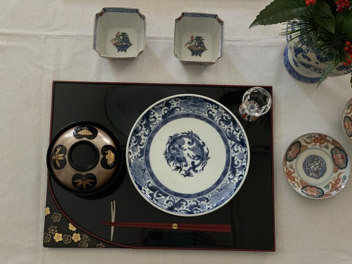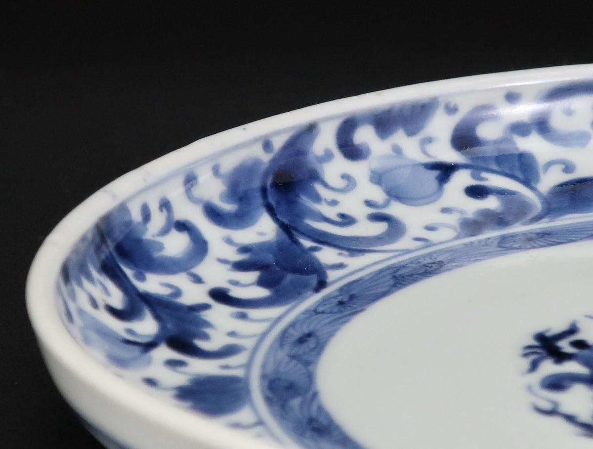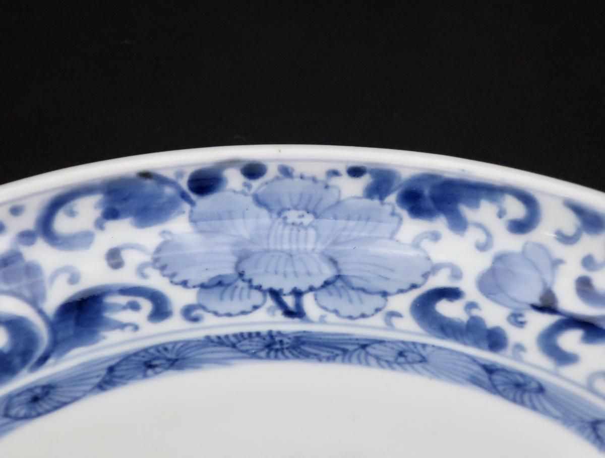 ☆見込みの龍の表情といい、蕾も一緒に描かれた牡丹の花と唐草の文様が美しいちょっと大きめの七寸皿。呉須も良い色が出ています。細かな花唐草文様も綺麗ですが、こんなダイナミックな絵柄もインパクトがあって、テーブルの印象をキリッと引き締めてくれます。料理を盛るともっと素敵な表情に変身してくれることでしょう。古伊万里の力が感じられる染付皿は1セットあると重宝しますよ。
