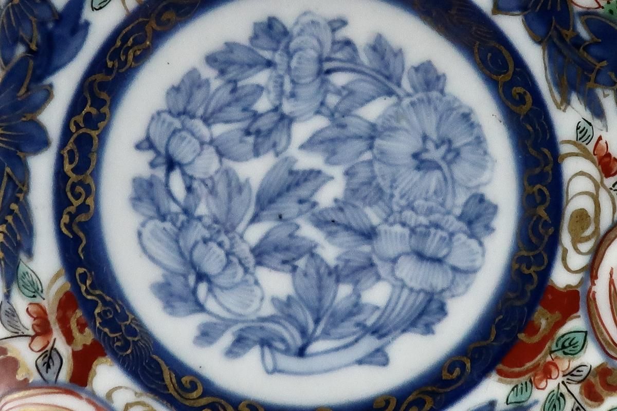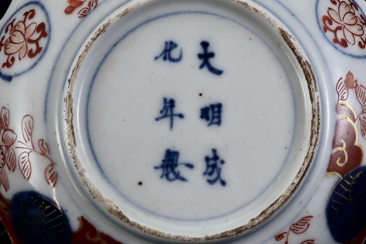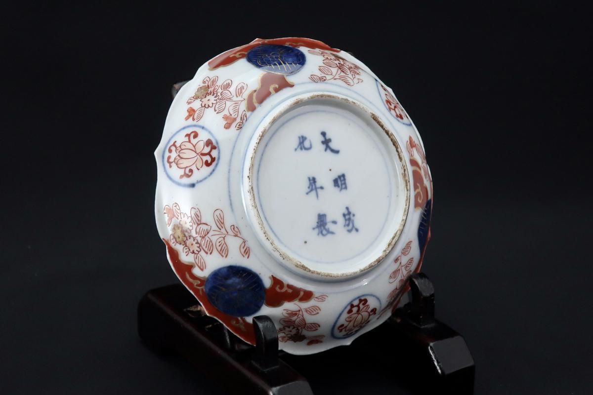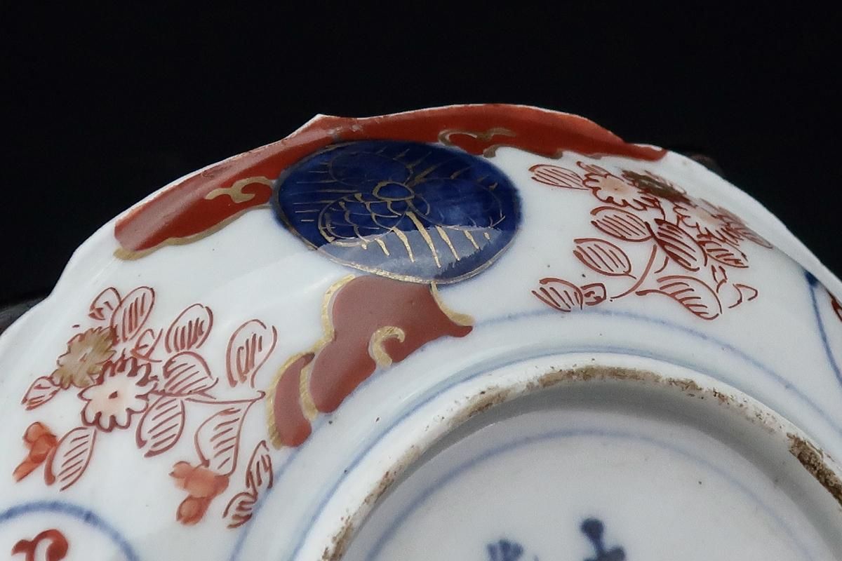 ☆裏も表もびっしりと赤丸を中心に描かれた繊細な絵付けが見られる四寸皿。薄手で軽やかな仕上がりと縁の装飾のデザインに陶工さんの高い技術を感じられます。今回なます皿も同時に出て来ているので元は豪華な通りもので七寸や六寸サイズの皿もあったのかもしれません。古い木箱に入って出てきましたが、残念な事にその多くが使用による傷が見られました。