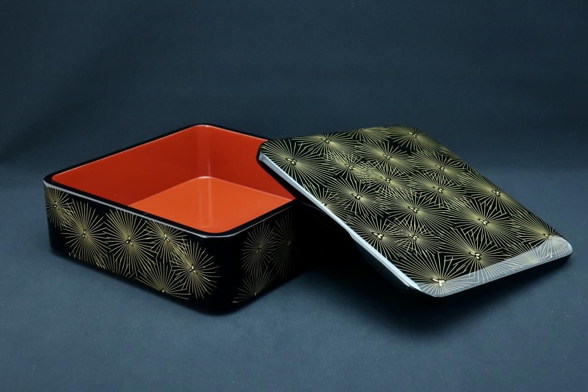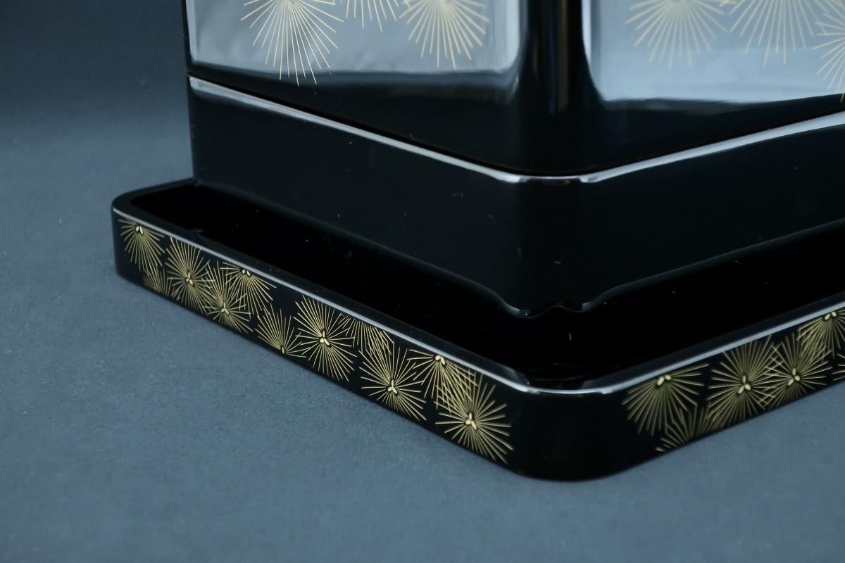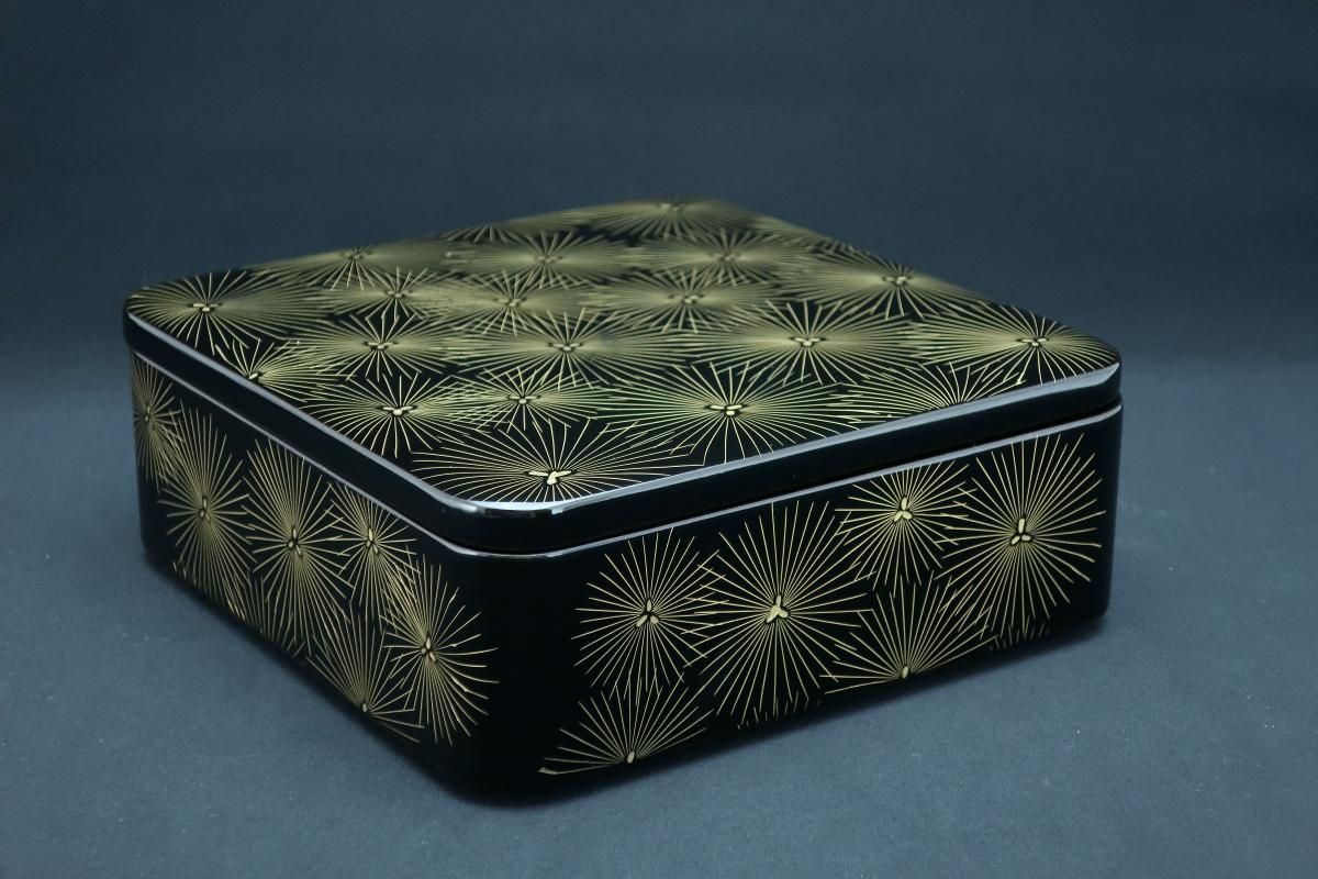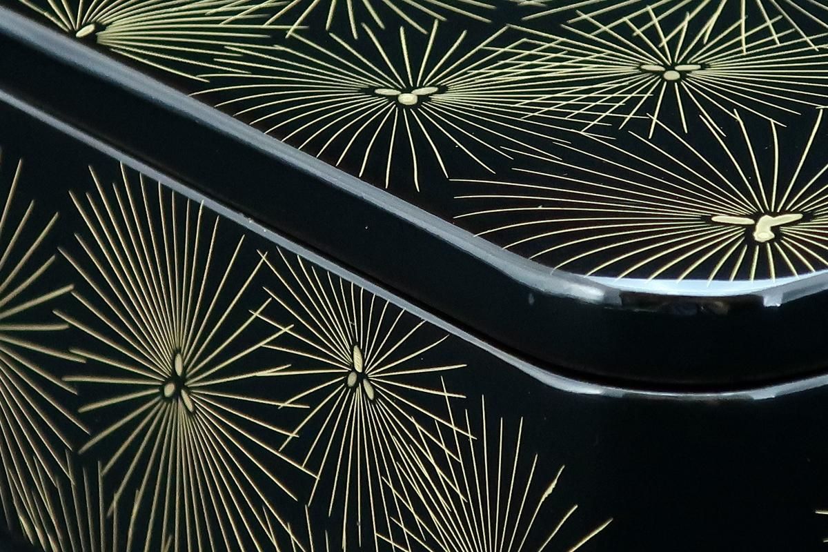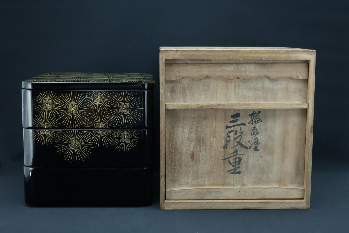 ☆古いものではありません。ほど未使用かと思われる松葉の蒔絵が綺麗な重箱。シンプルだけど輪島の蒔絵師さんのセンスが伝わるすっきりとしたデザインが魅力的です。おせちだけでなく幅広く楽しめそうですね。