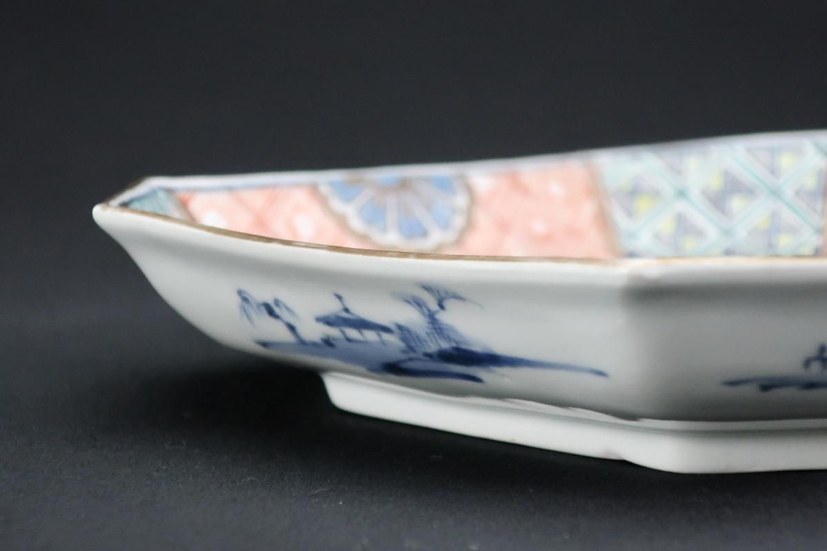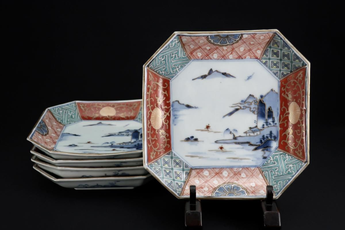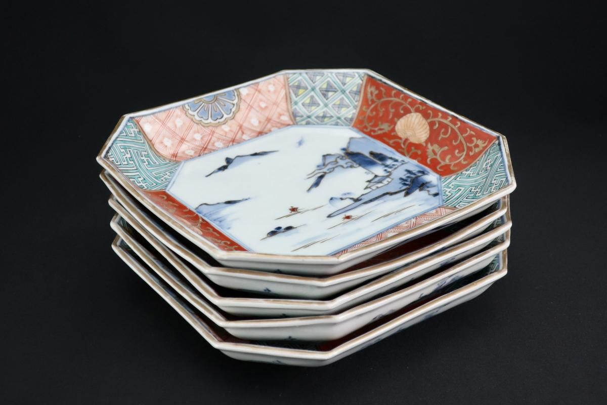 伊万里色絵菊花山水文隅切角皿 五枚組 / Imari Polychrome Square Plates set of 5
