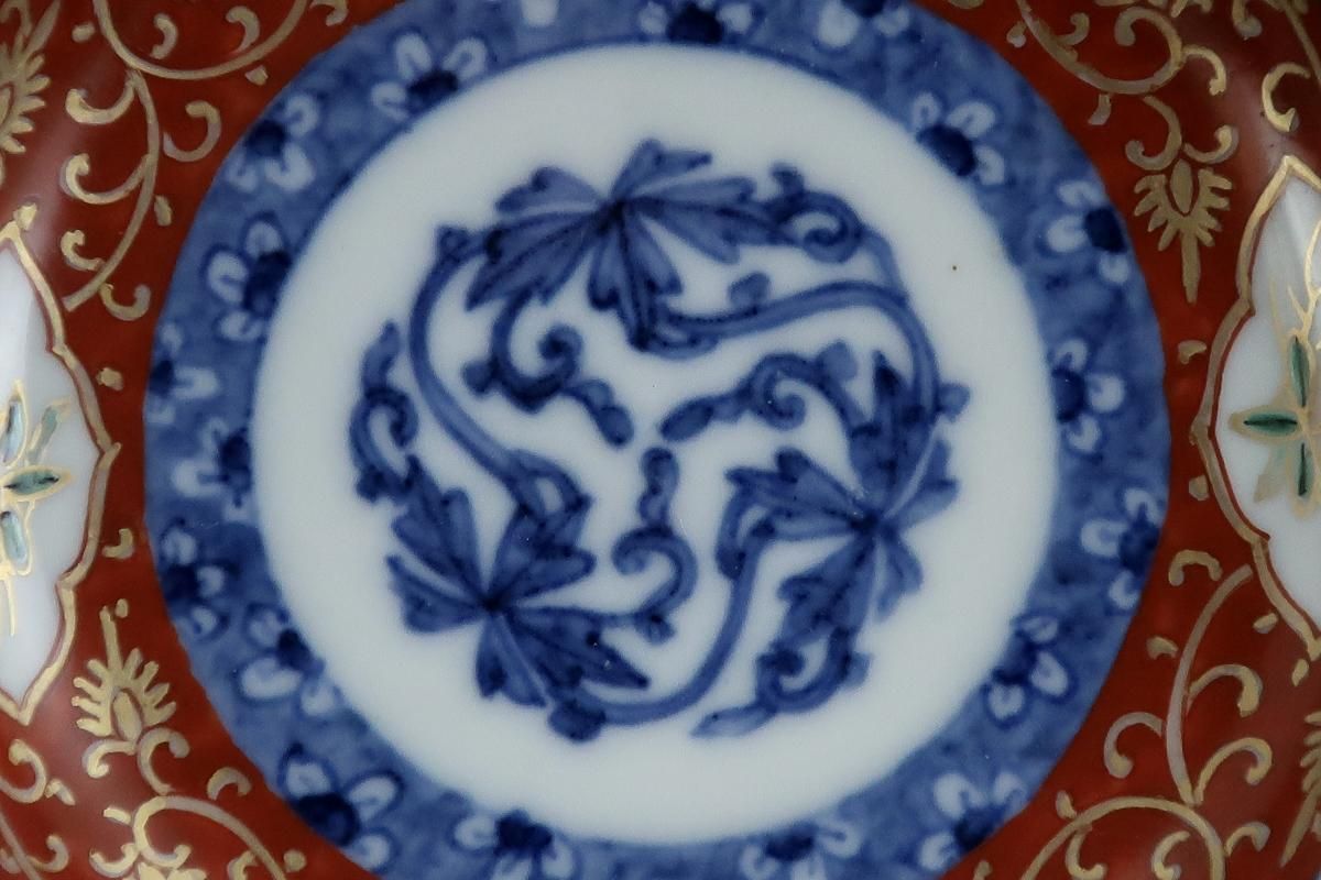 ☆どこから見ても華やかな赤絵に金彩の唐草が美しい色絵小皿。菱形の窓絵の中は子孫繁栄のシンボル柘榴の絵。そして外側にもびっしりと描かれた唐草文様がこのお皿の品質を物語ってくれています。