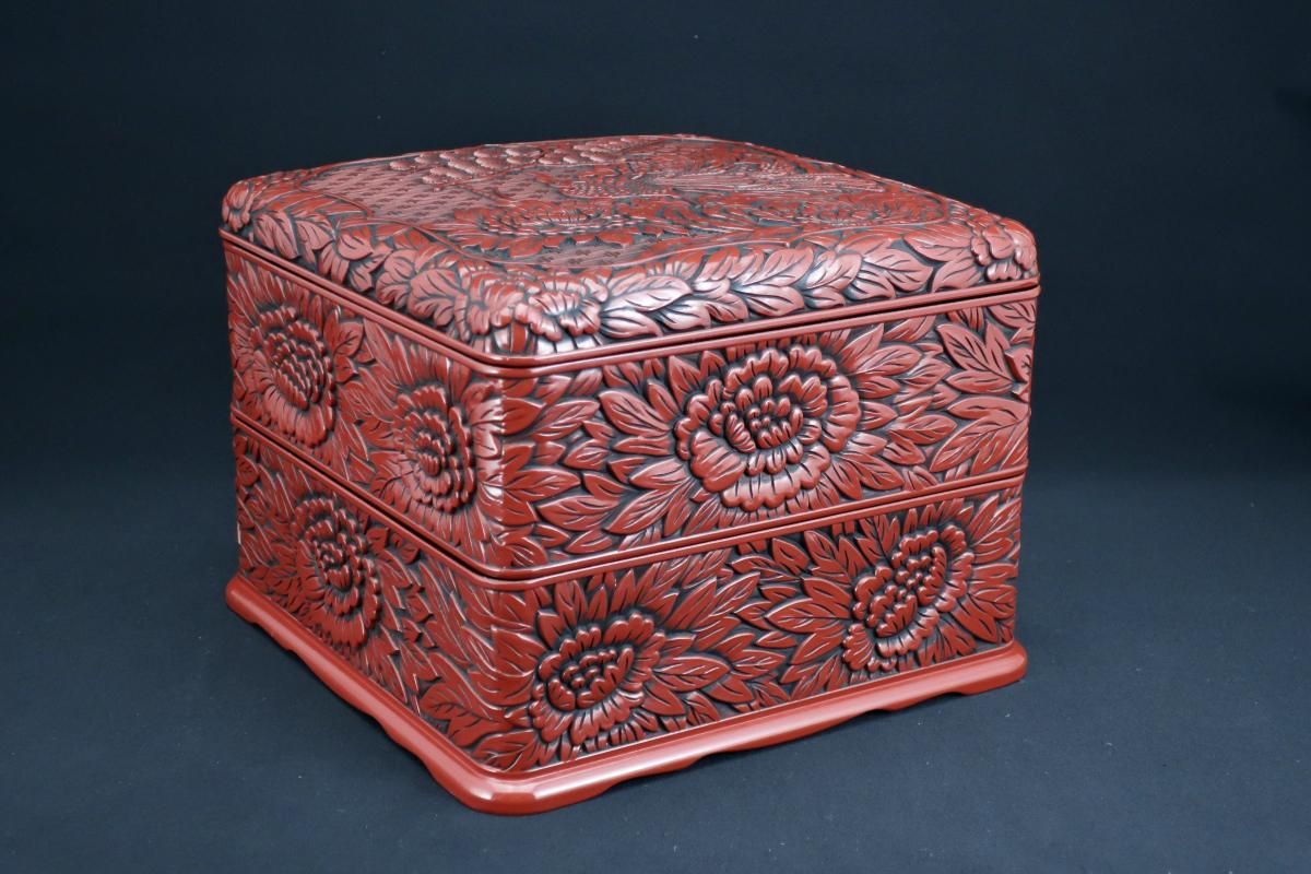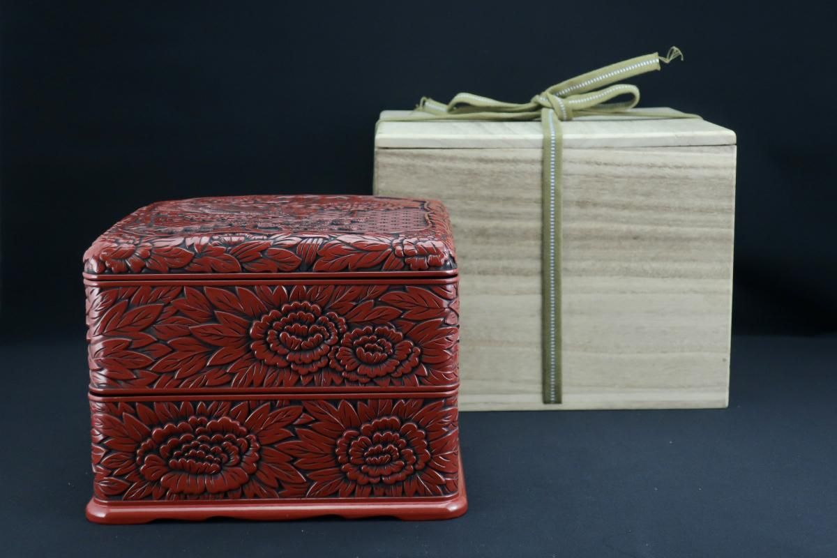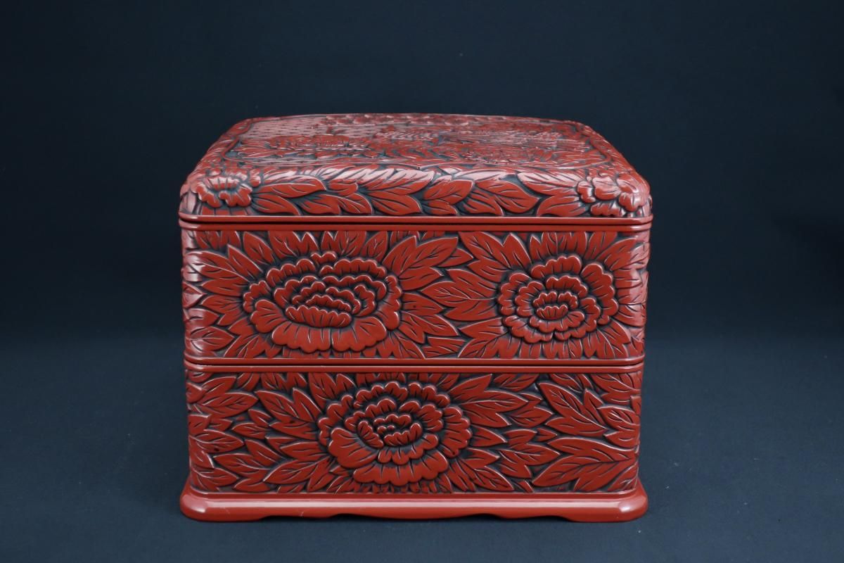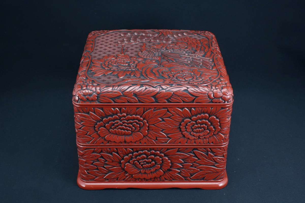 仙台堆朱牡丹孔雀文二段重 / Sendai 'Tsuishu' 'Jubako' Food Boxes with the carving of Peony and Peacock