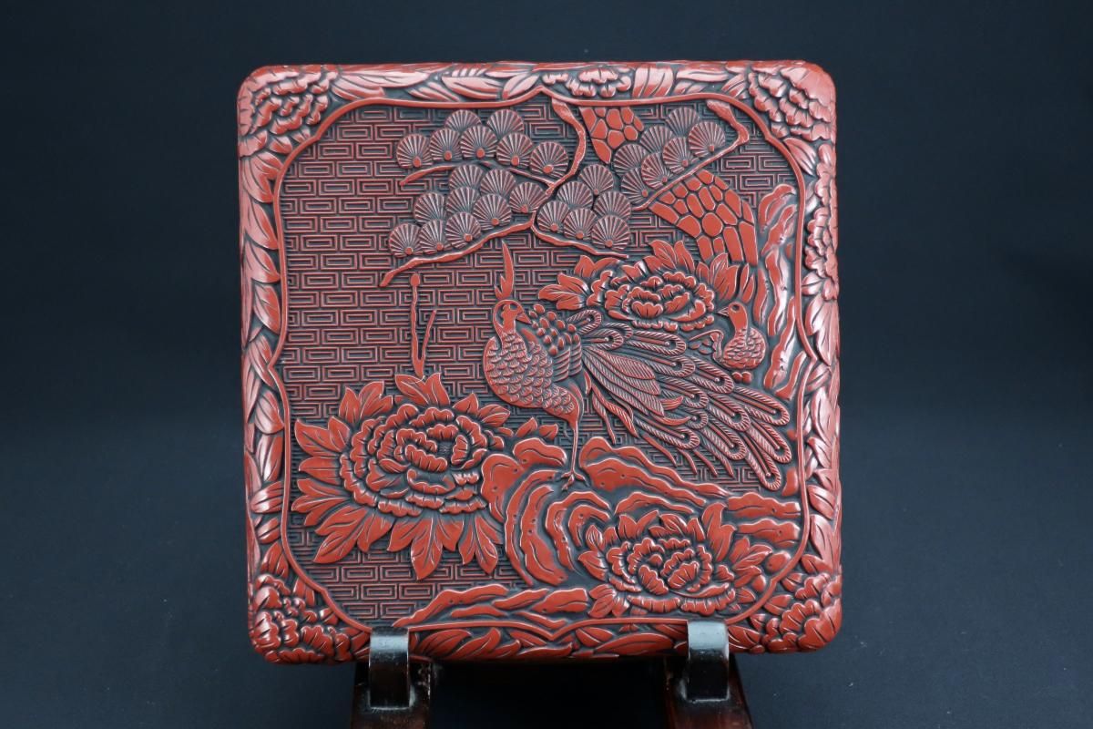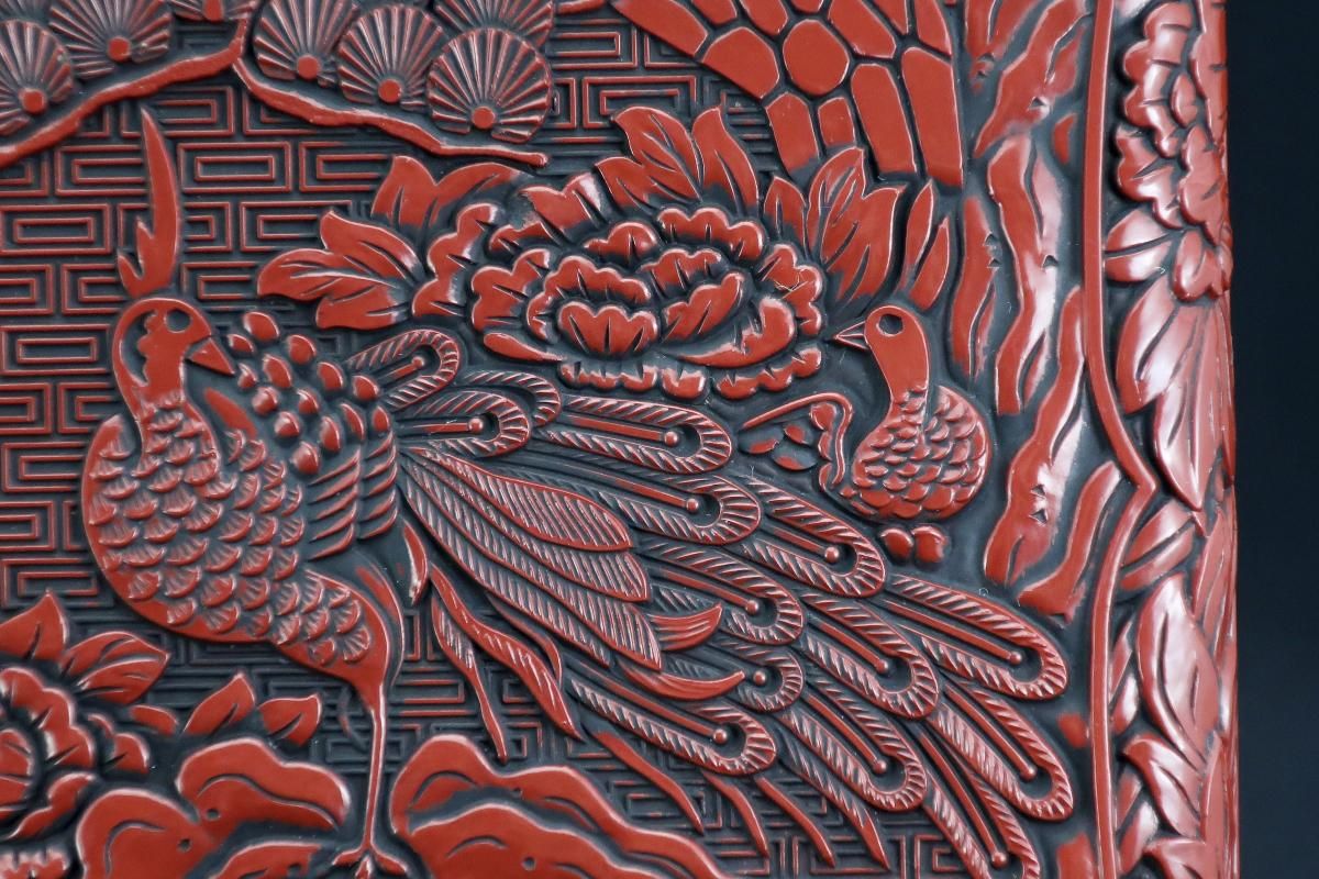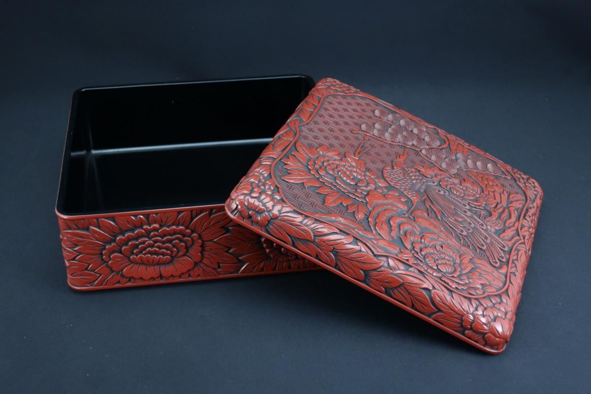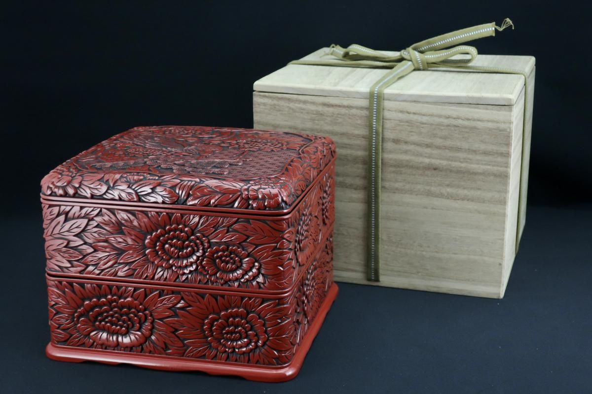仙台堆朱牡丹孔雀文二段重 / Sendai 'Tsuishu' 'Jubako' Food Boxes with the carving of Peony and Peacock