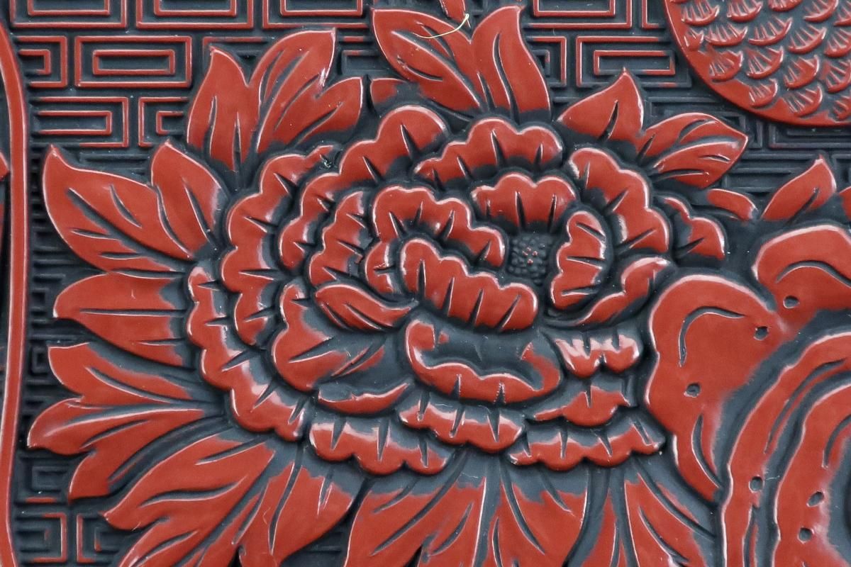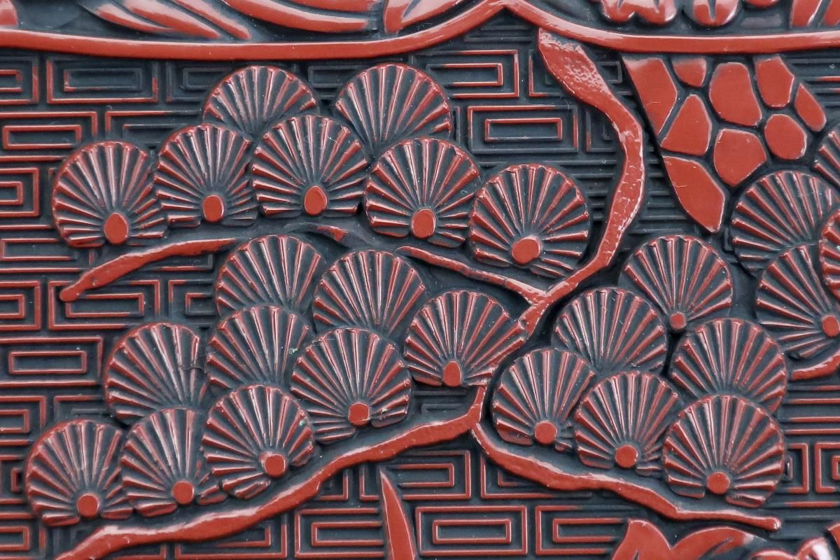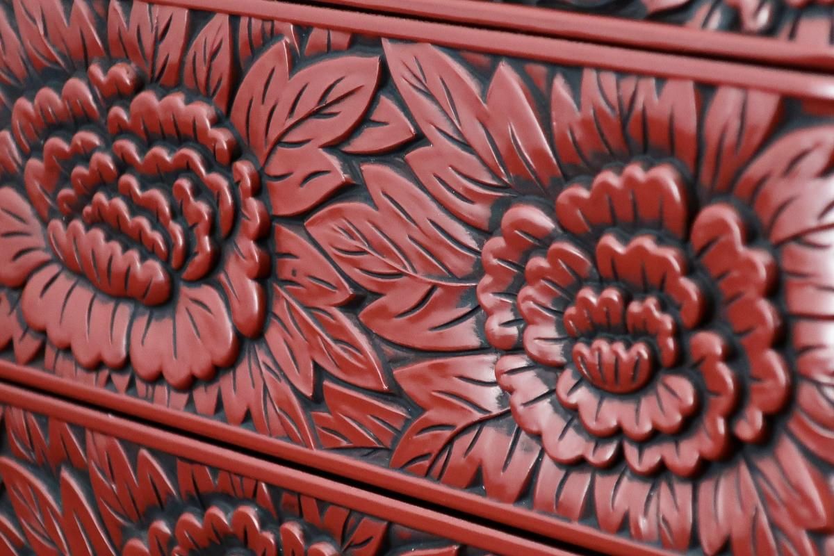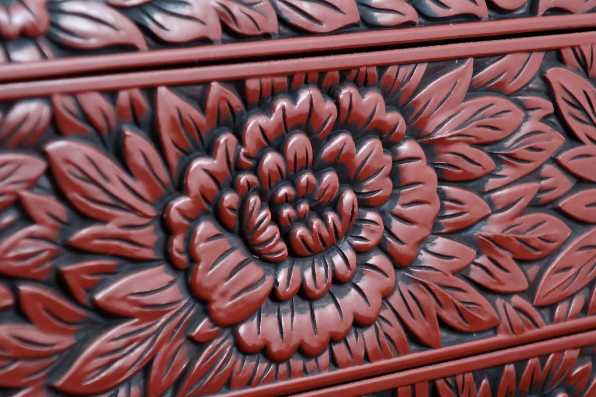 *堆朱は朱漆を数十回から数百回塗り重ねて、積層漆器を作って、それを切削琢磨して作り上げる技法を指しますが、仙台堆朱は、型押した素地や木地に、朱色の漆を塗り重ね、黒で古色を入れる技法で作られた漆器です。