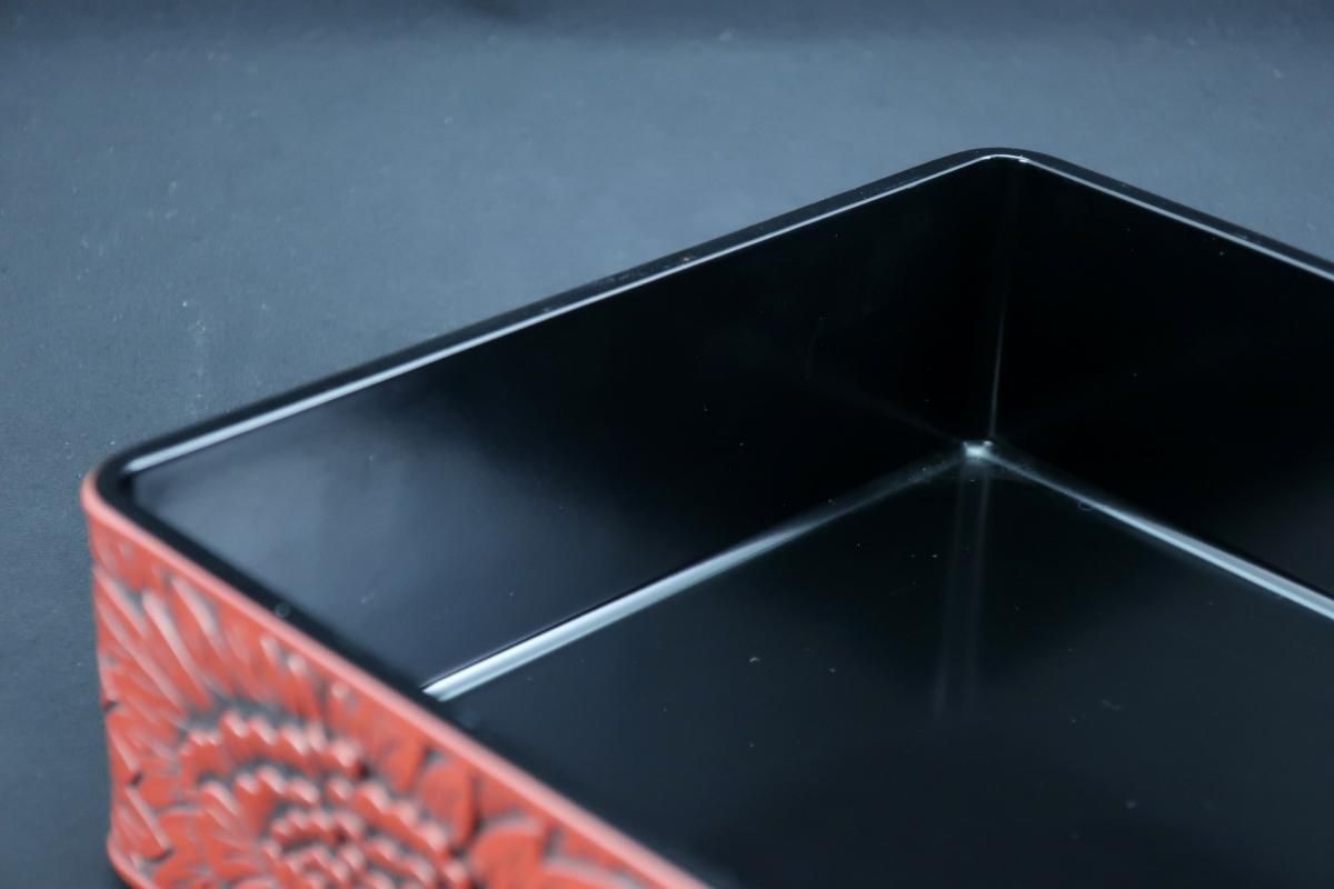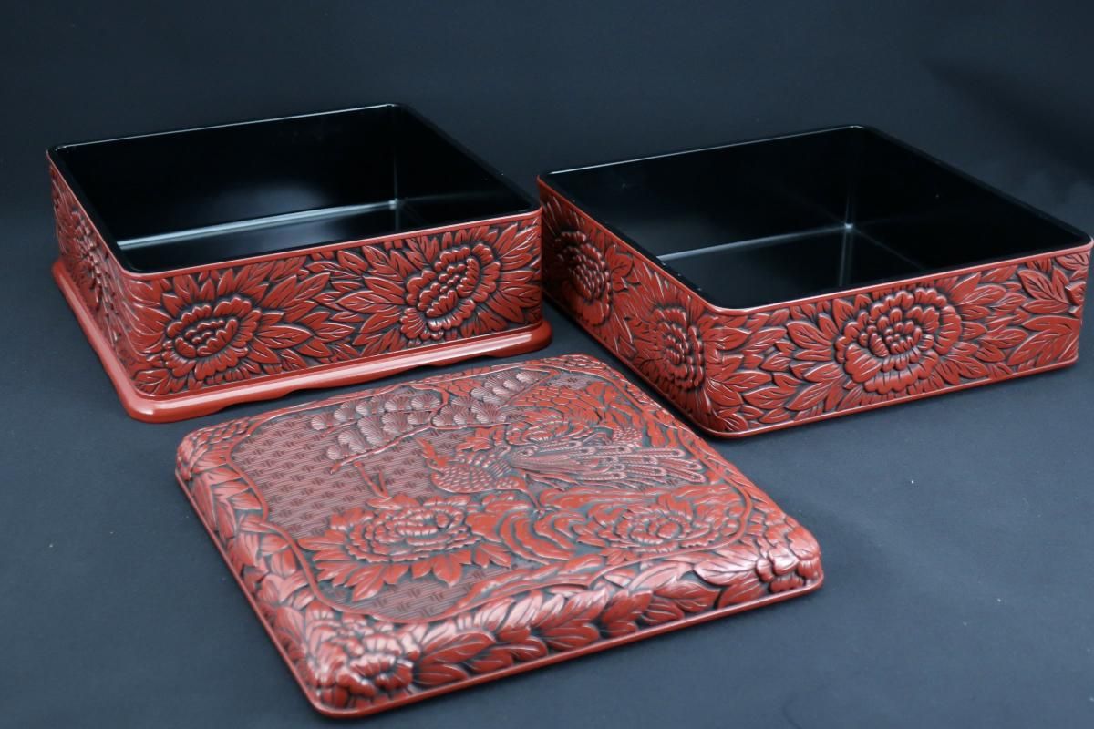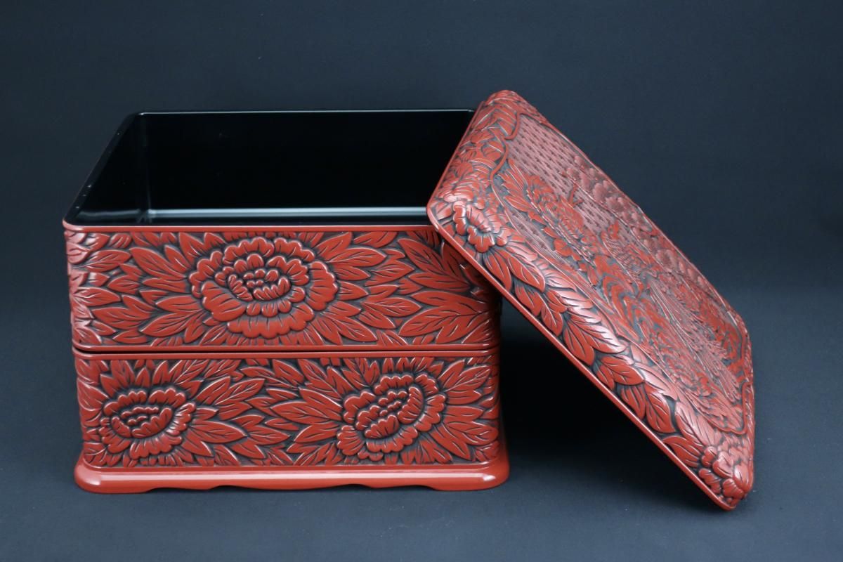 ☆細やかな彫りと朱と黒のコントラストが美しい仙台追種の重箱。シンプルモダンなセッティングにプラスしたら一際美しく映えるはず!是非お試しください。