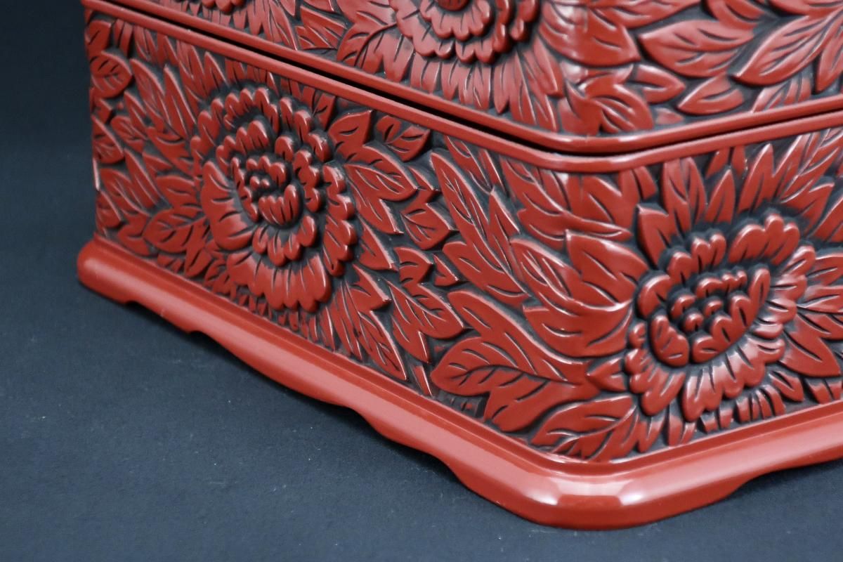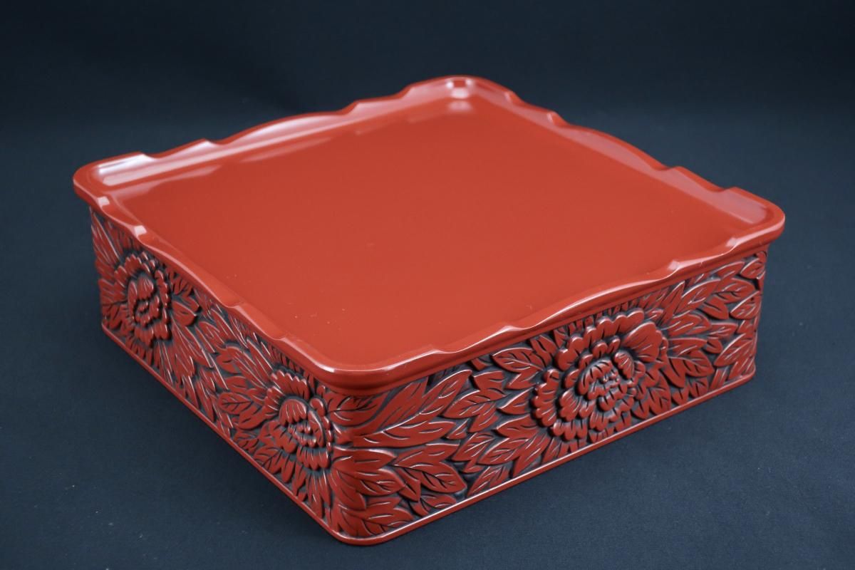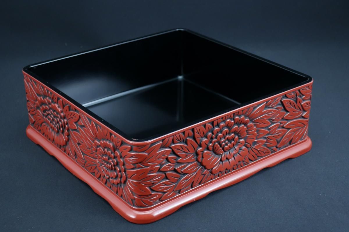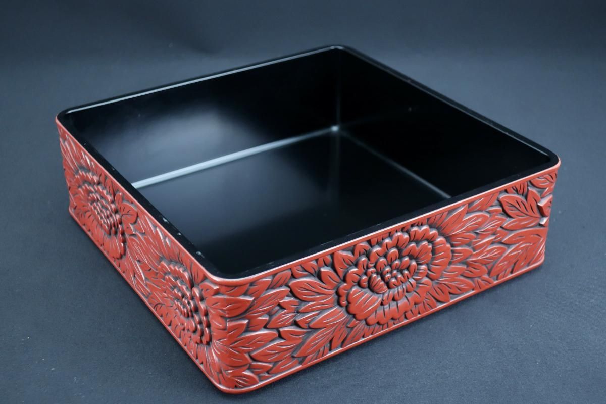 ☆細やかな彫りと朱と黒のコントラストが美しい仙台追種の重箱。シンプルモダンなセッティングにプラスしたら一際美しく映えるはず!是非お試しください。