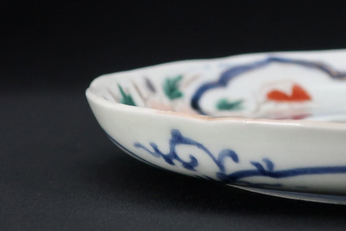 ☆ご覧になりましたか?ピンクの獅子♪ 身体は赤の水玉模様が描かれていてなかなか面白い絵付けです。トーンを抑えたこの時代の色絵はなんともいえない優しい雰囲気が漂っています。見込みの古伊万里の象徴的な松竹梅は大きくしっかりと描かれていて、挿し色の赤絵とうまく調和しています。