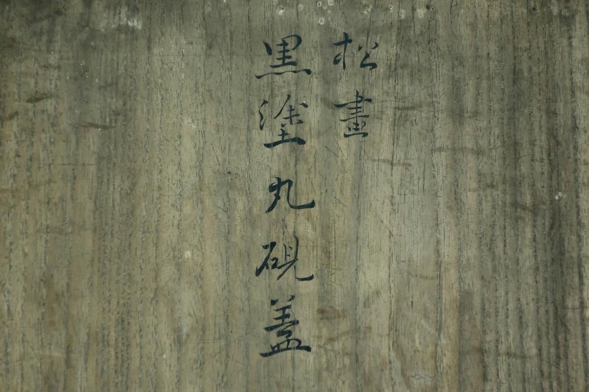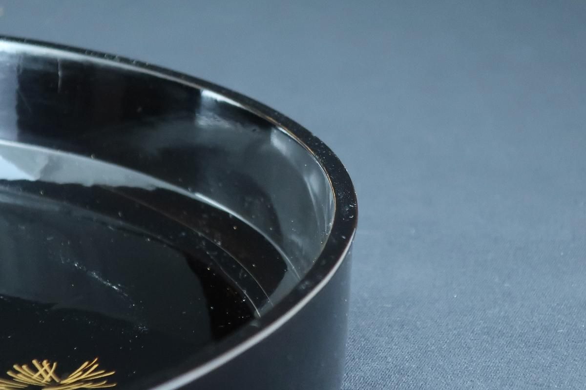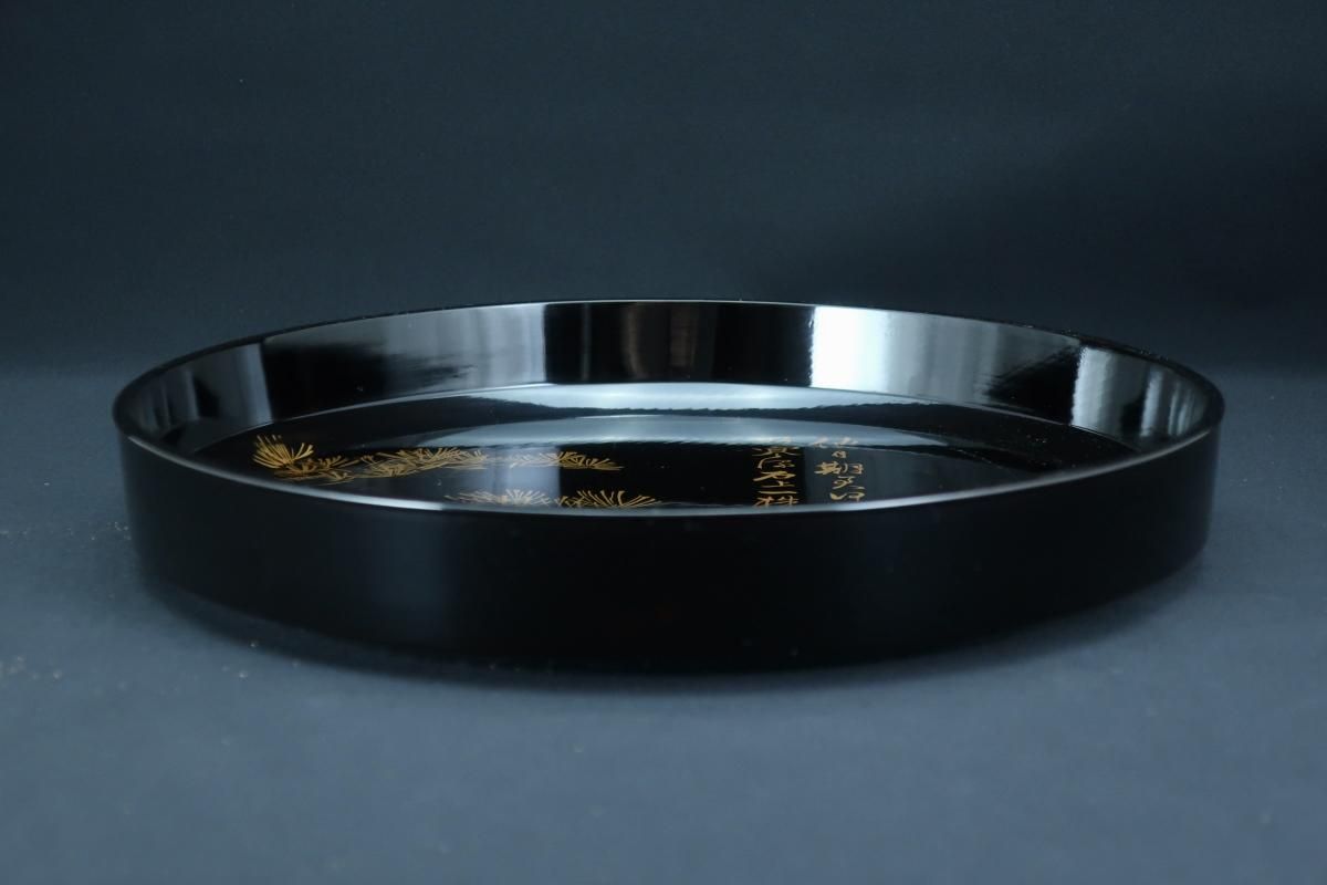 ☆硯蓋(すずりぶた)は、懐石道具の一で、茶事において主客が献酬するための肴(八寸)を盛って出すために用いられる、四方に低い立ち上がった縁の付いた角盆と言われていますが、こちらは珍しい丸形。由緒正しいものかと思われますが、普通に丸盆としてお使いいただいても楽しめます。見事な松の蒔絵と漢詩の一部が書かれたちょっと高貴な感じのするお盆を日常使いでお楽しみ見ください。