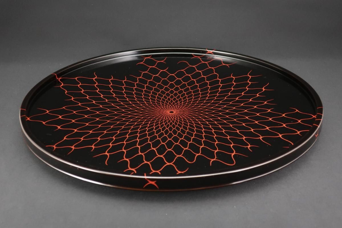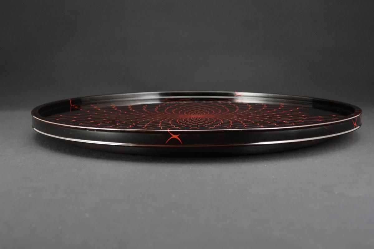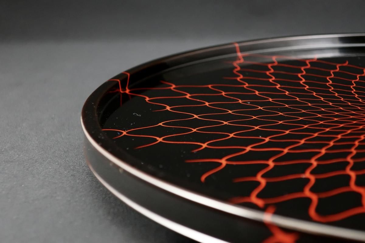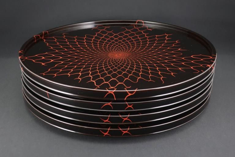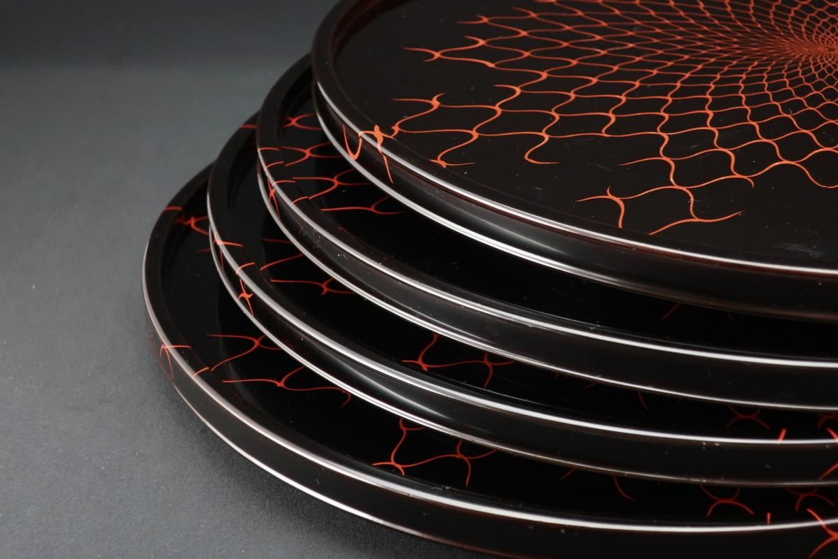 黒塗朱網蒔絵丸膳 四枚組 / Black-lacquered Round Trays with Red Net pattern set of 4