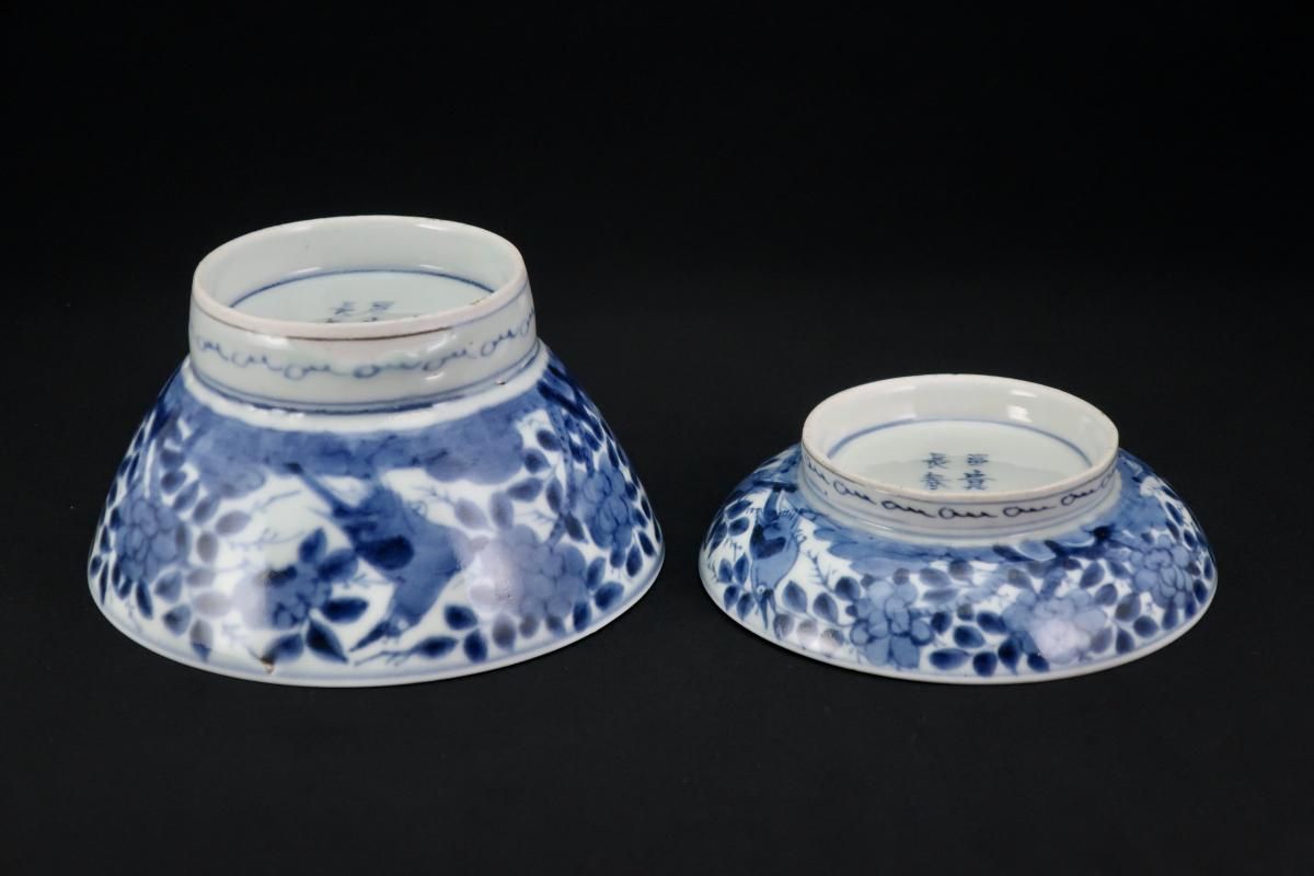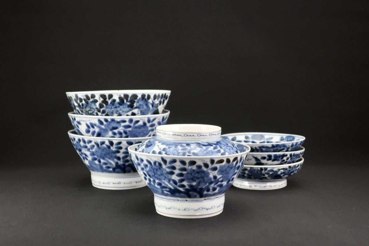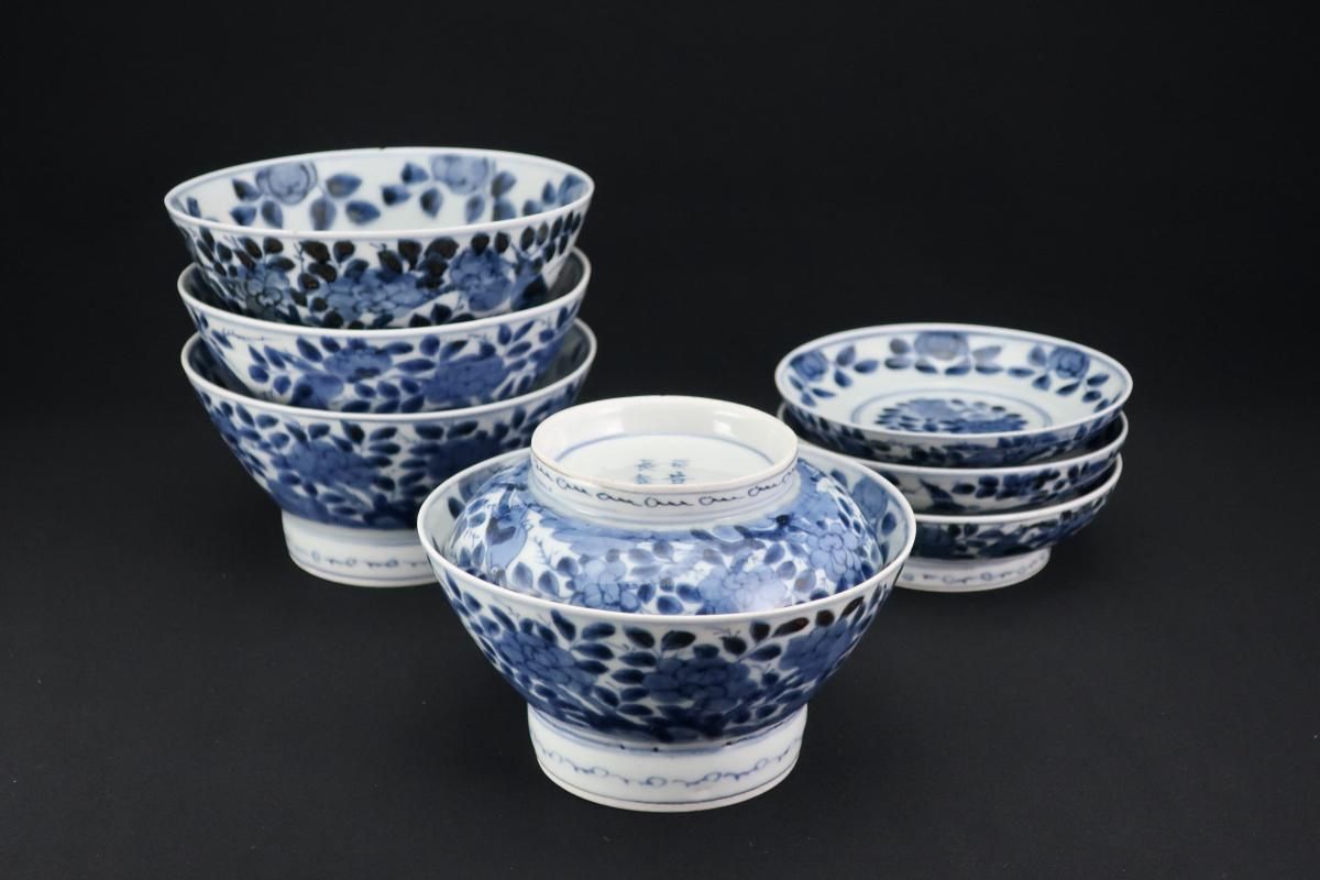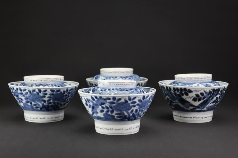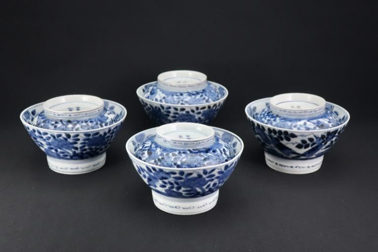 伊万里染付花鳥文蓋茶碗(大) 四客組 / Imari Blue & White Bowls with Lids set of 4