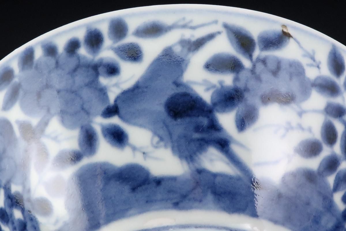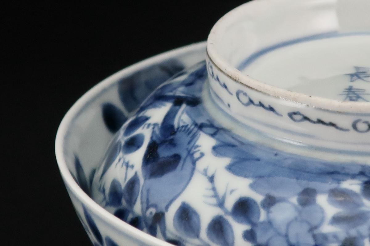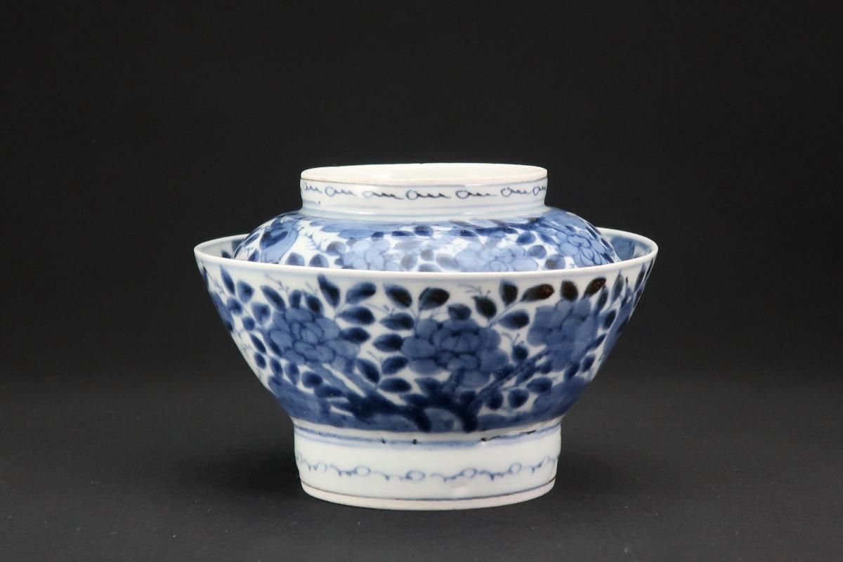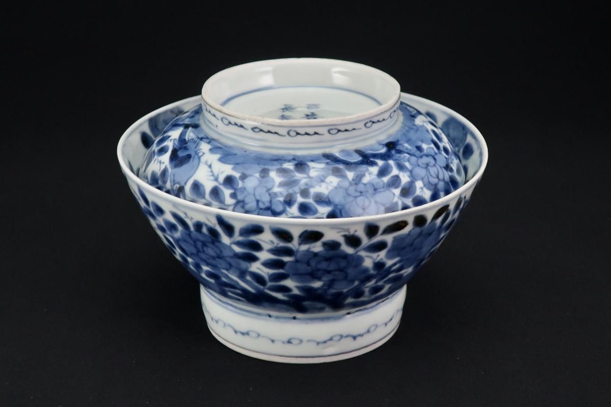 ☆藍色が綺麗な蓋茶碗。牡丹の中に小鳥が描かれた賑やかな絵付けです。この形は特に古いものによく見られるもので太い高台やすっと薄くラッパ状に広がった縁が特徴的。大きめの茶碗なので小丼などにも使えます。