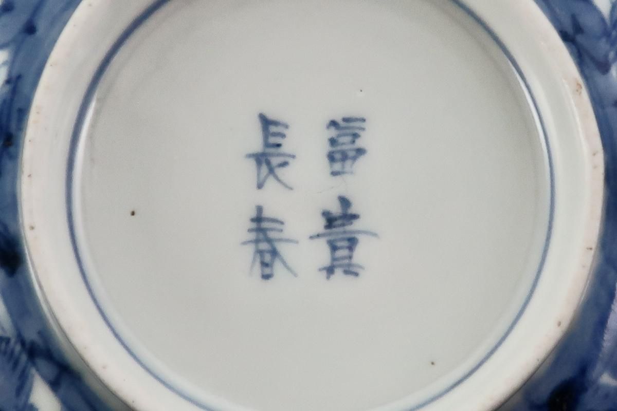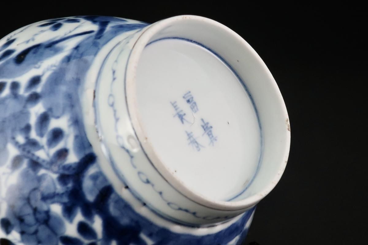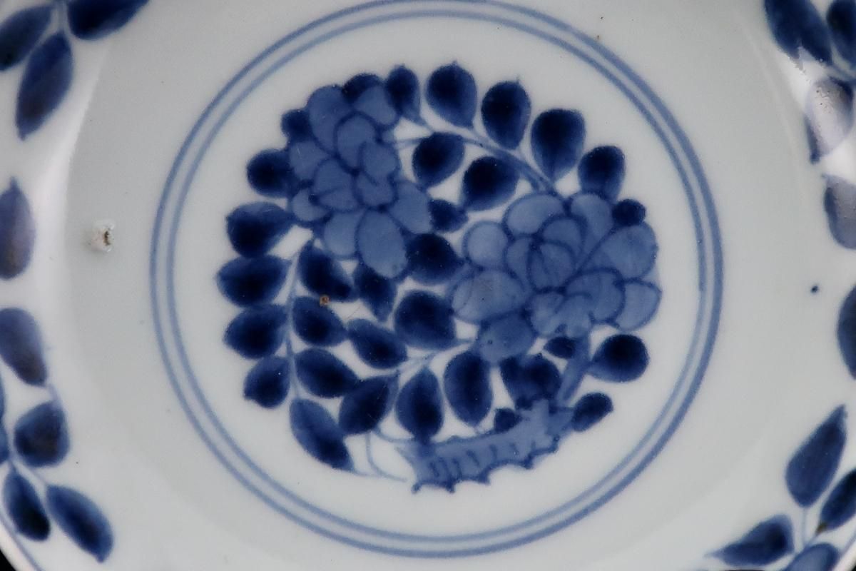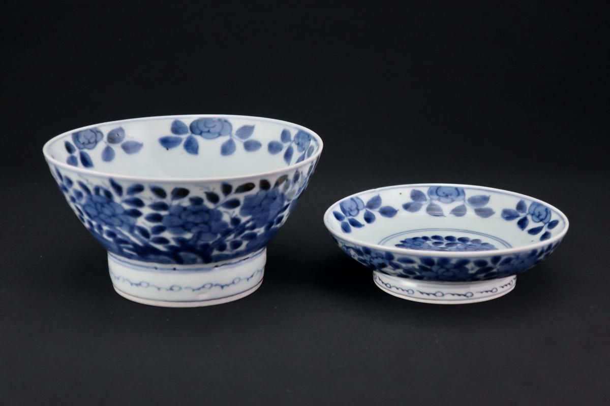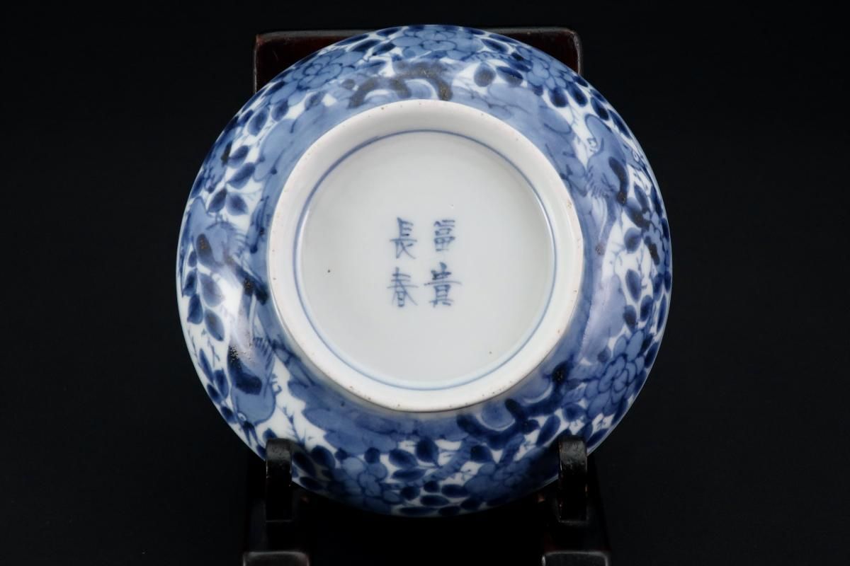 ☆藍色が綺麗な蓋茶碗。牡丹の中に小鳥が描かれた賑やかな絵付けです。この形は特に古いものによく見られるもので太い高台やすっと薄くラッパ状に広がった縁が特徴的。大きめの茶碗なので小丼などにも使えます。