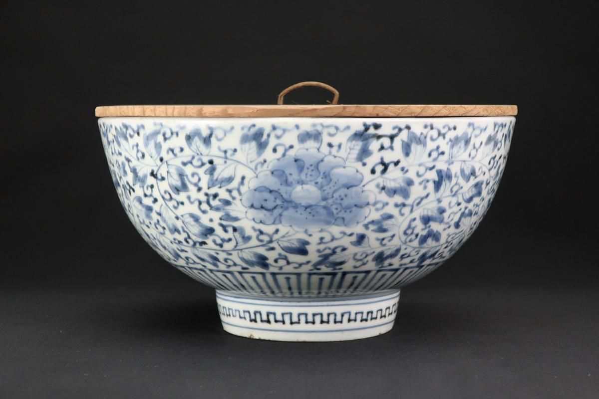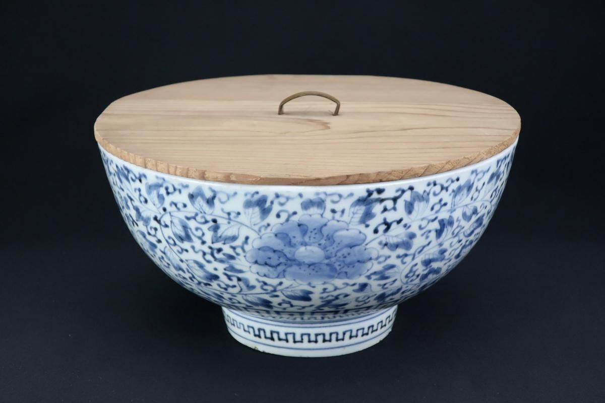 ☆この形、この文様、王道の大鉢と言っても過言はありません。淡い色調の花唐草文様は時代の古いものに多く、こちらの絵付はまさに古伊万里を知るには教科書的な絵付でもあります。そしてこの大鉢、元の所有者がお茶道具として使いたかったのでしょう。カジュアルではありますが、誂えた杉の蓋と共に出てきました。確かに見立てで使うに相応しい形だし、黒塗りの蓋よりも染付には白木の方が爽やかな感じがしますね♫