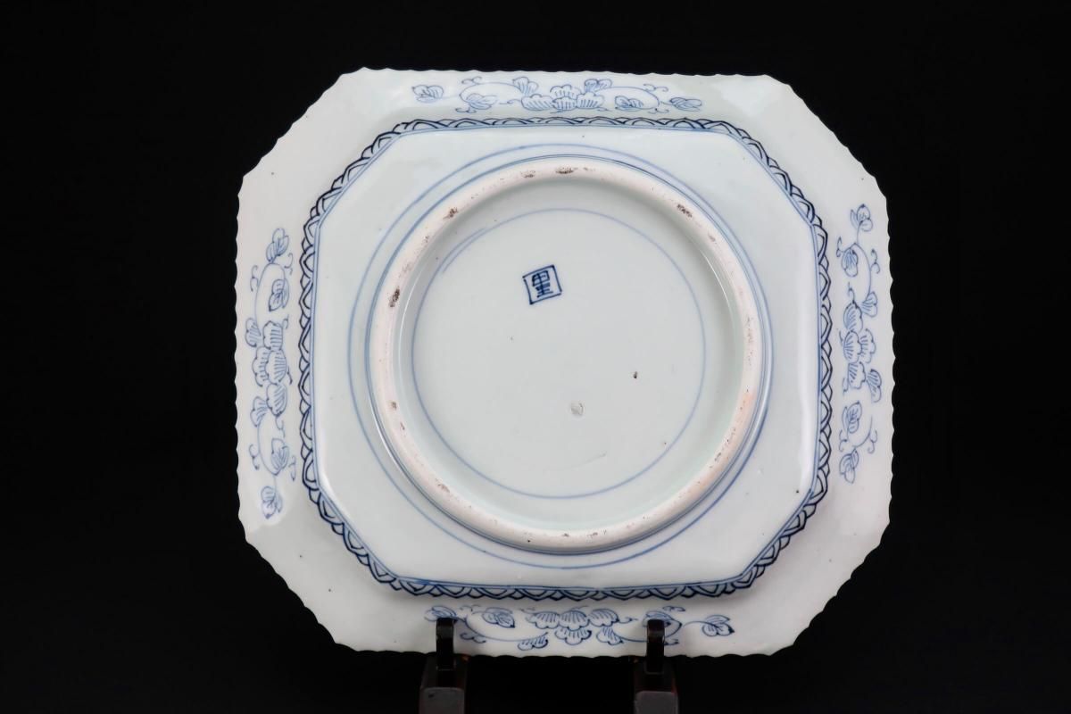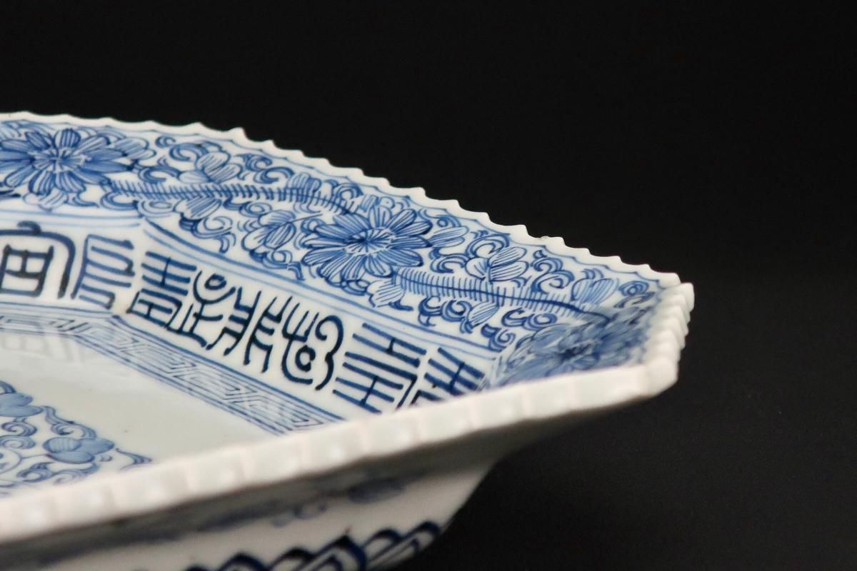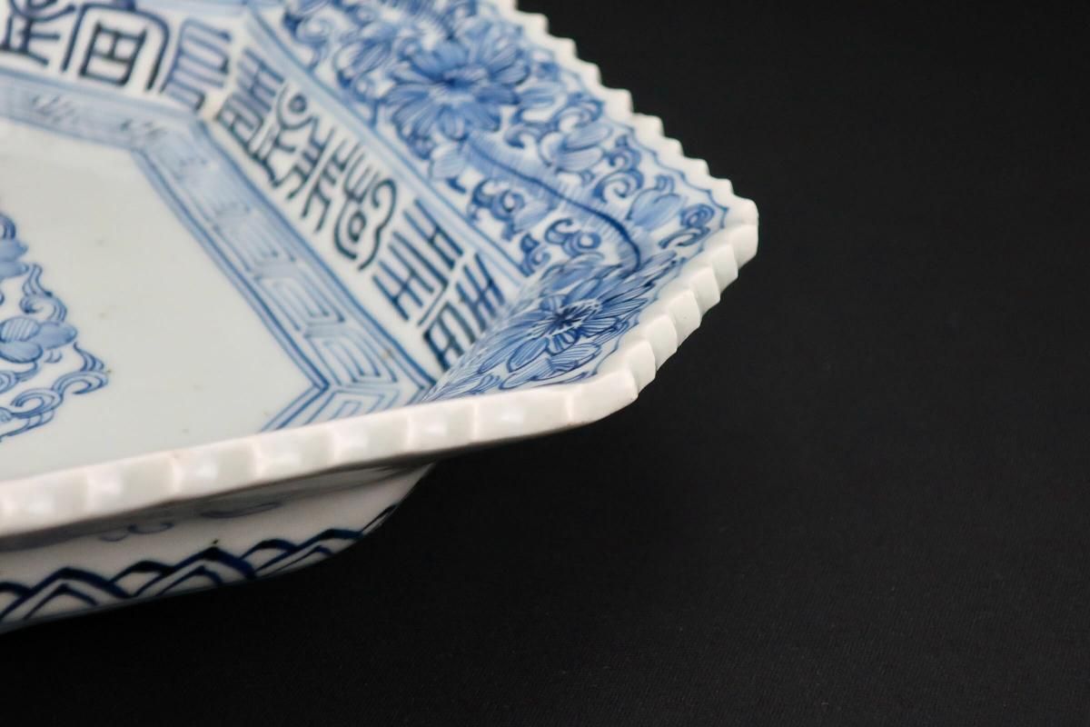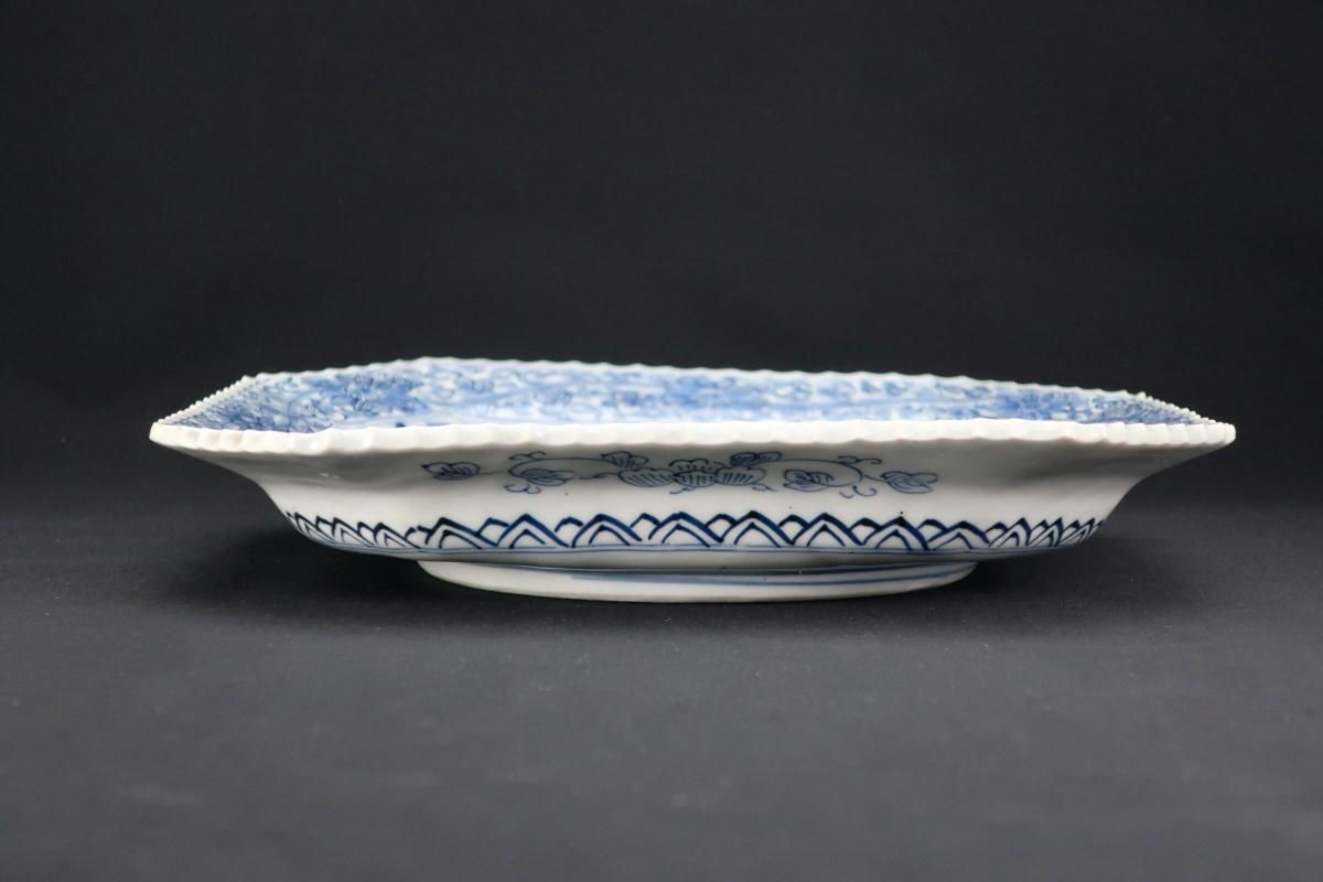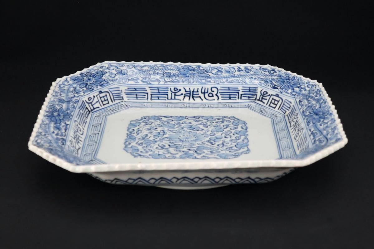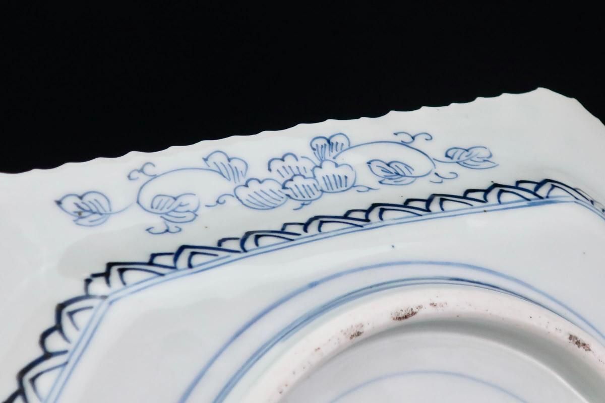 ☆線描で隅切でギザギザで・・・古伊万里ではお馴染みのこの色形。細かな絵付けが綺麗なやや長方形の染付皿。今ではきちんと残っているものも珍しくなってきました。