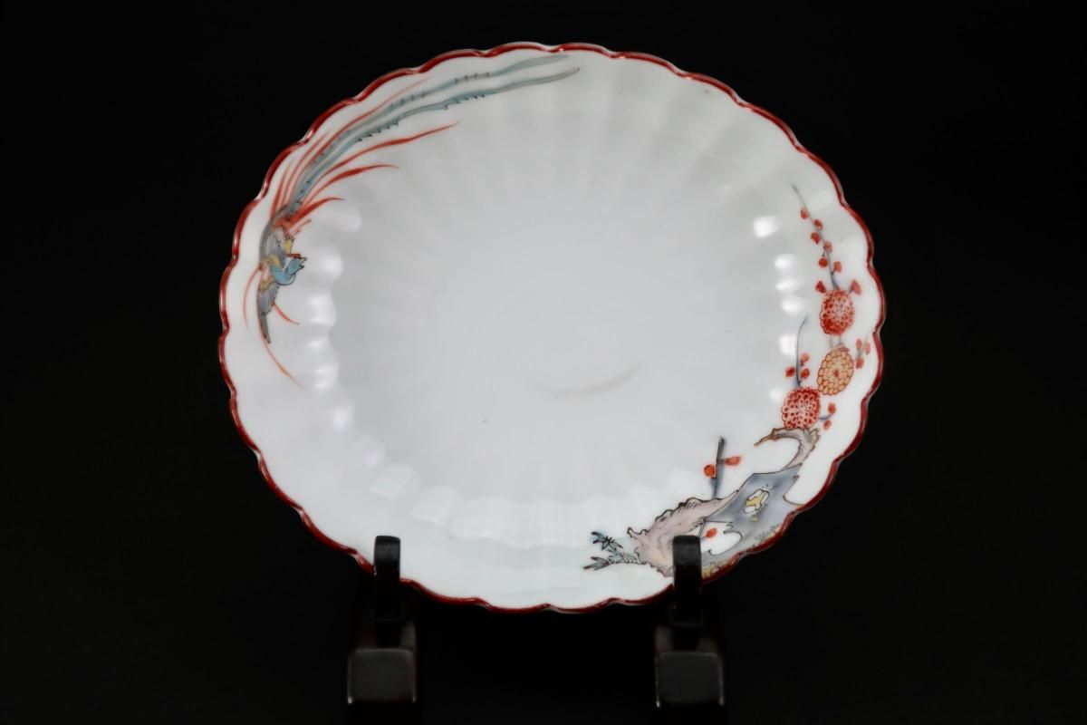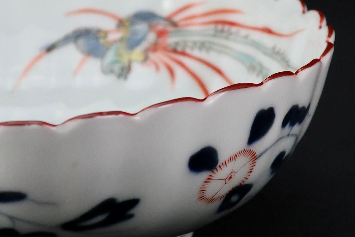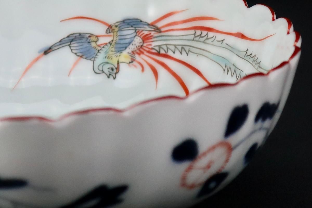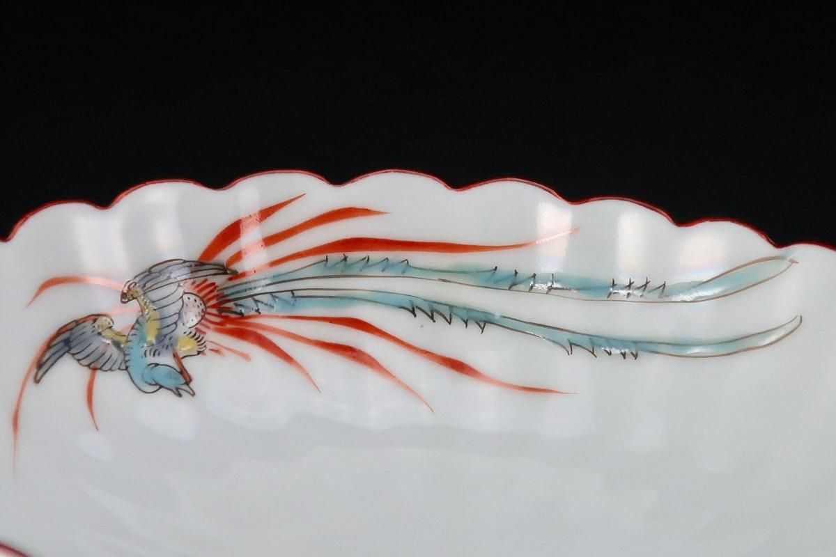 ☆薄く繊細なつくりの柿右衛門手の上品な向付。縁近くに描かれた鳳凰と菊と梅の絵付けもさりげなく綺麗。縁に鉄釉をあしらったことでキリッとした印象に見えます。バランスよく上品に盛り付けてお楽しみください。