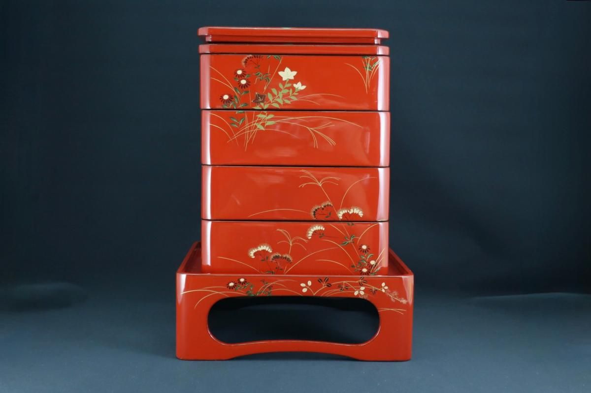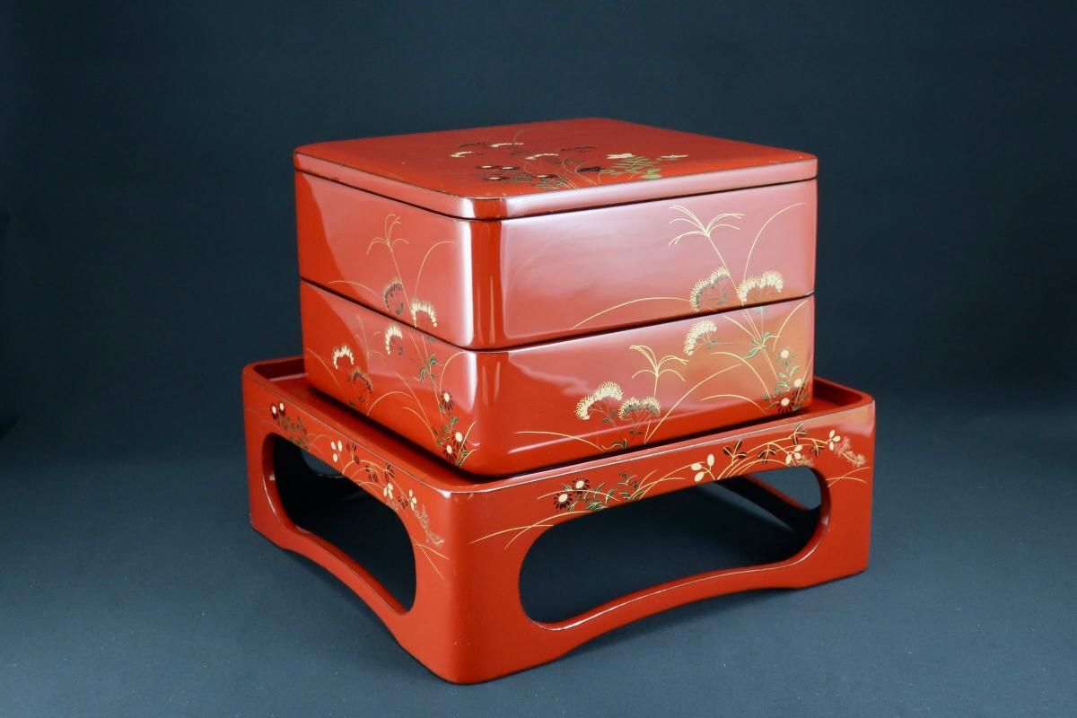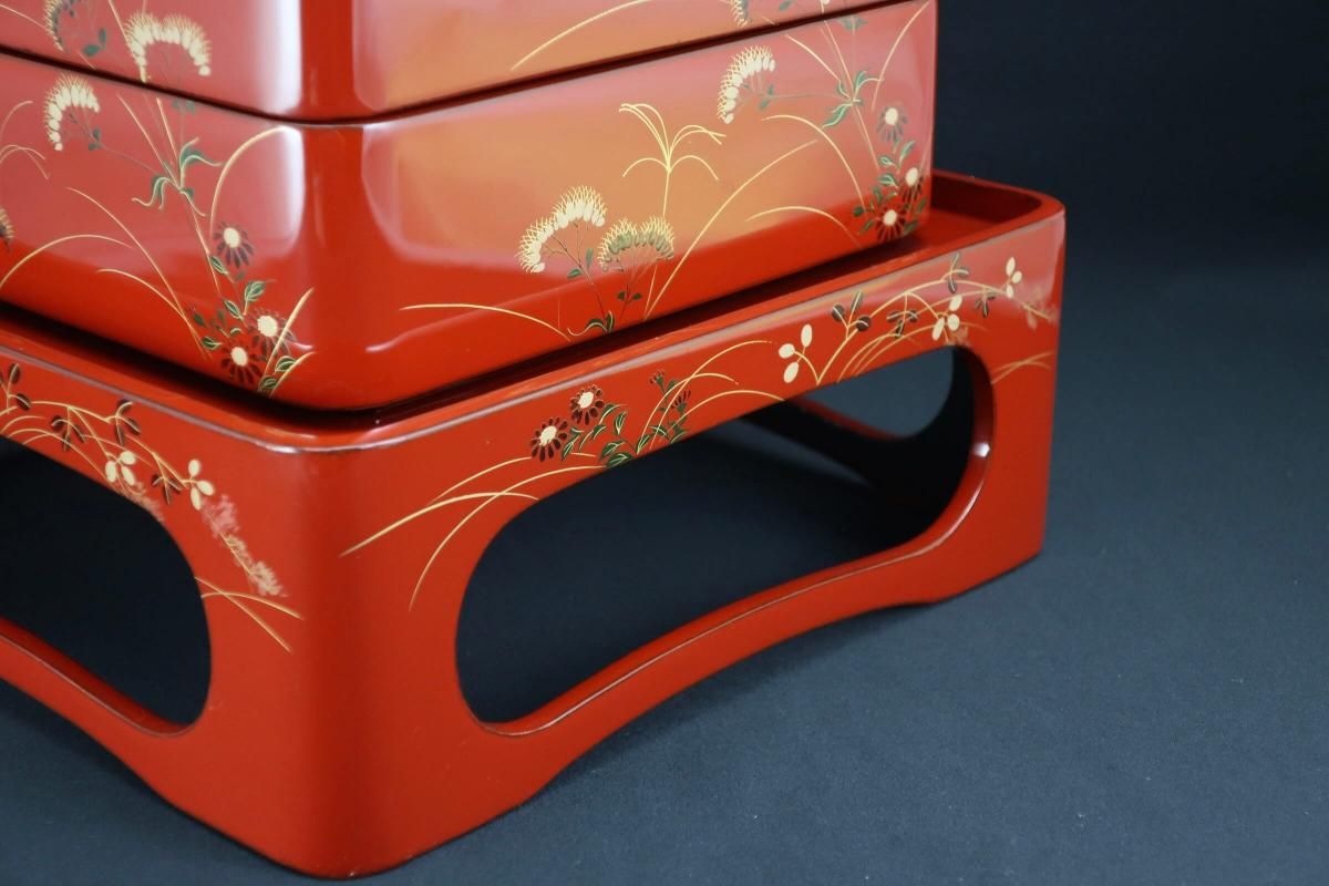 朱塗秋草蒔絵重台付重箱 / Red-lacquered 'Jubako' Food Boxes with Stand
