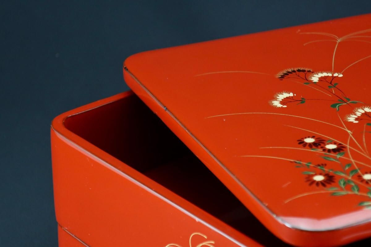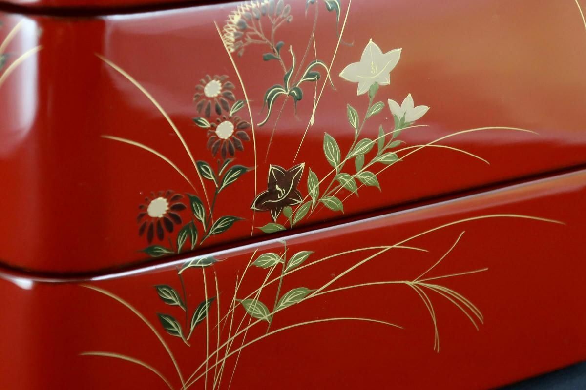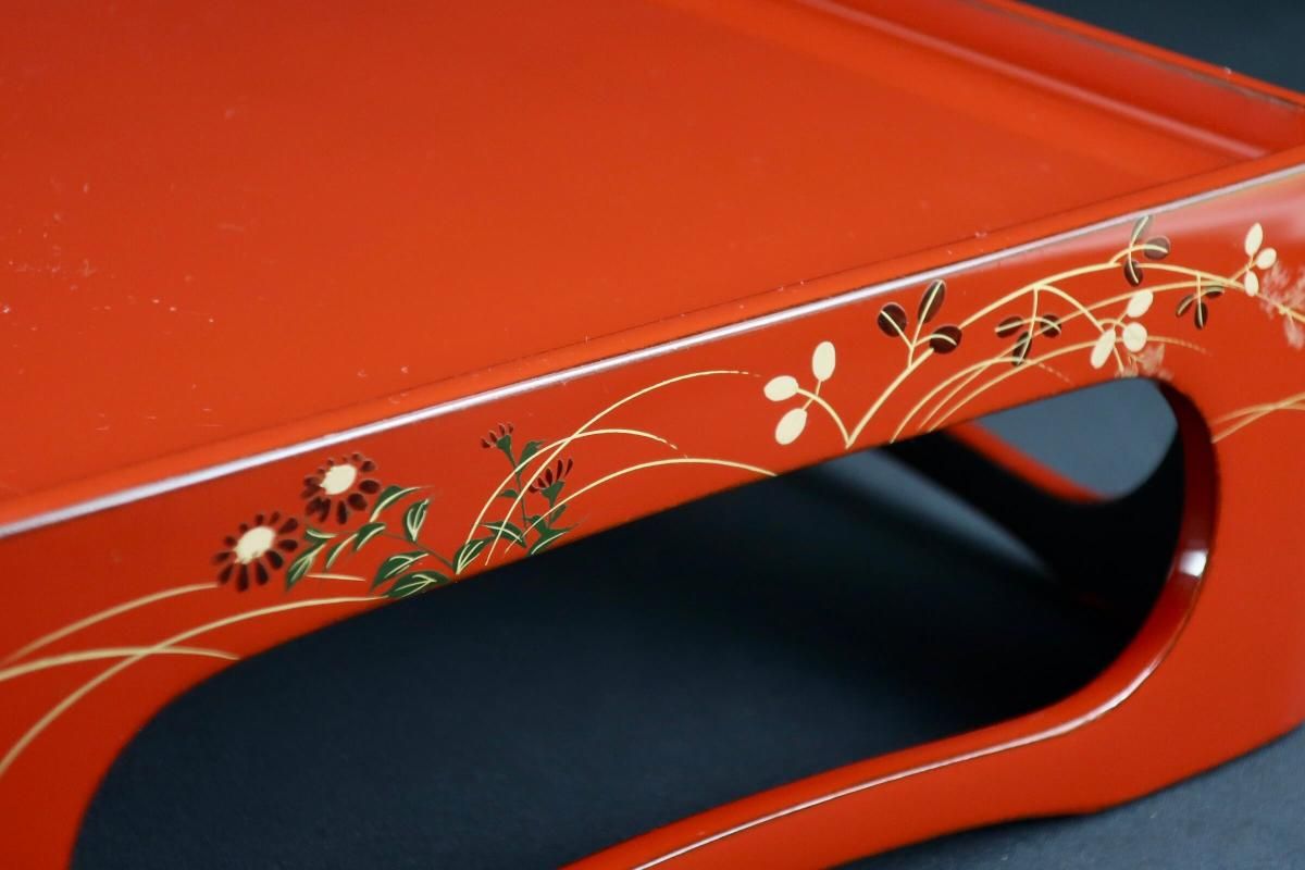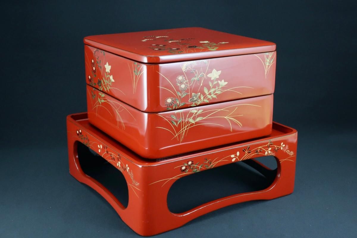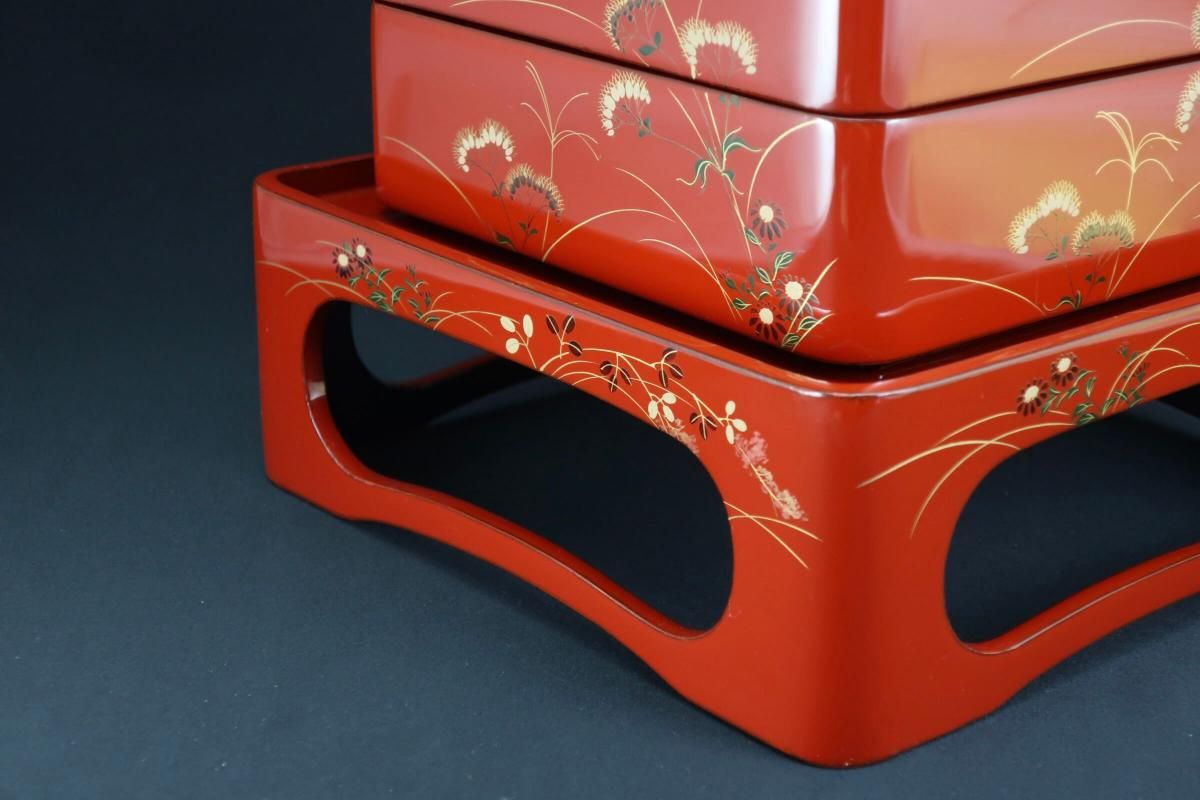 ☆これぞジャパンレッドとも呼ぶべき美しい朱塗の重台&重箱。のびのびと描かれた秋草の蒔絵もとても綺麗なセットです。四段と台のセットですが、二段で使ってみたり、一段を菓子器として使ったり、重台だけをスタンド代わりにしてみたり、工夫次第で色々な楽しみ方があるのも良いところ。段の高さが揃っているのでおもてなしの際にお弁当箱がわりにしても素敵ですね。