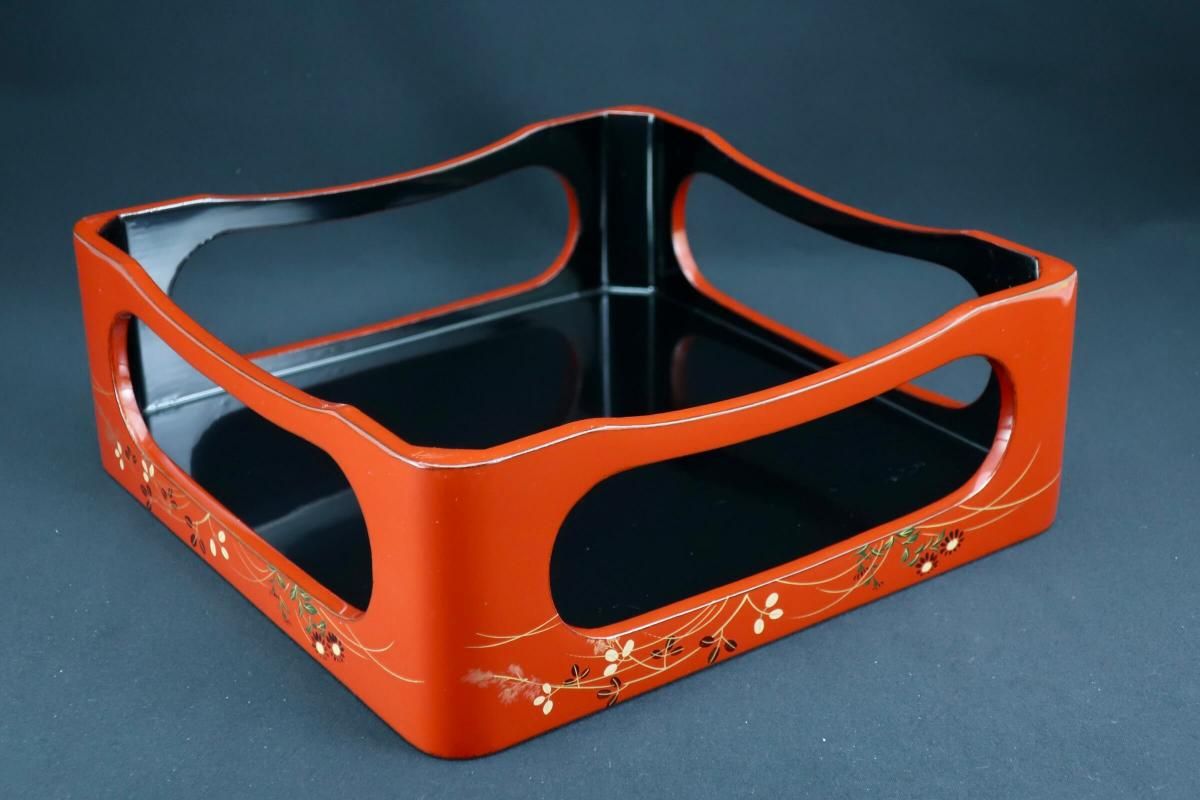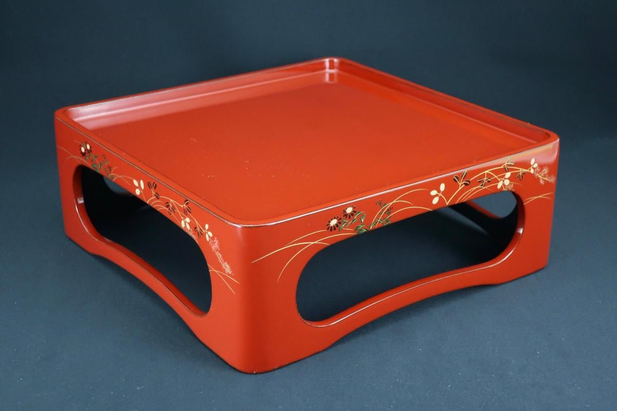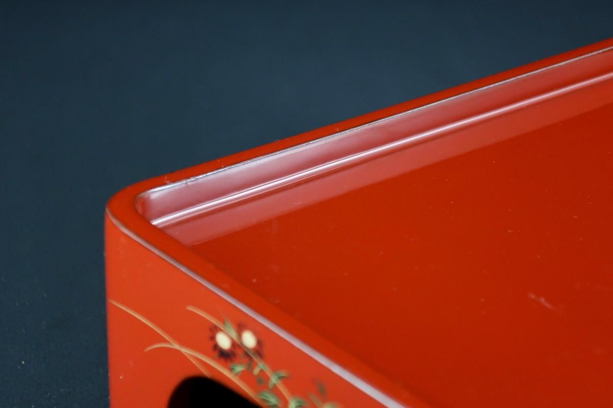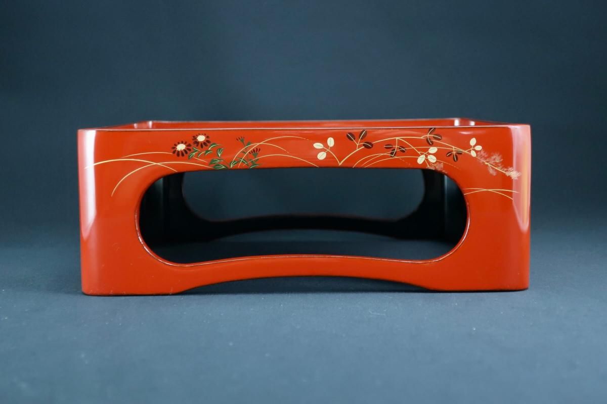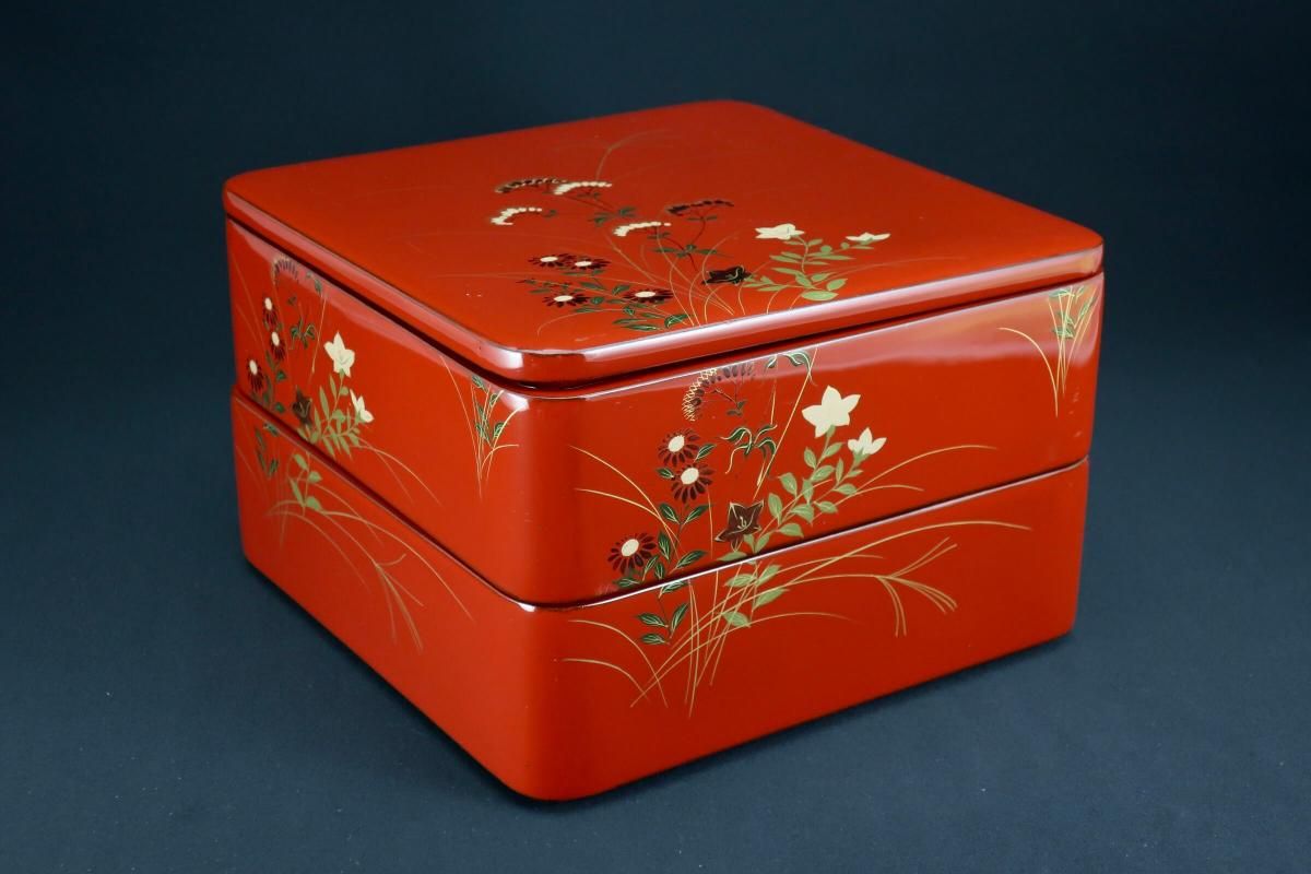 ☆これぞジャパンレッドとも呼ぶべき美しい朱塗の重台&重箱。のびのびと描かれた秋草の蒔絵もとても綺麗なセットです。四段と台のセットですが、二段で使ってみたり、一段を菓子器として使ったり、重台だけをスタンド代わりにしてみたり、工夫次第で色々な楽しみ方があるのも良いところ。段の高さが揃っているのでおもてなしの際にお弁当箱がわりにしても素敵ですね。