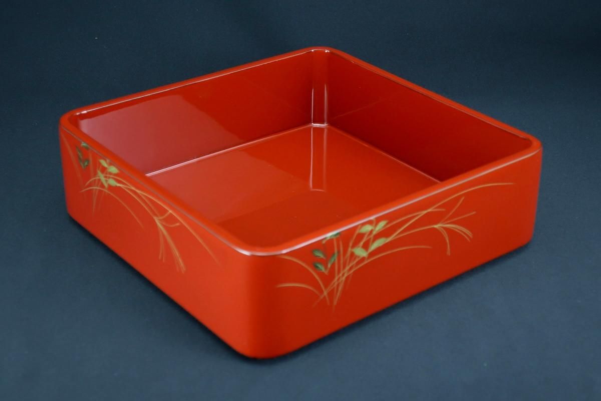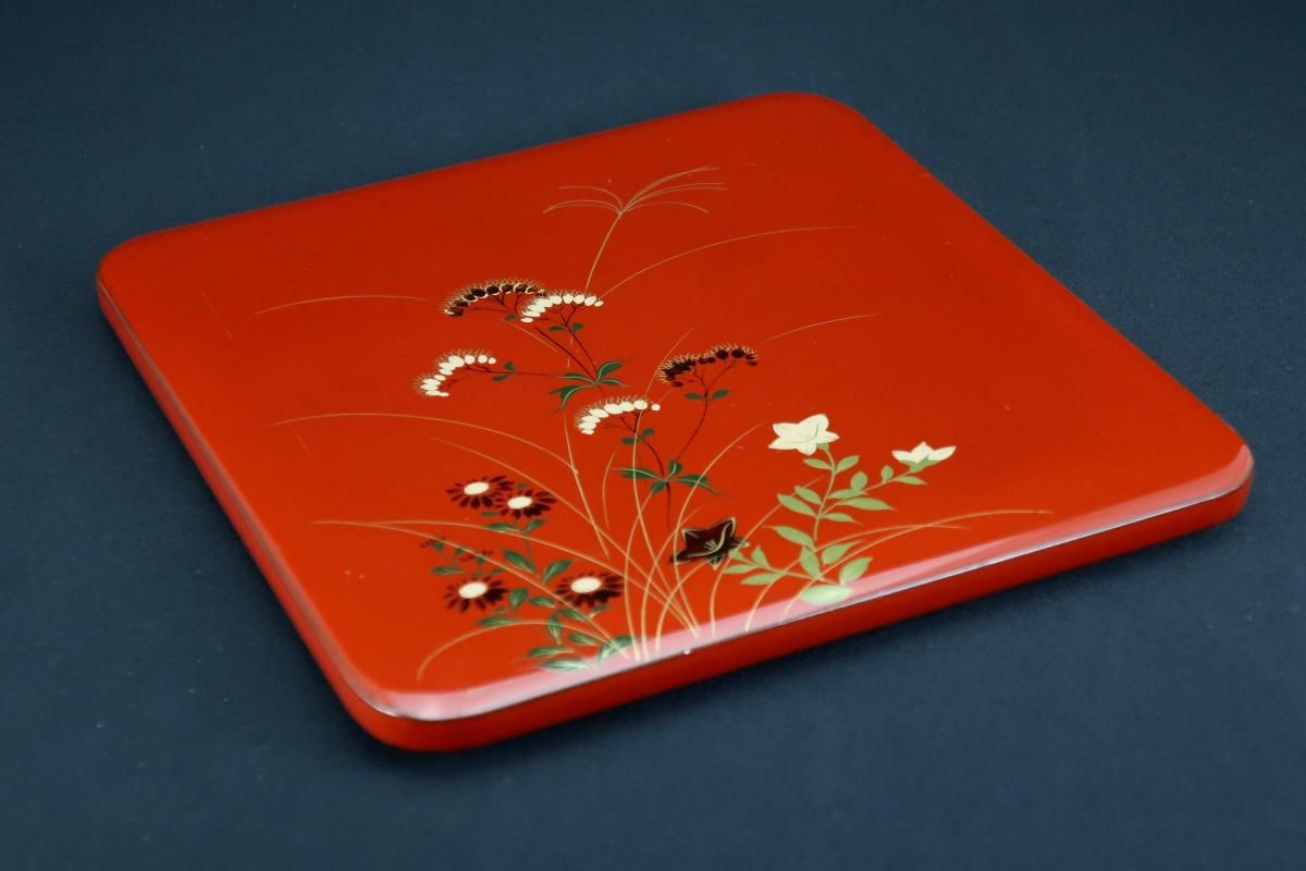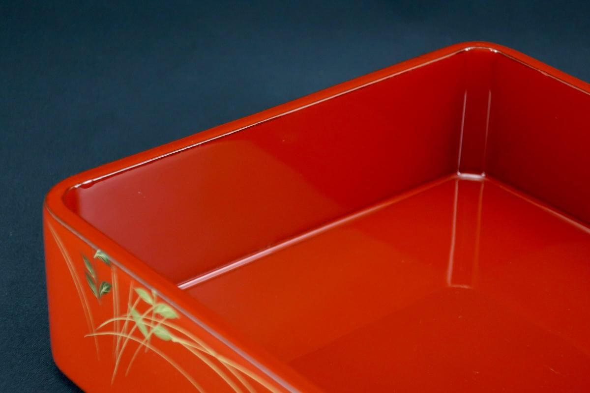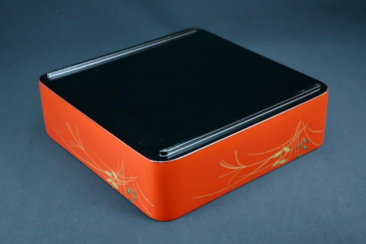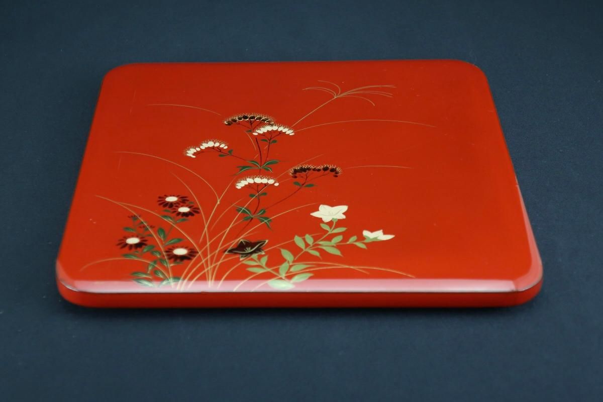 ☆これぞジャパンレッドとも呼ぶべき美しい朱塗の重台&重箱。のびのびと描かれた秋草の蒔絵もとても綺麗なセットです。四段と台のセットですが、二段で使ってみたり、一段を菓子器として使ったり、重台だけをスタンド代わりにしてみたり、工夫次第で色々な楽しみ方があるのも良いところ。段の高さが揃っているのでおもてなしの際にお弁当箱がわりにしても素敵ですね。