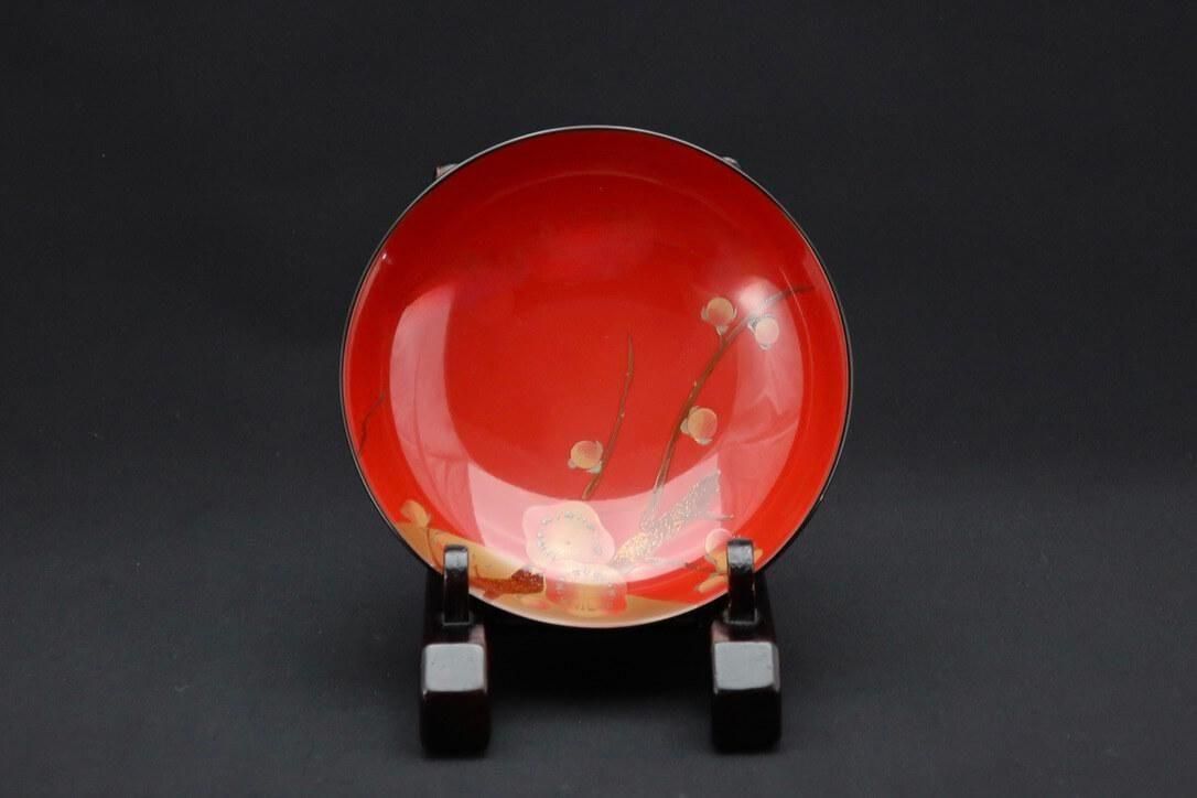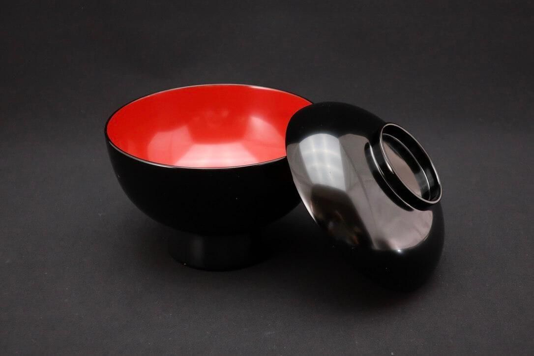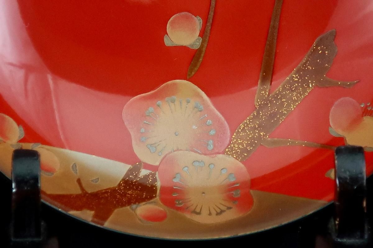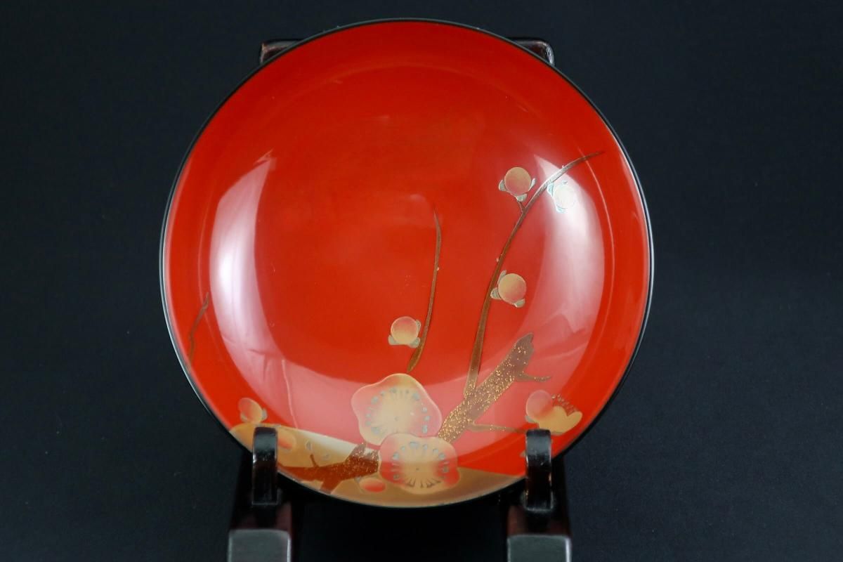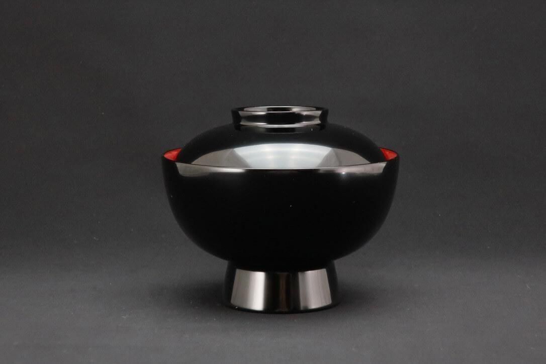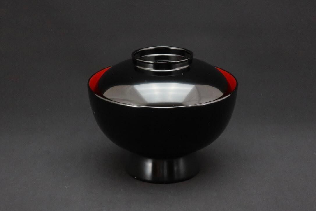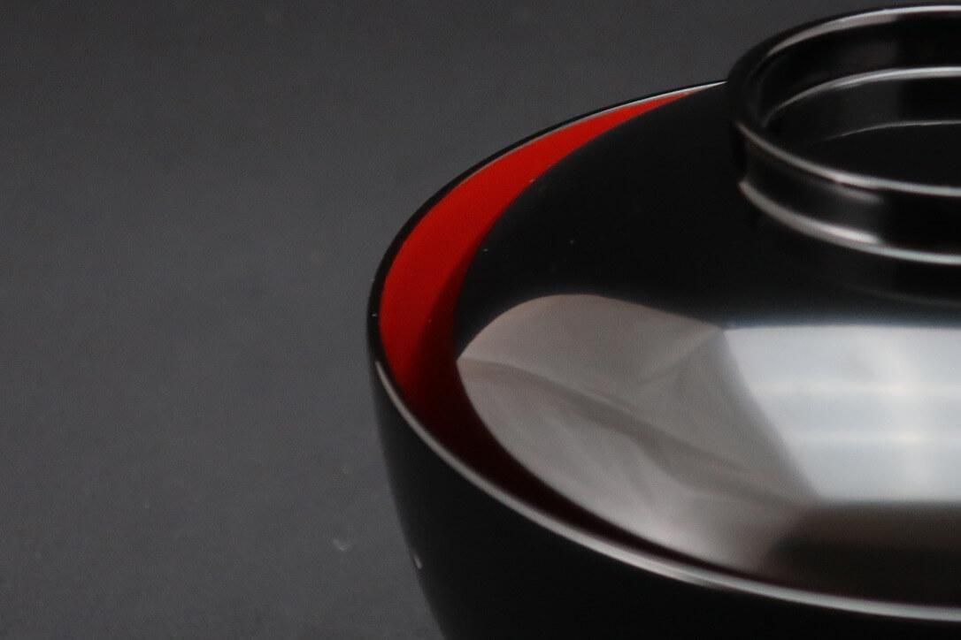 ☆輪島塗の「尚古堂」製の煮物椀。外側はシンプルでしっとりと落ち着いた黒塗、蓋を開けると可愛らしいひと枝の梅の蒔絵が見られます。高い高台があるデザインは格式高く見えるし、吸物椀より一回り大きい煮物椀はお雑煮にもぴったりです。