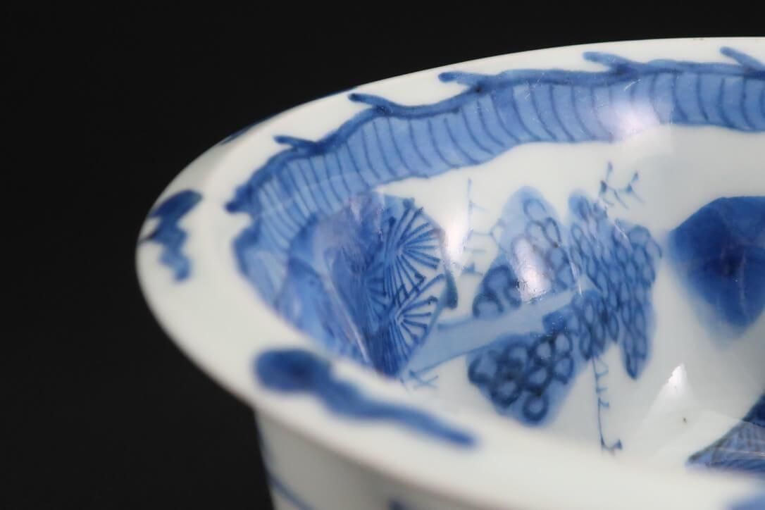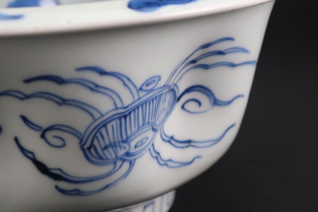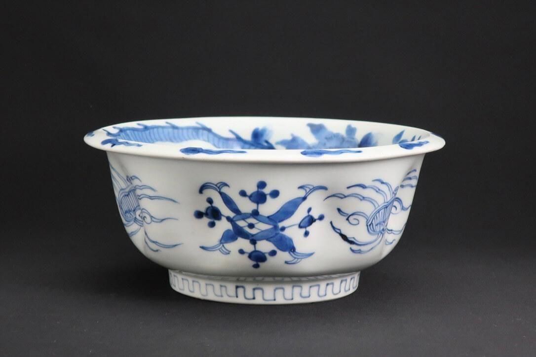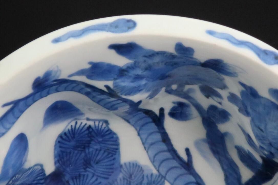 ☆ポコポコと凹凸があり持ちやすい形の染付鉢。絵柄も龍がいるかと思いきや、どうやら龍ではなかった様です。色紙の風景の図と牡丹の花、外側の絵付も楽しい毎日楽しめそうなサイズの大鉢をお楽しみください。