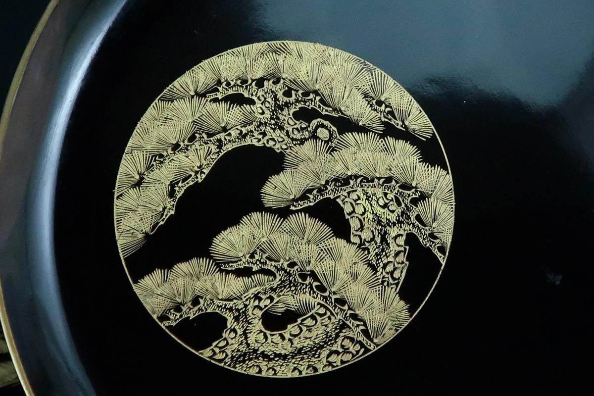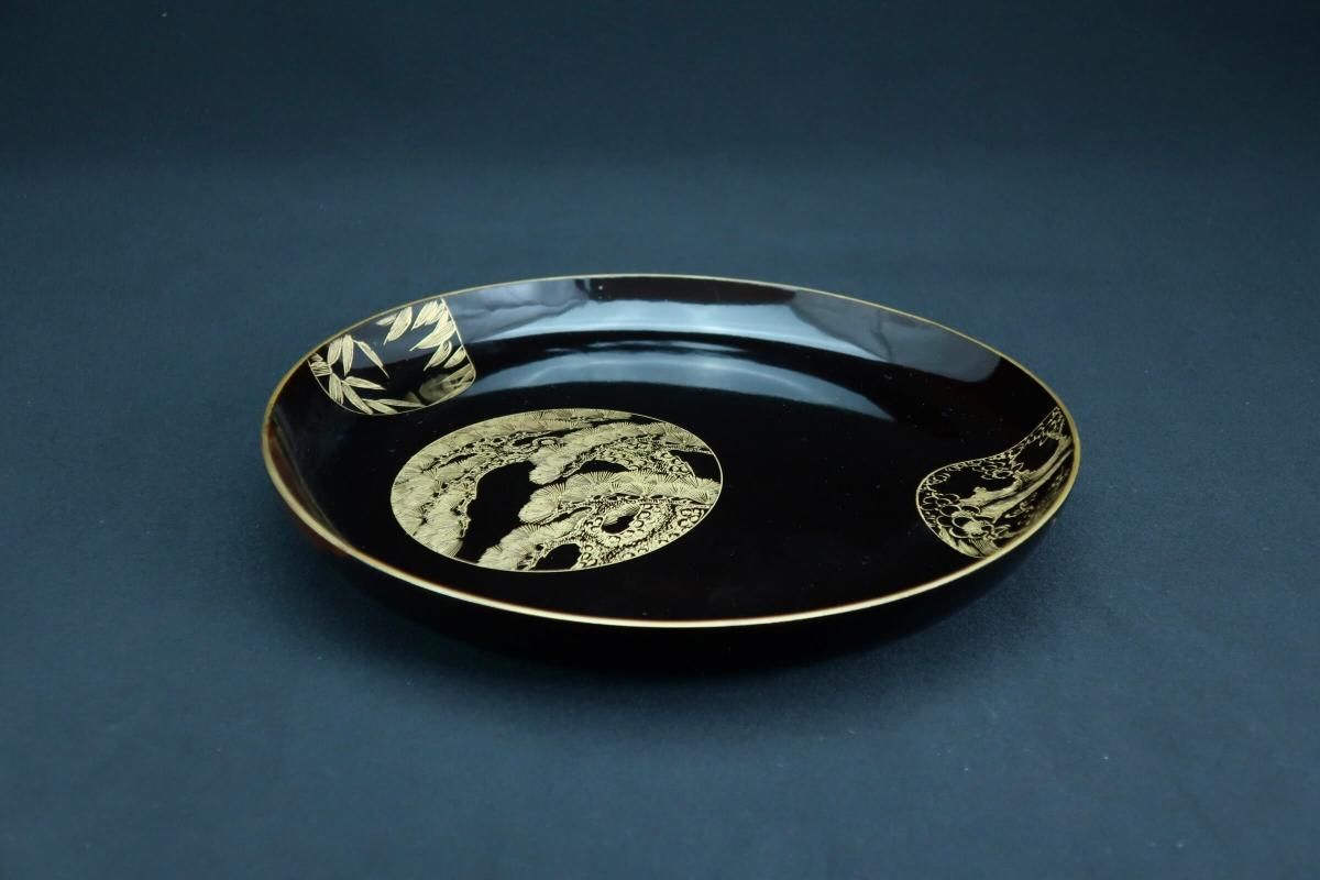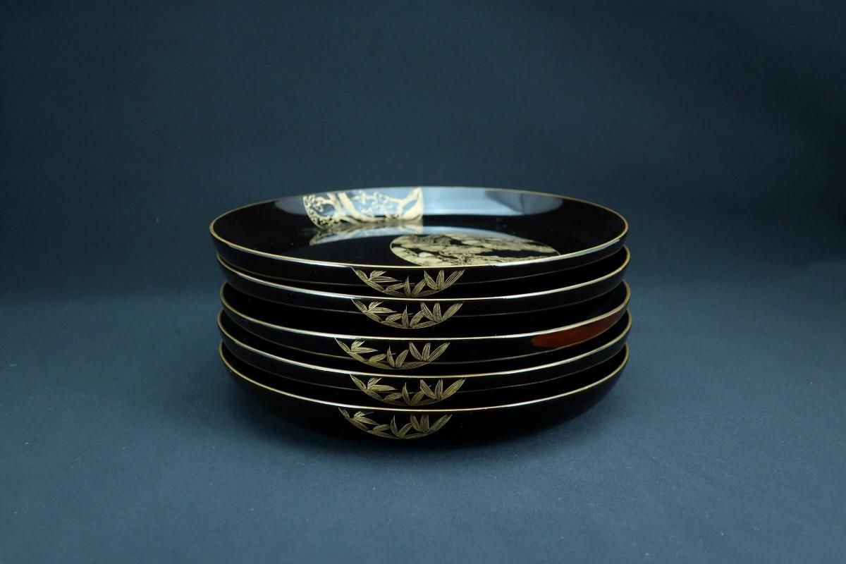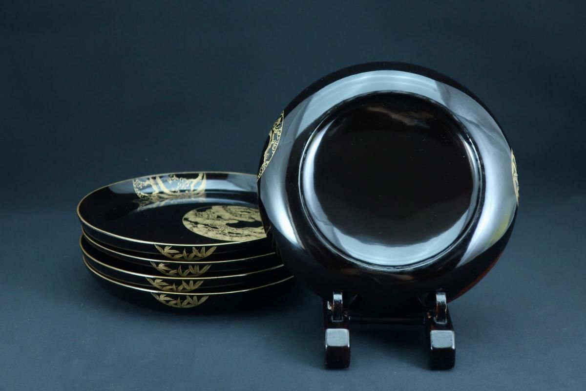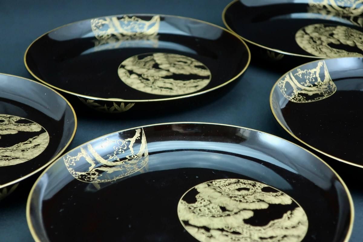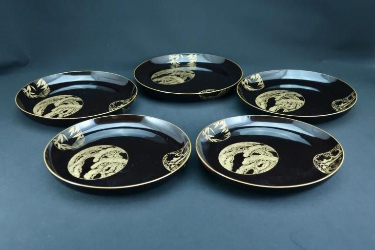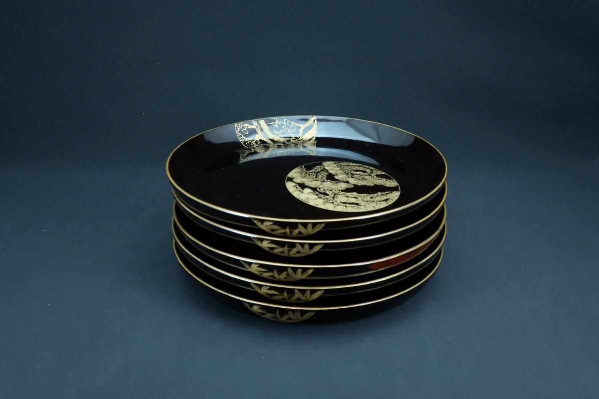 黒塗松竹梅沈金六寸皿 五枚組 / Black-lacquered Plates with 'Chinkin' picture set of 5
