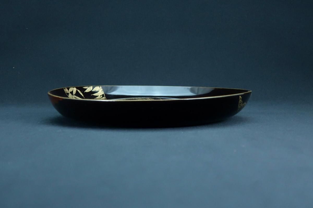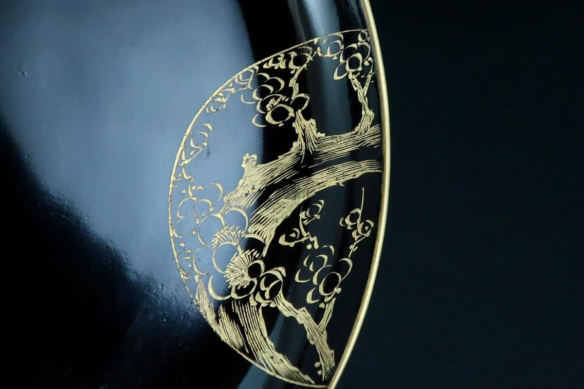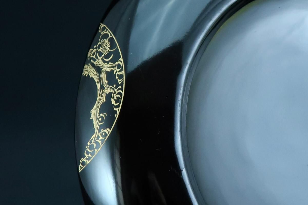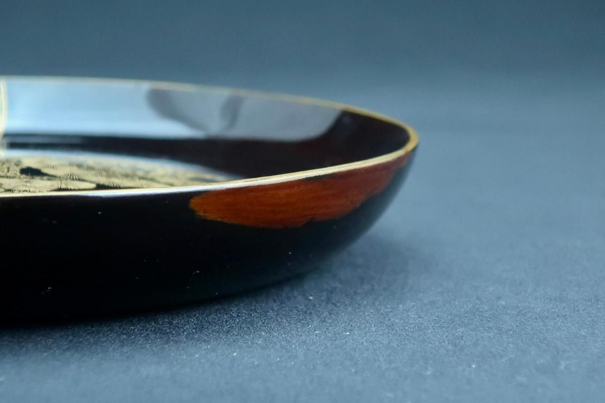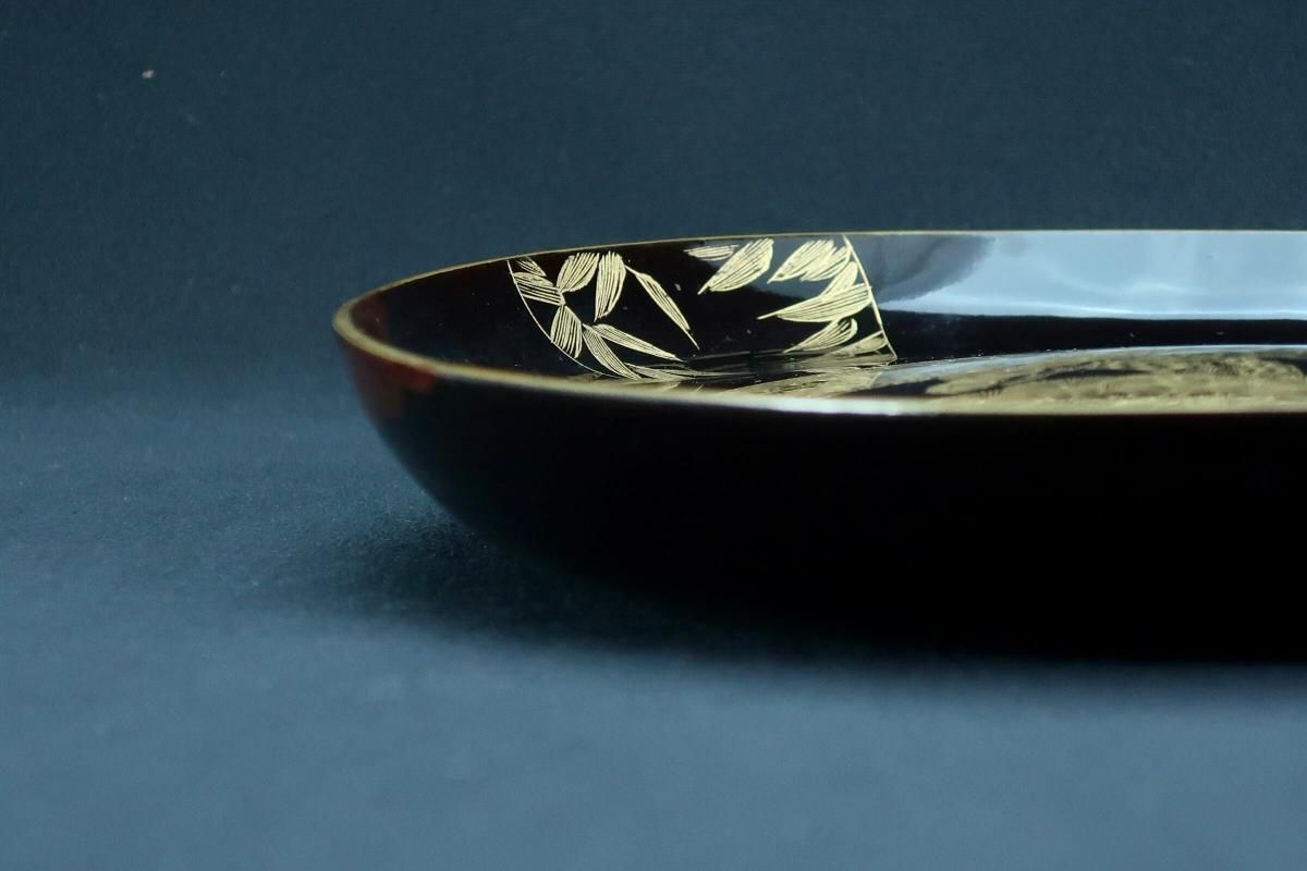 ☆繊細な沈金の装飾が美しい黒塗皿。シンプルな構図の沈金の装飾はモダンな雰囲気も漂います。ガラスとの相性も良いので洋のシーンでも幅広く楽しめそうです。