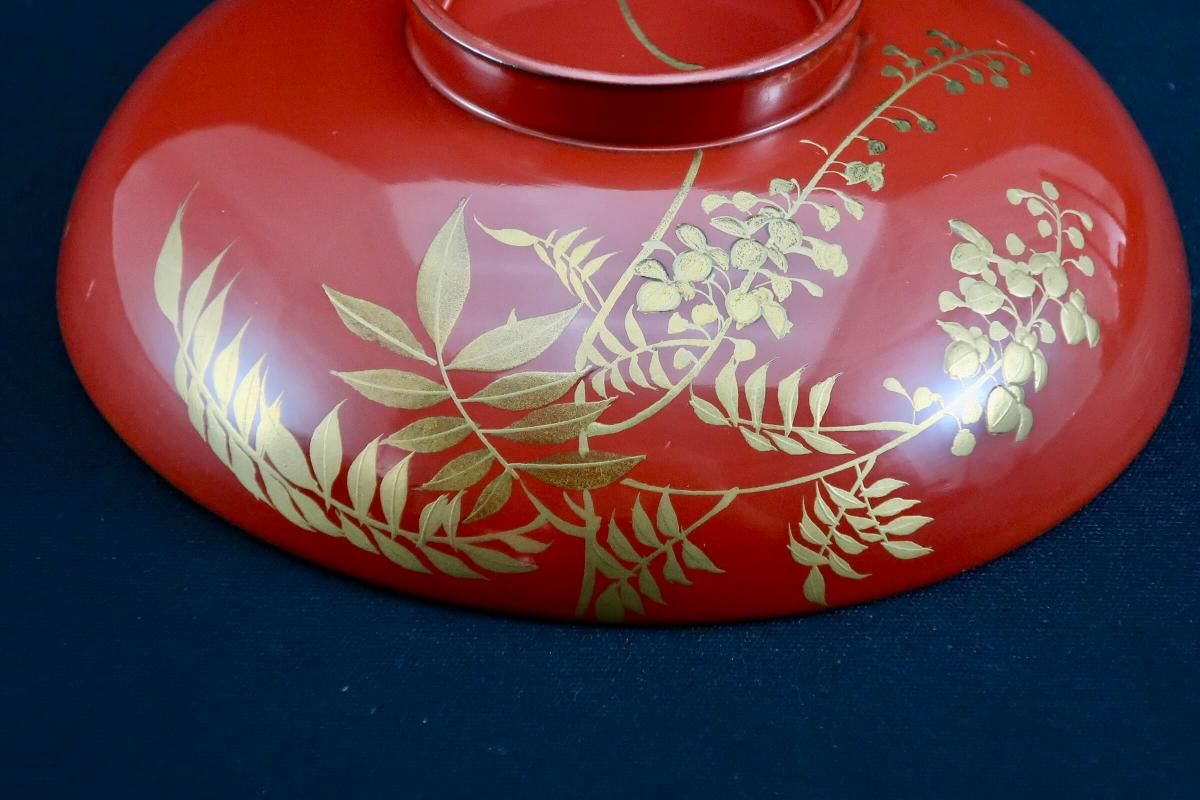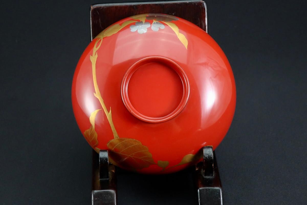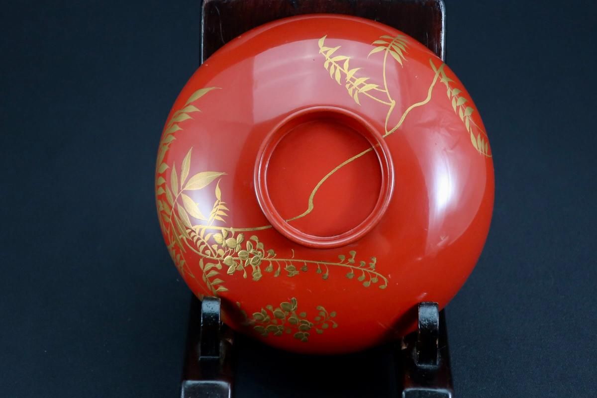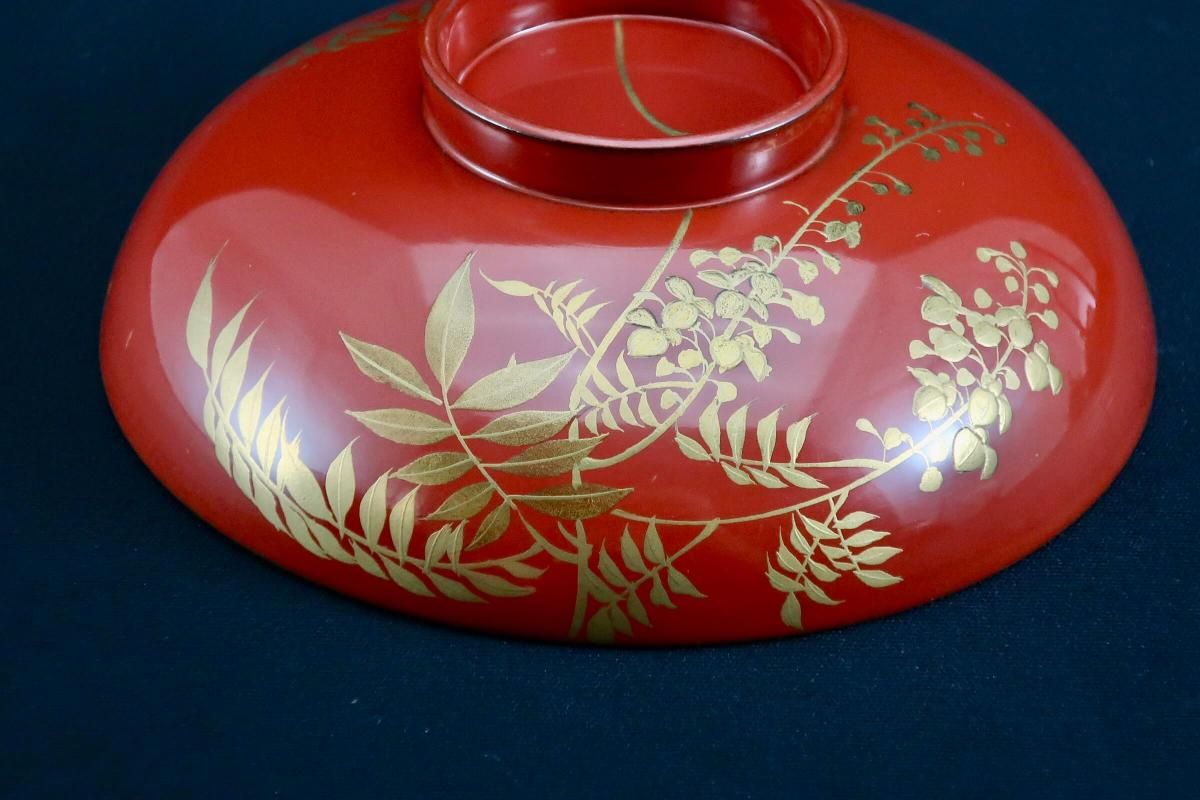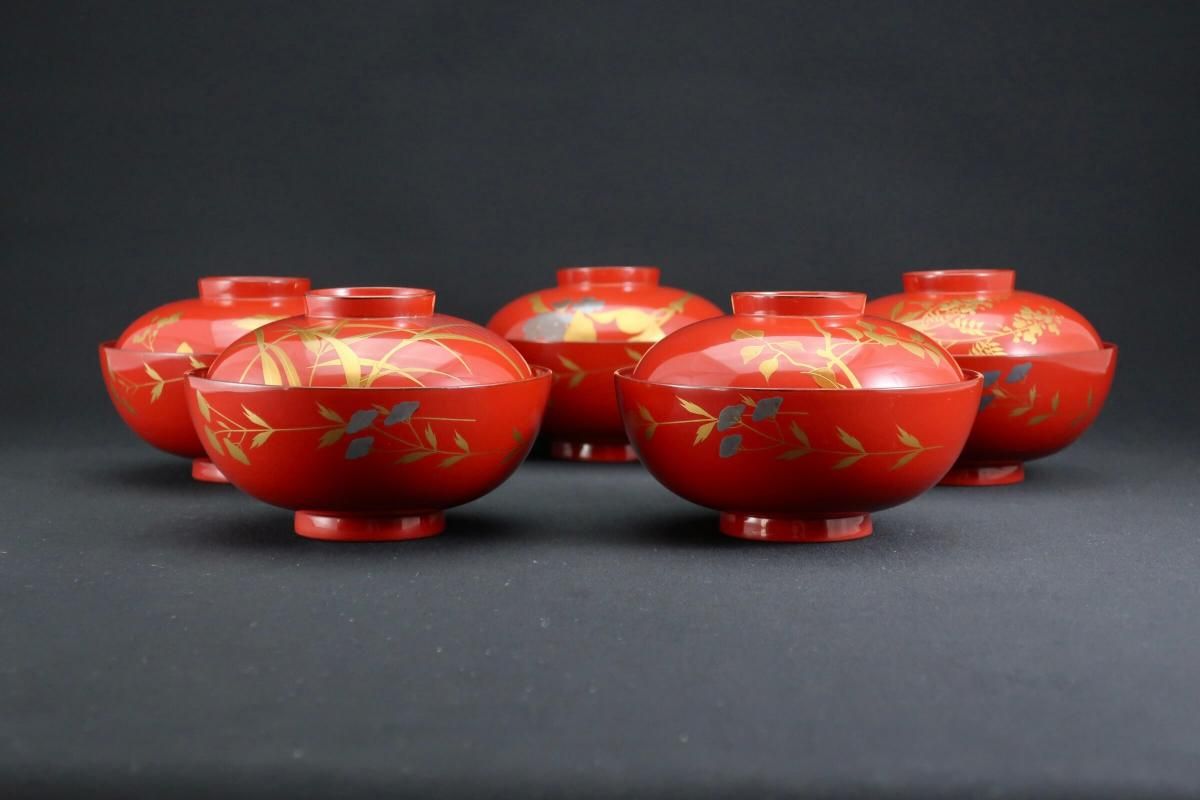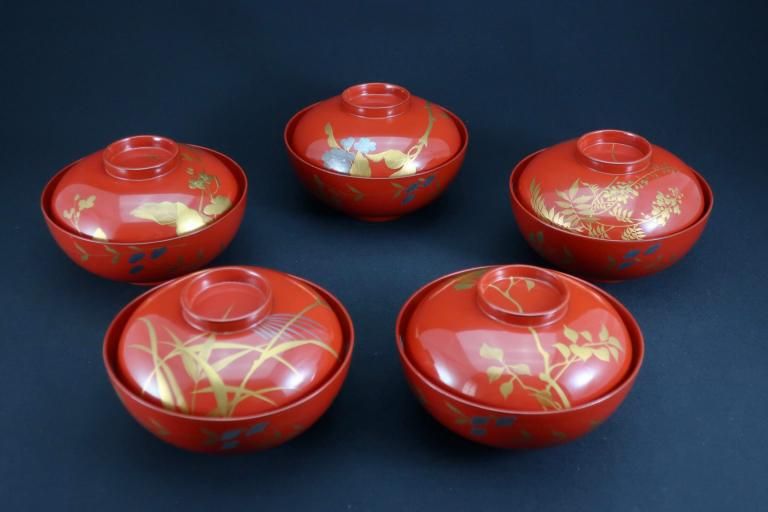 朱塗図変秋草蒔絵吸物椀 五客組 / Red-lacquered Soup Bowls & Lids with Makie picture of Autumn plants set of 5