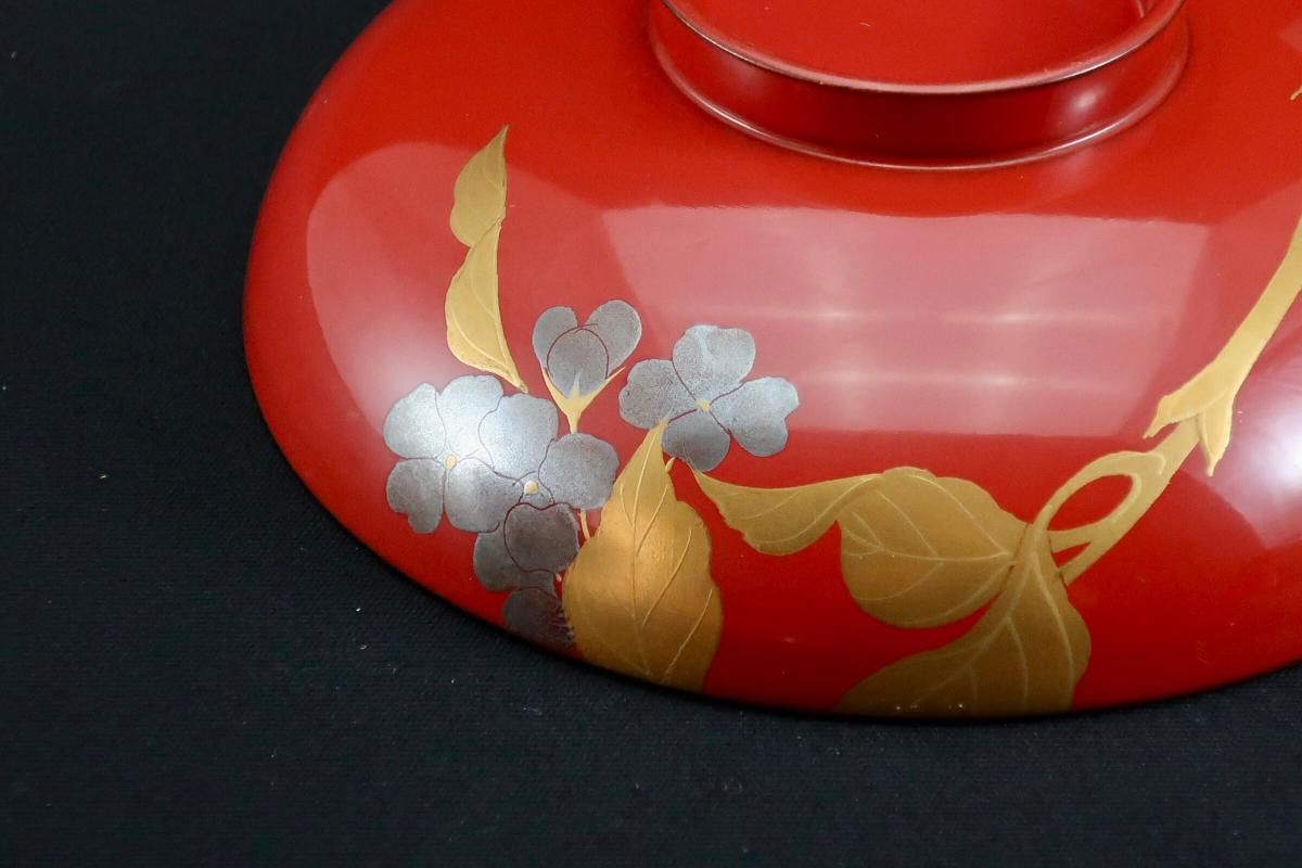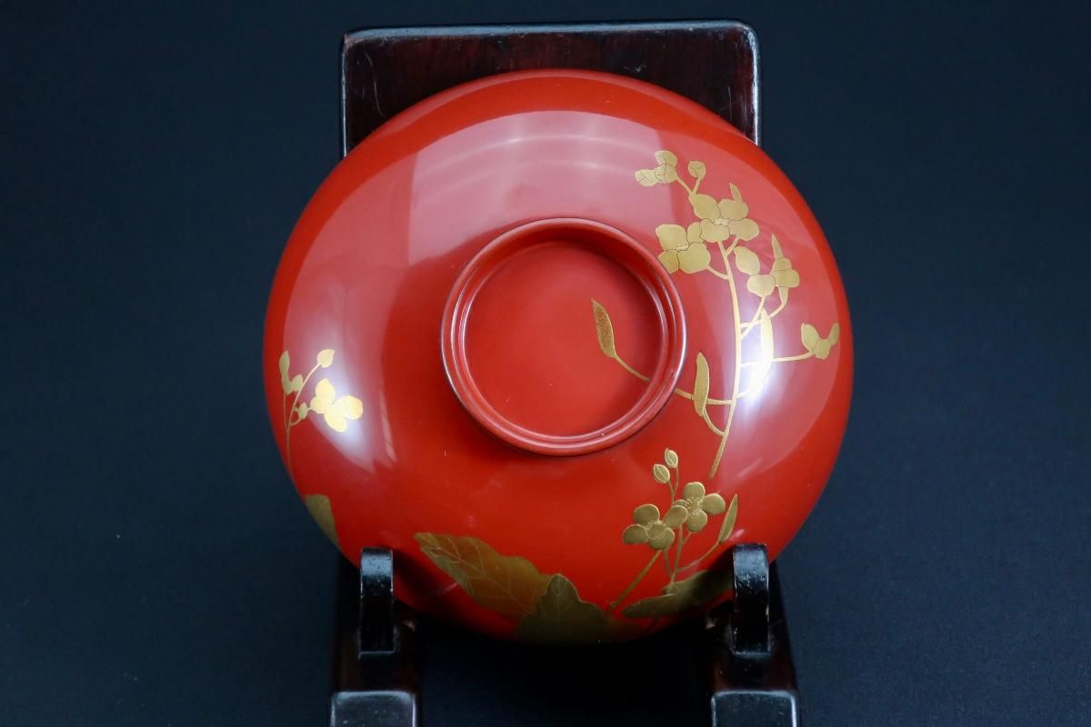 ☆黒塗のお膳をお持ちの方にぜひオススメしたい朱塗椀。美しい五種の花々の金蒔絵が施された見事なお椀です。使う時期は限定されますが、その季節ぴったりの器を使う楽しさは格別。おもてなし時にもきっと喜ばれることでしょう。日本人の季節を楽しむ感覚を受け継いでいきたいですね。