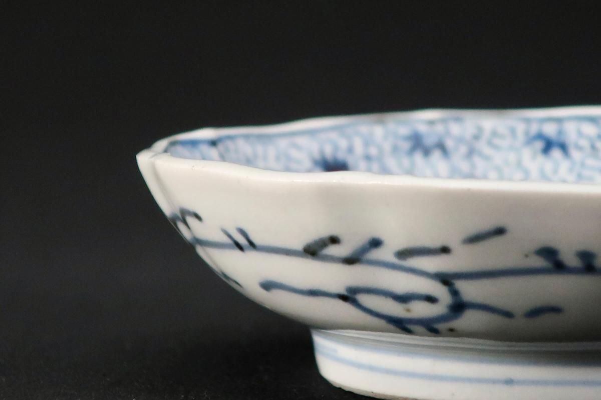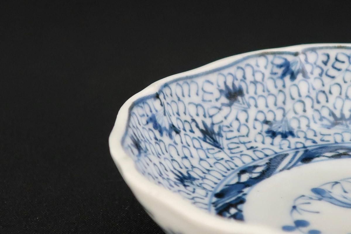 ☆細々とした微塵唐草文が可愛らしい小皿。小さな葉っぱも少し加わってちょっぴり華やかに。古伊万里らしい素朴な魅力がお好みの方へ。