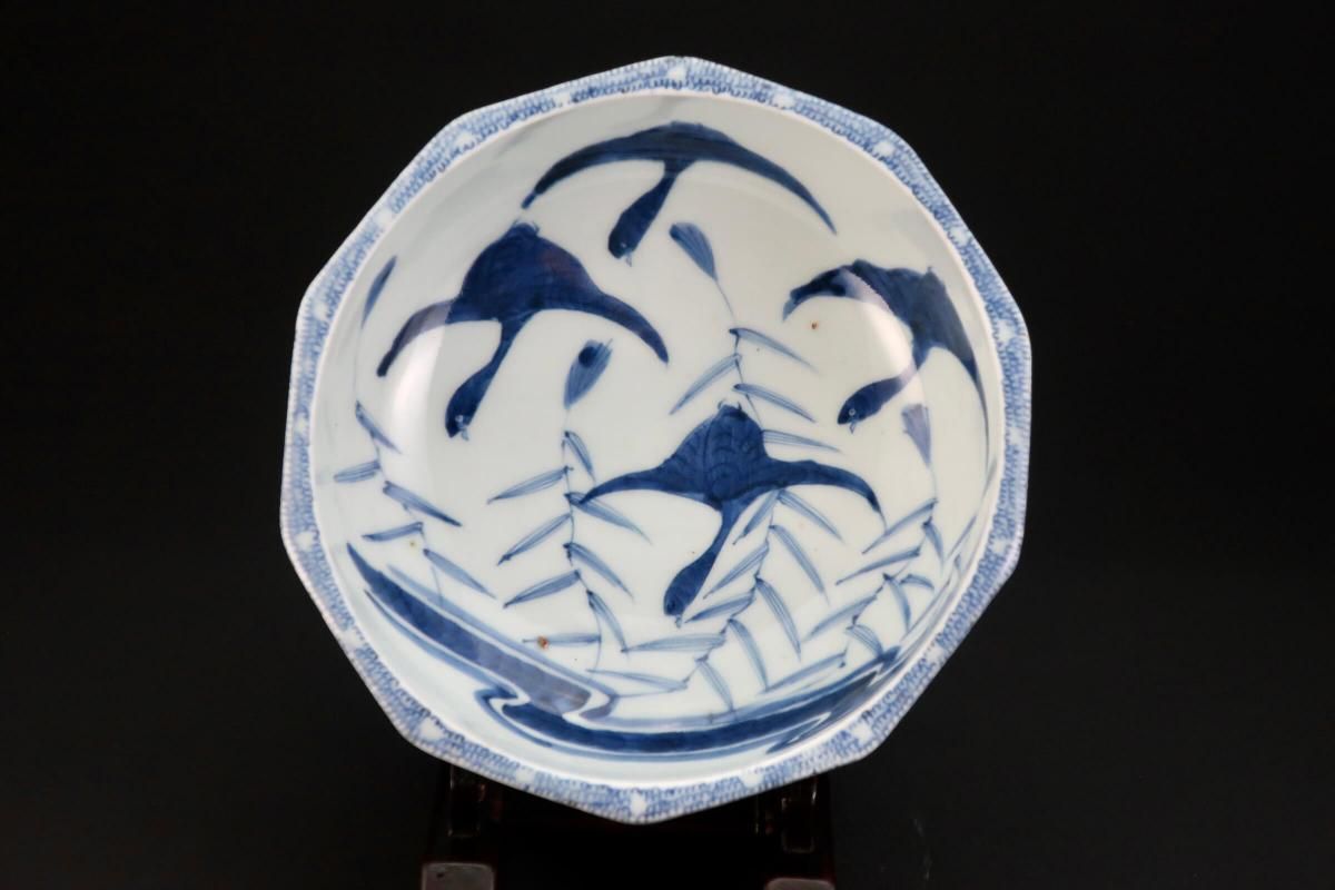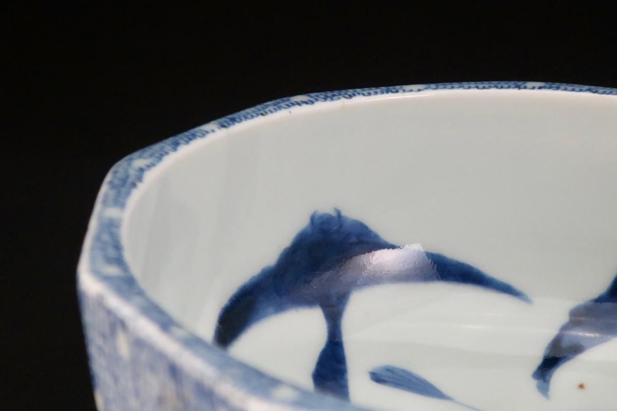 ☆珍しいデザインの鉢が入荷しました! 十角形で外側は微塵唐草文様、そして内側の図は雁でしょうか。高台がやや高めなので華やかな印象です。