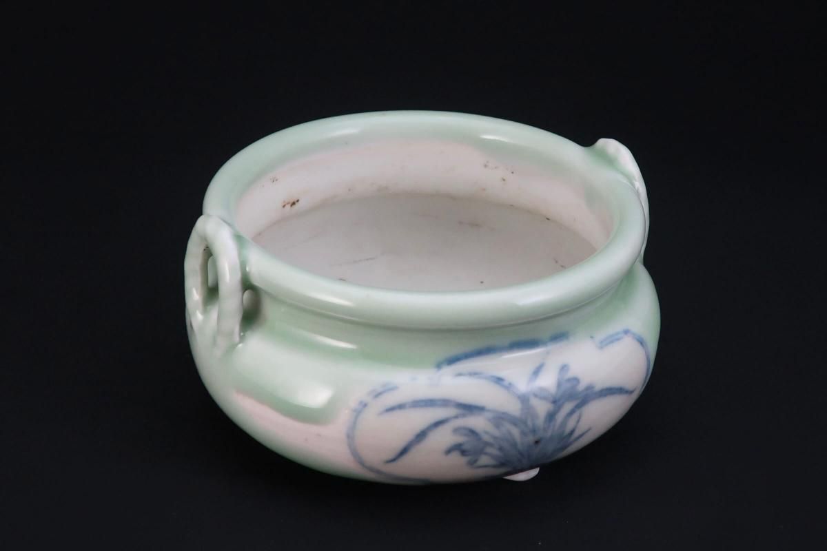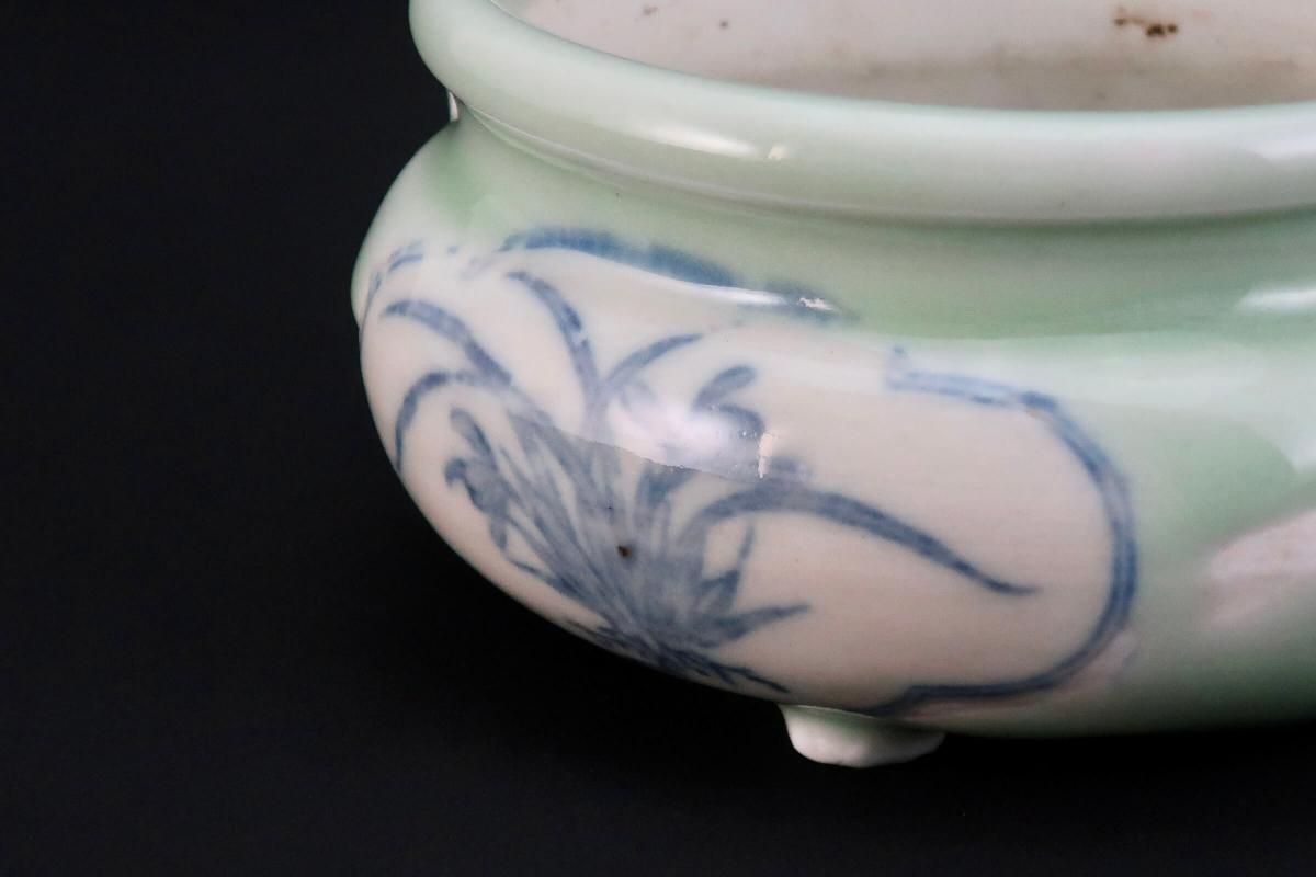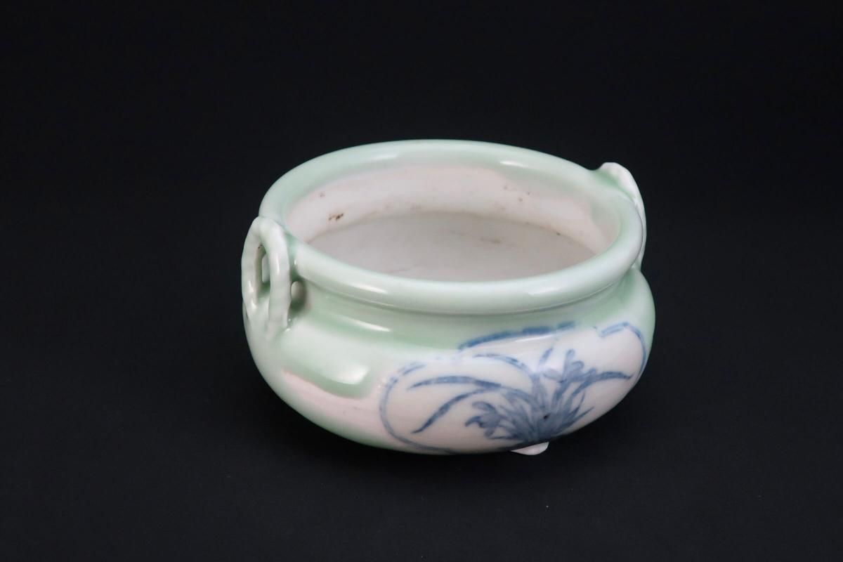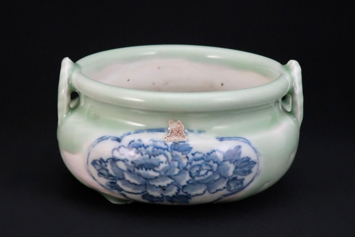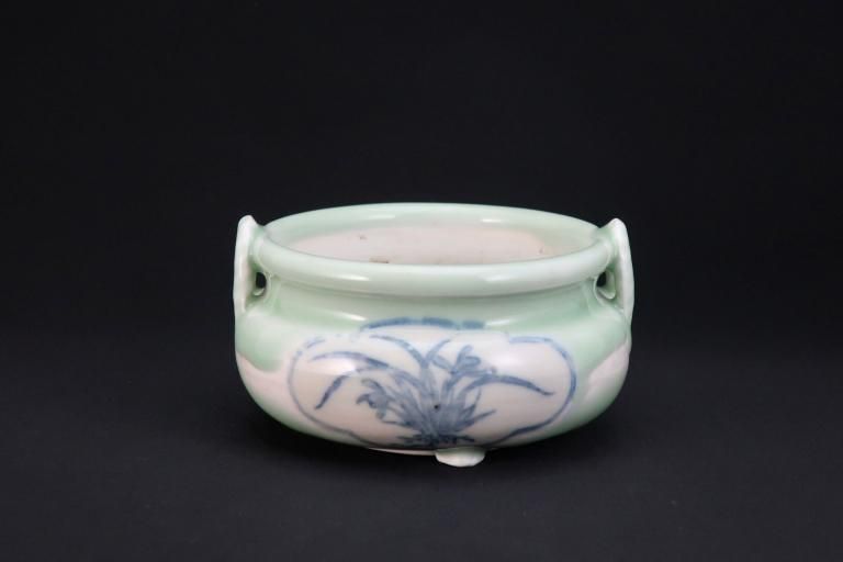 青磁染付牡丹紫蘭文火入 / Celadon Blue & White 'Hiire' Pot with the picture of Peony and Orchid Flowers