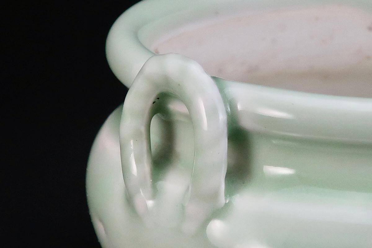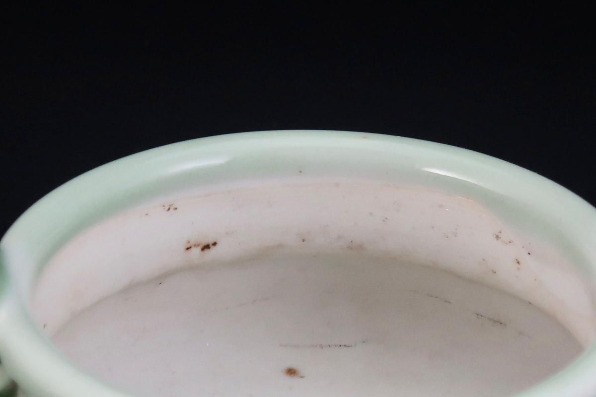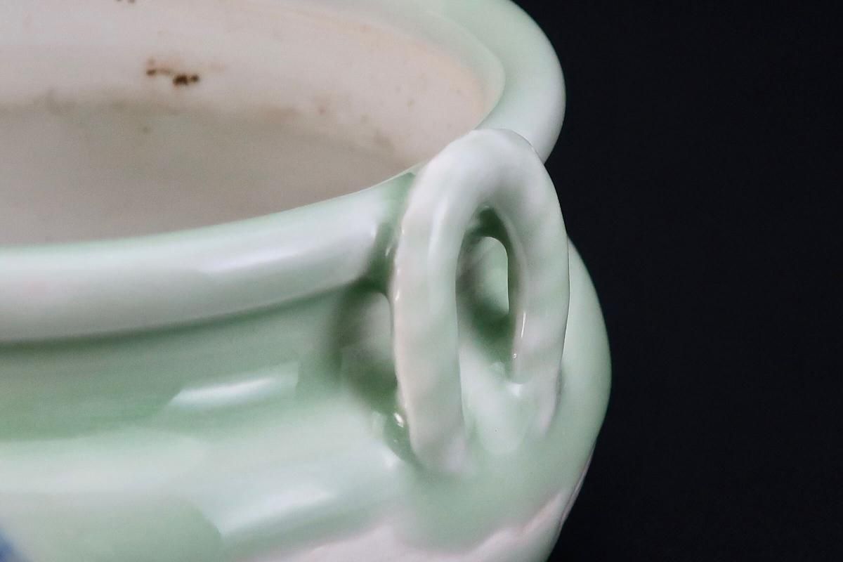 ☆爽やかな青磁色と凝ったつくりが魅力の火入。印判の牡丹と紫蘭の絵付が良いアクセントになっています。小さな鉢植えを入れたら魅力倍増しそうです♫