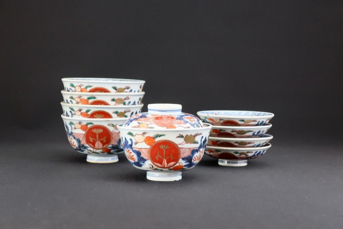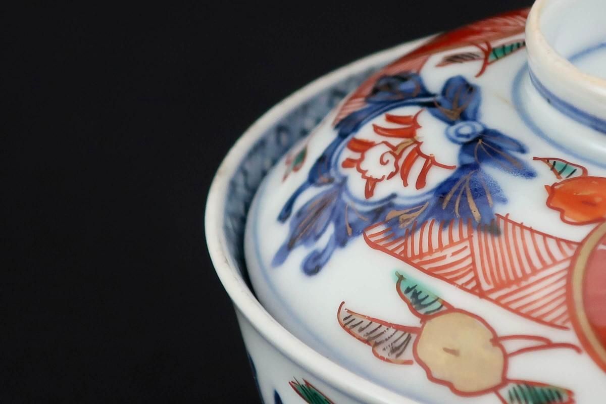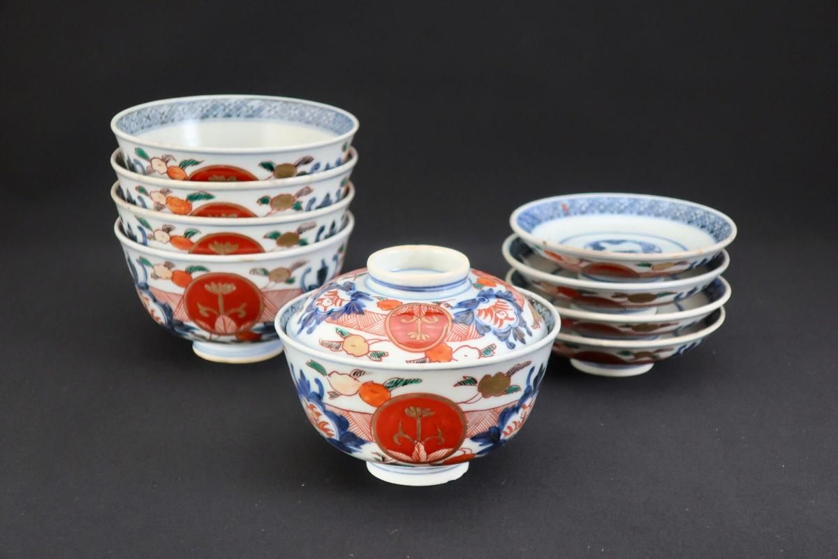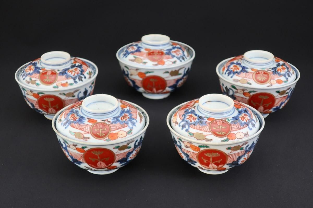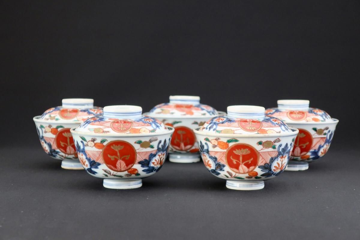 伊万里色絵赤玉草花文蓋茶碗 五客組 / Imari Polychrome Bowls with Lids set of 5