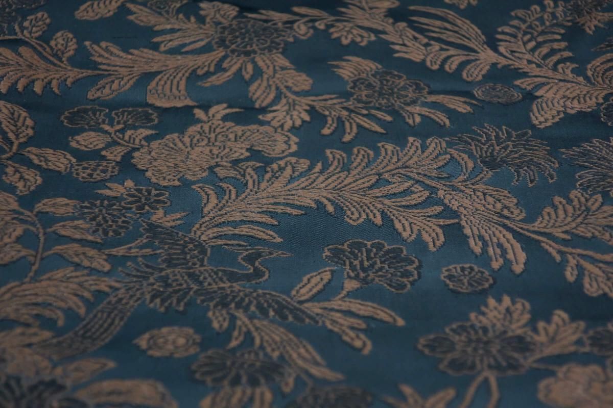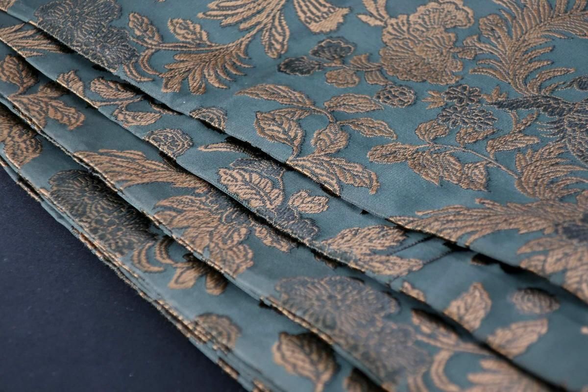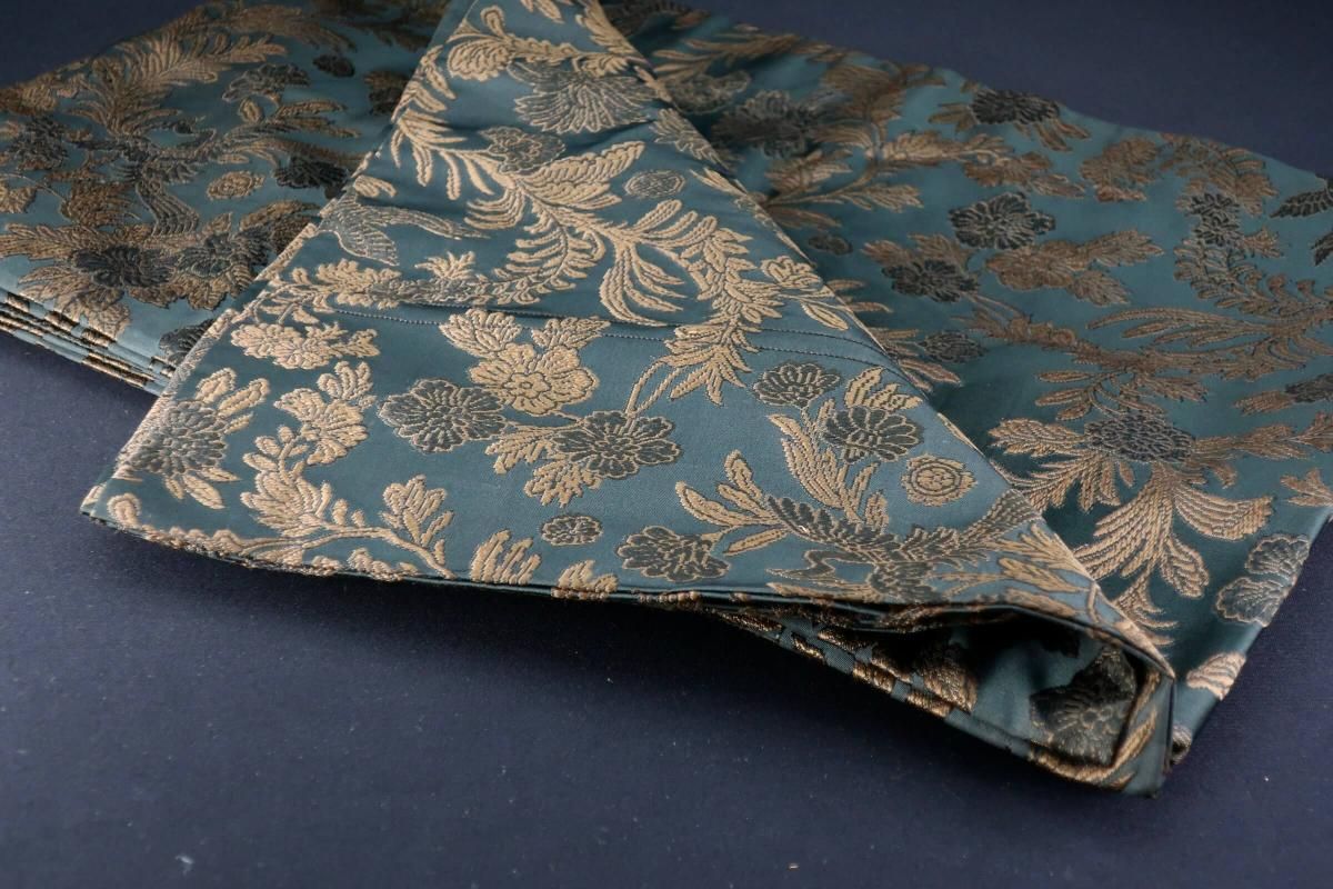 ☆帯芯入っていないのかとても柔らかい丸帯。ほぼ未着用かと思われます。深いグリーンに渋く光る茶と黒の花模様が入ったシックでとても綺麗な帯はランナーにオススメ。きっと一緒に飾るものを美しく見せてくれます。