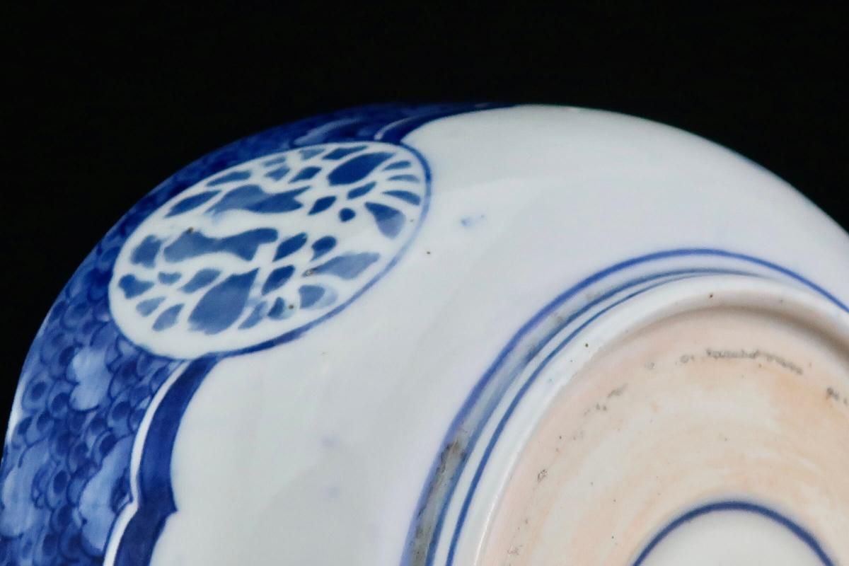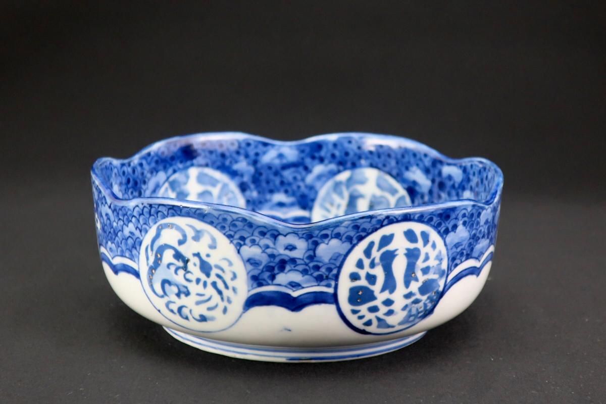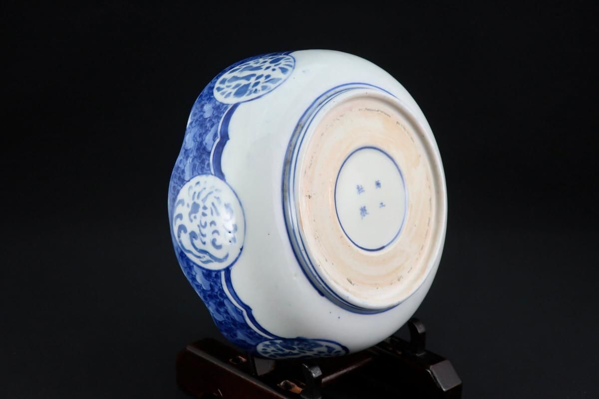 ☆有田の窯元が集まって作った「励工社」銘の染付鉢。裏底に書かれています。丸で囲まれた龍と鳳凰は印判、他は手描きで描かれた珍しい技法と珍しい形が魅力的な鉢です。
