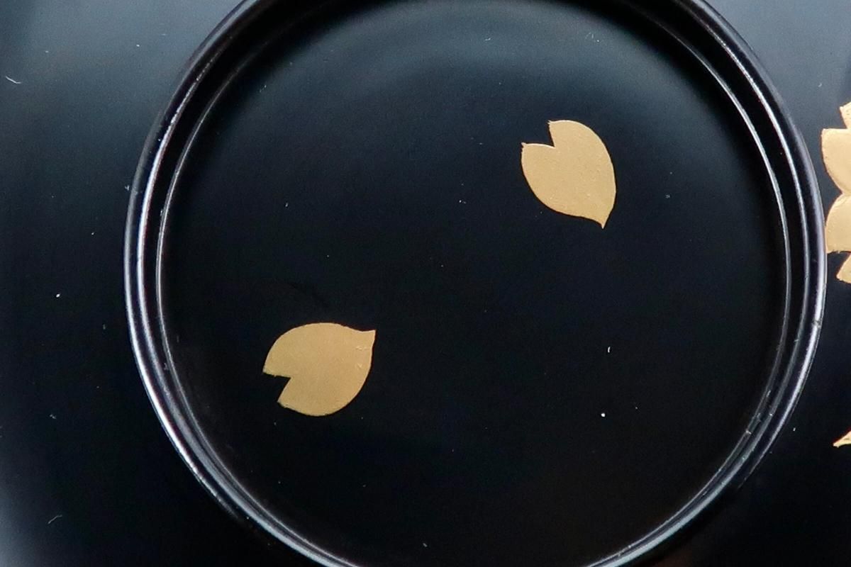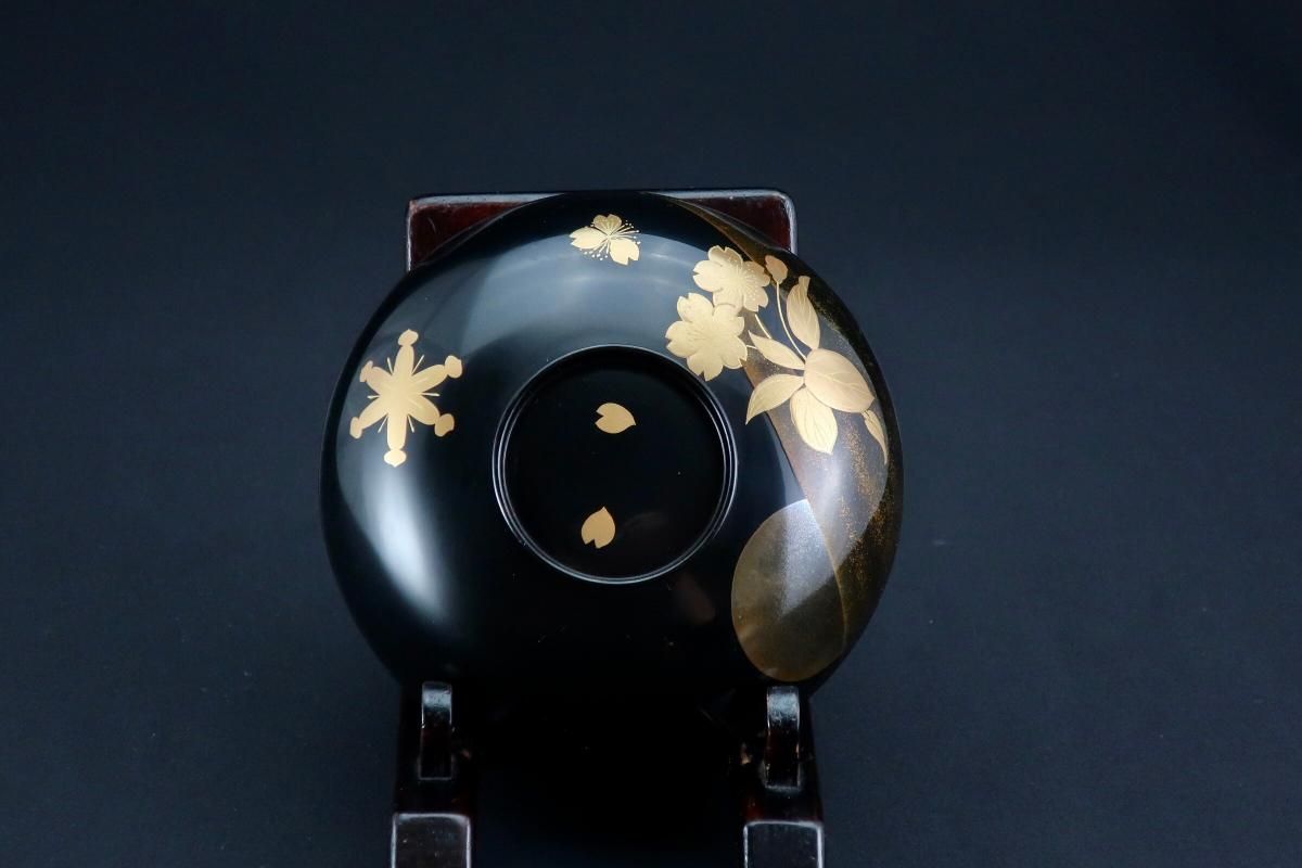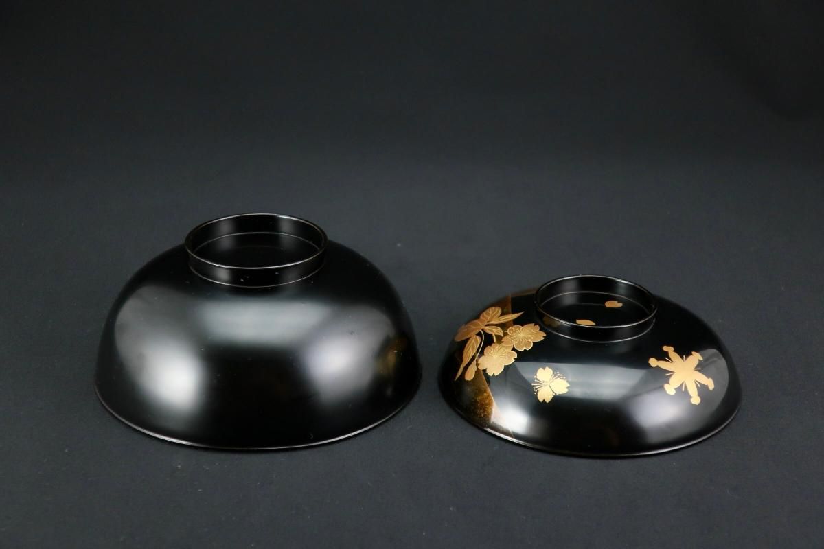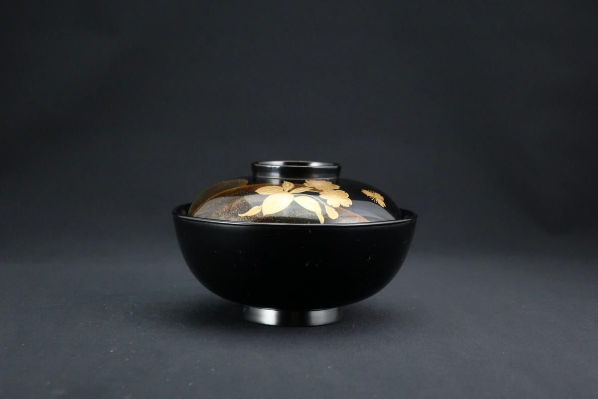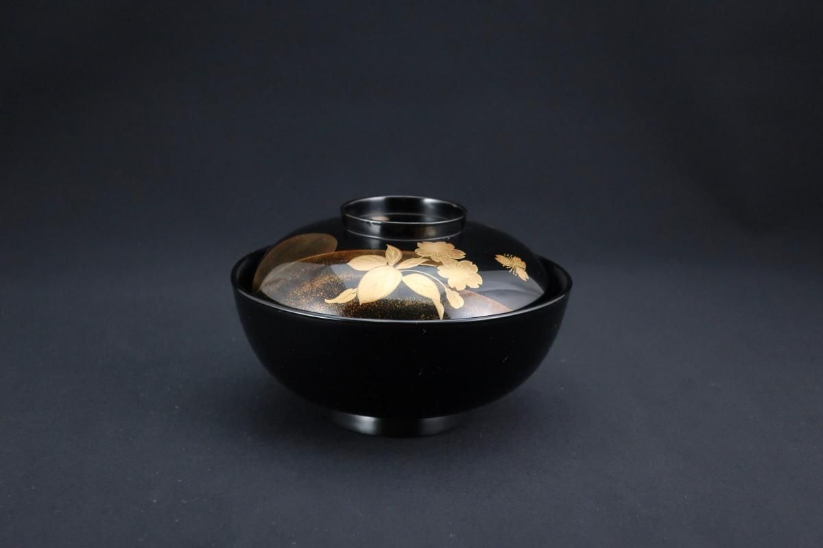 輪島塗桜若松月蒔絵吸物椀 五客組 / Black-lacquered Soup Bowls with Lids with Sakura picture set of 5