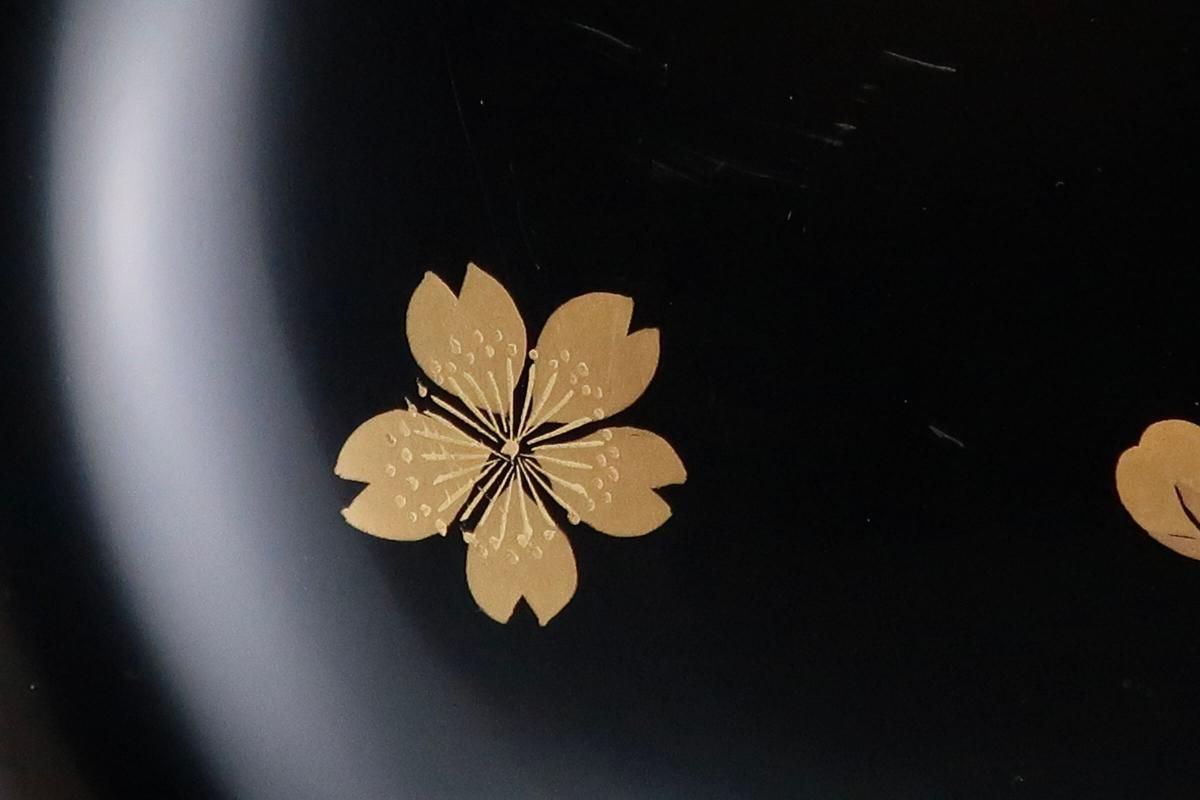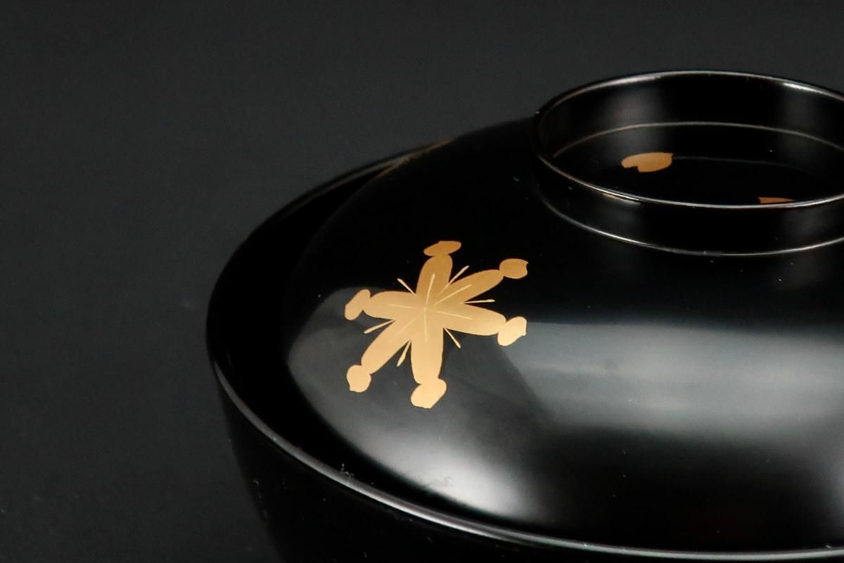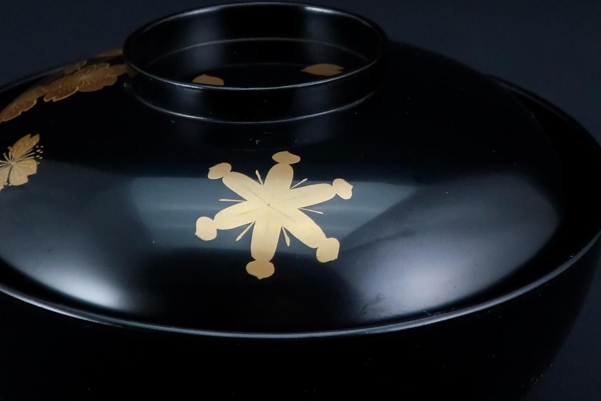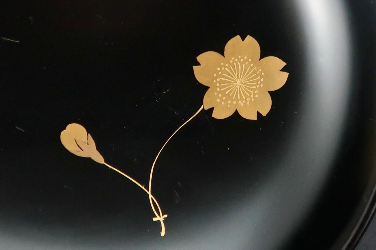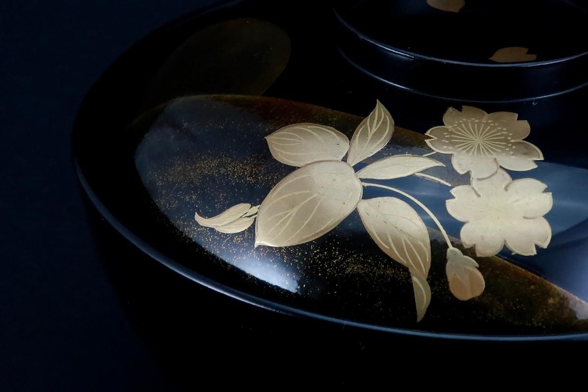 輪島塗桜若松月蒔絵吸物椀 五客組 / Black-lacquered Soup Bowls with Lids with Sakura picture set of 5