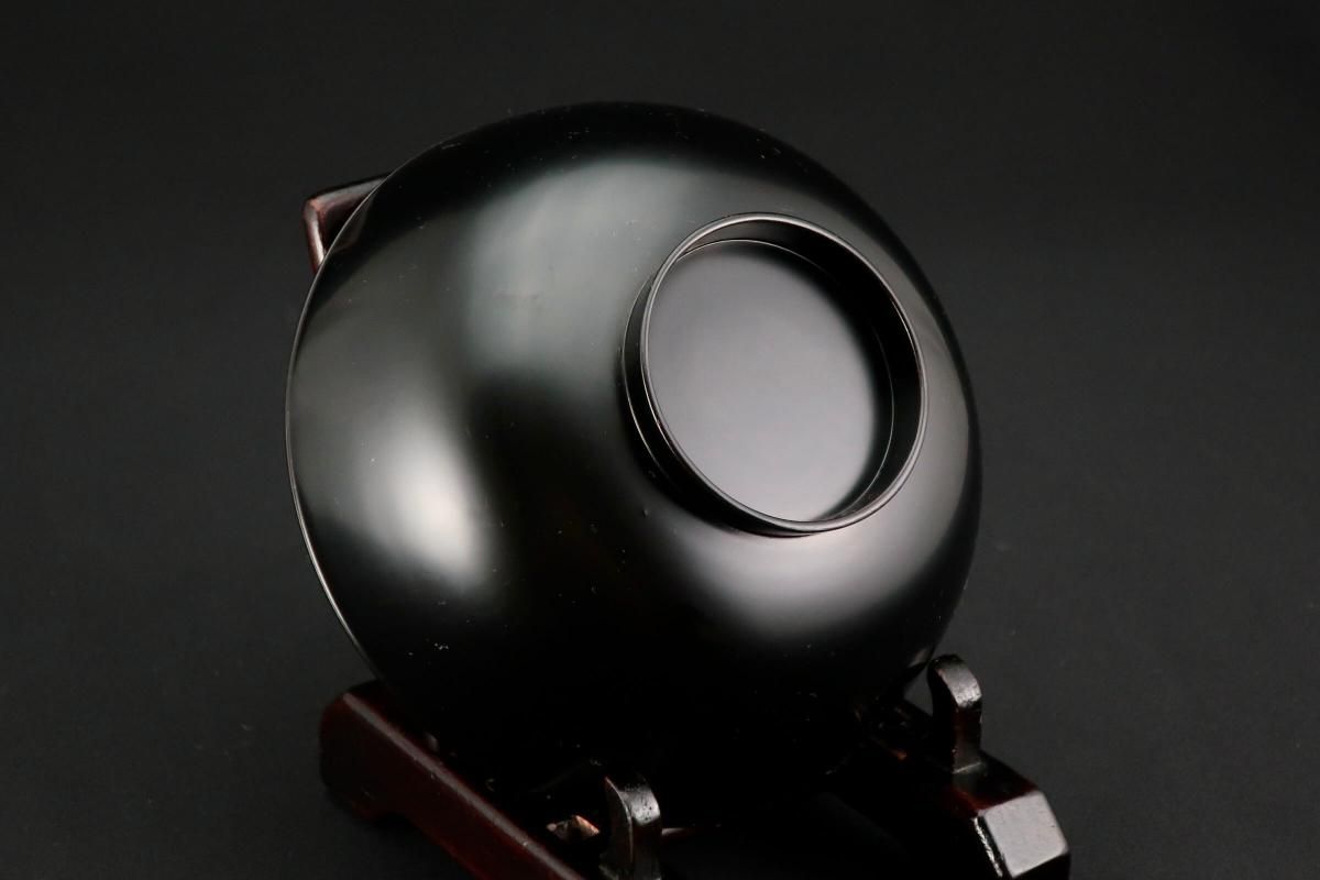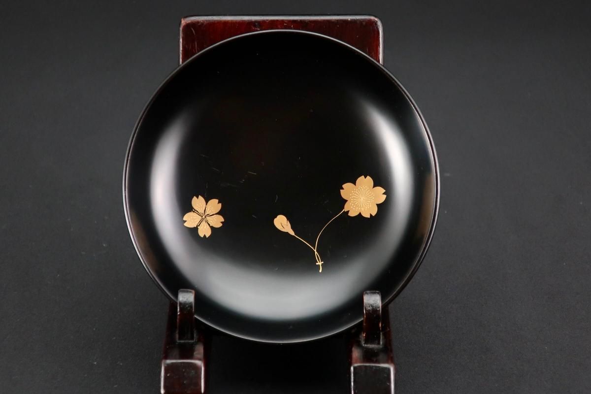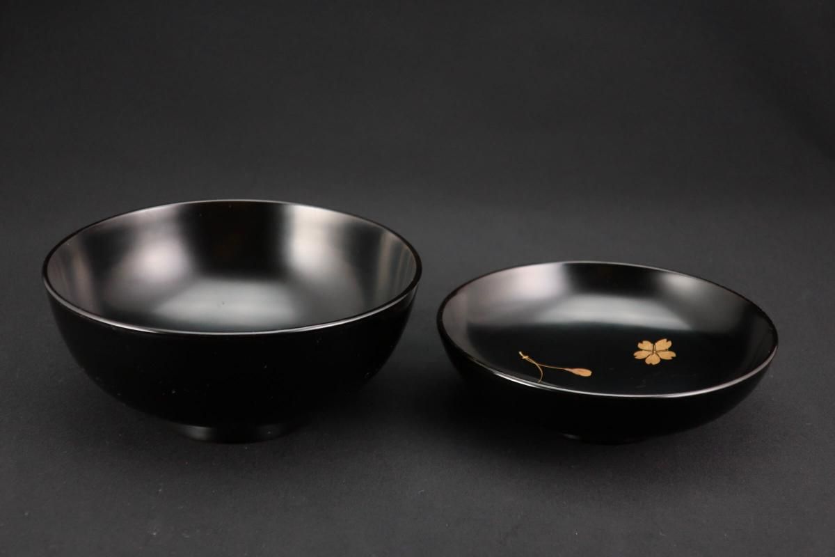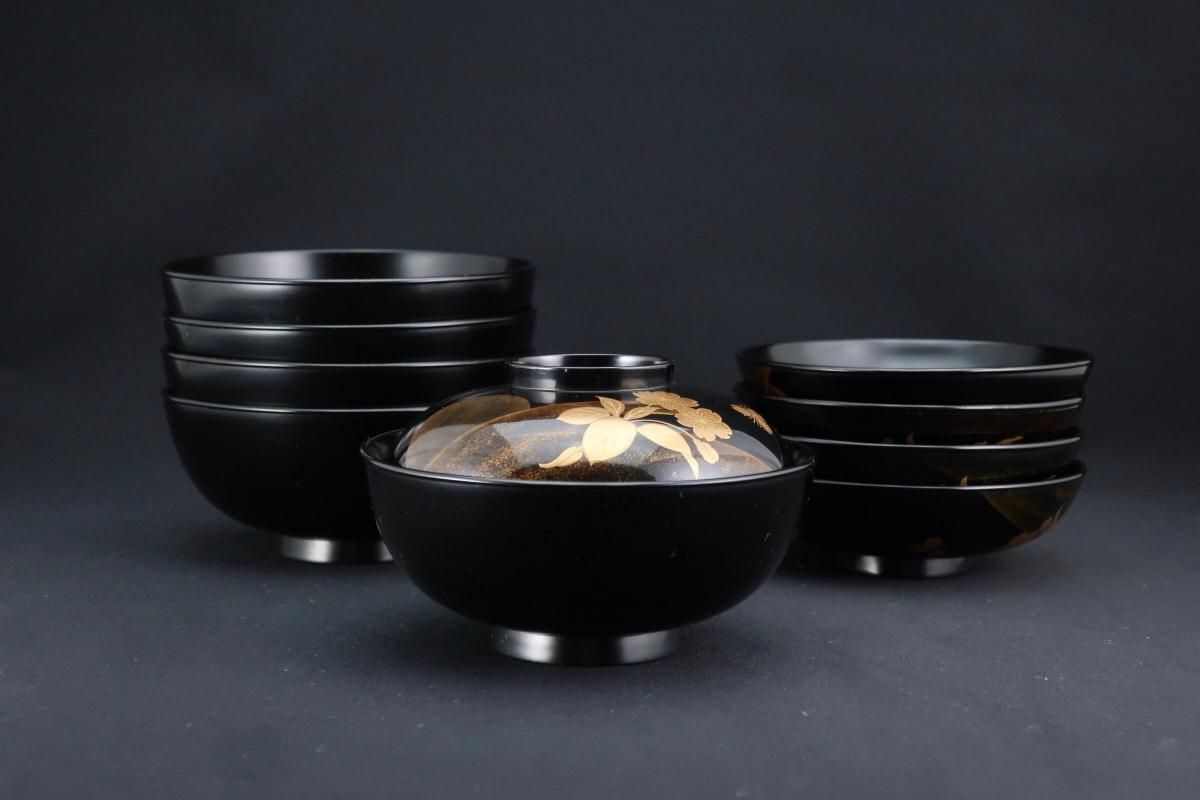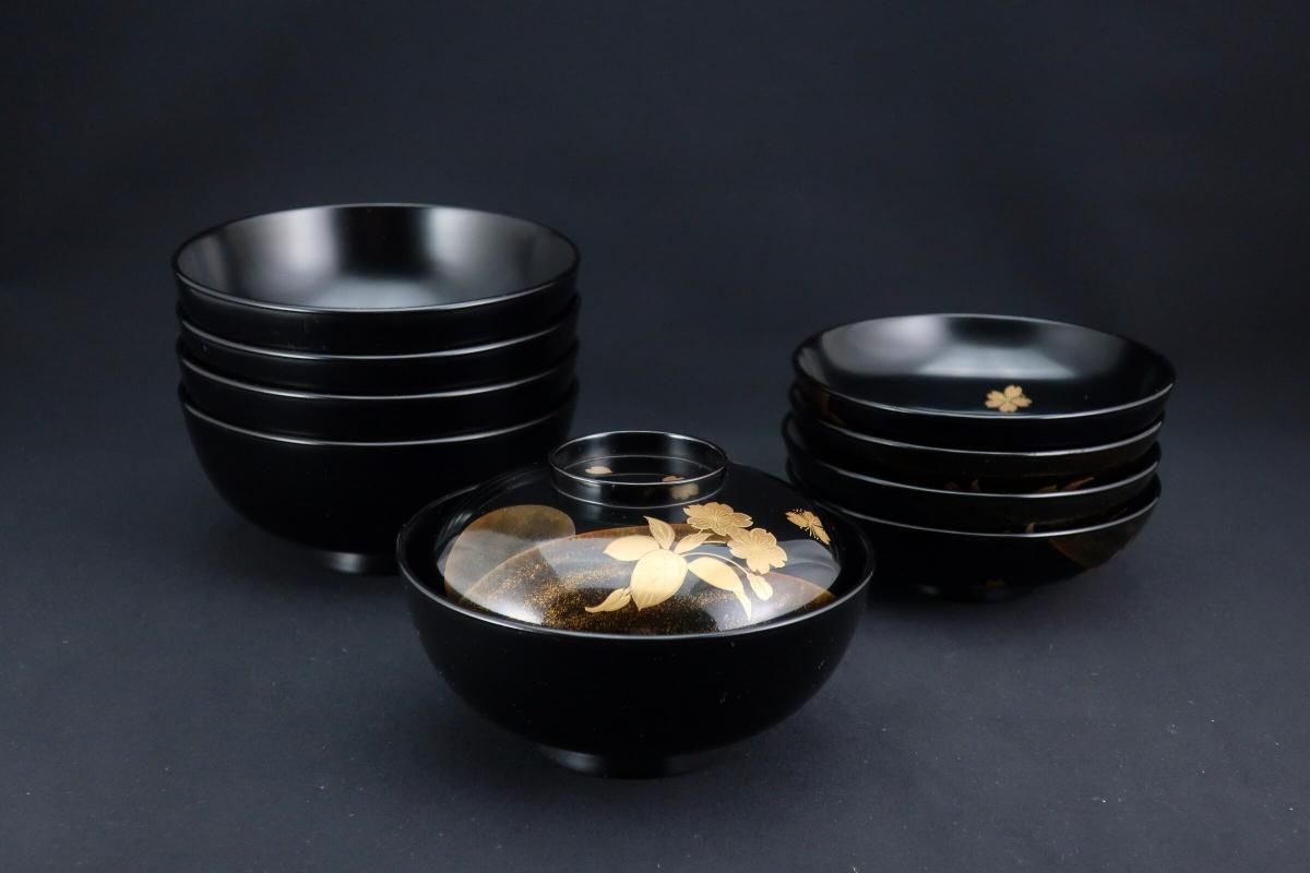 輪島塗桜若松月蒔絵吸物椀 五客組 / Black-lacquered Soup Bowls with Lids with Sakura picture set of 5